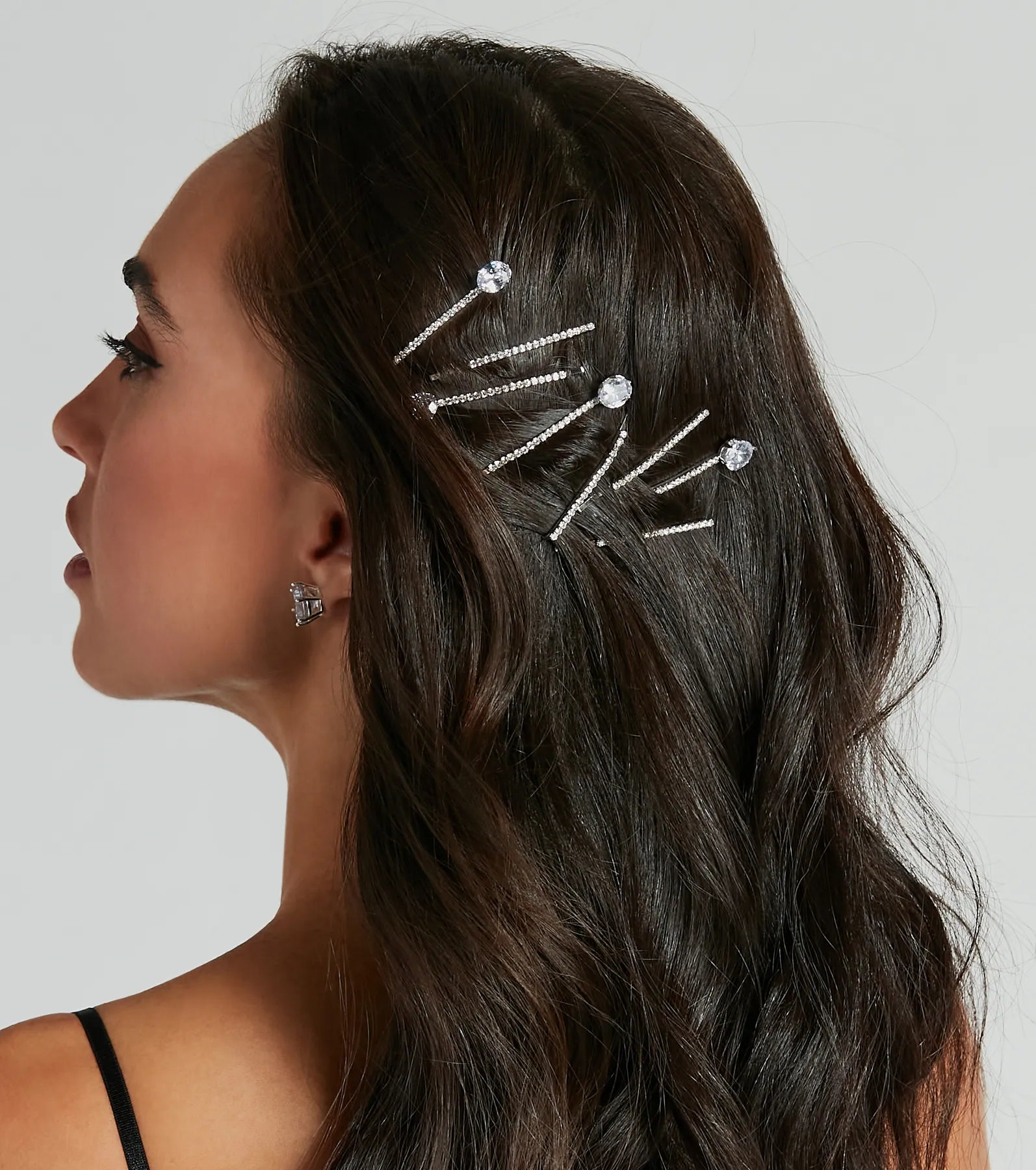 Express your glamorous side elevating your look with this eight-pack of hair pins!?This luxurious set includes eight exquisite hair pins. each adorned with dazzling rhinestones in unique and elegant designs. Complete the look with statement for a special occasion!