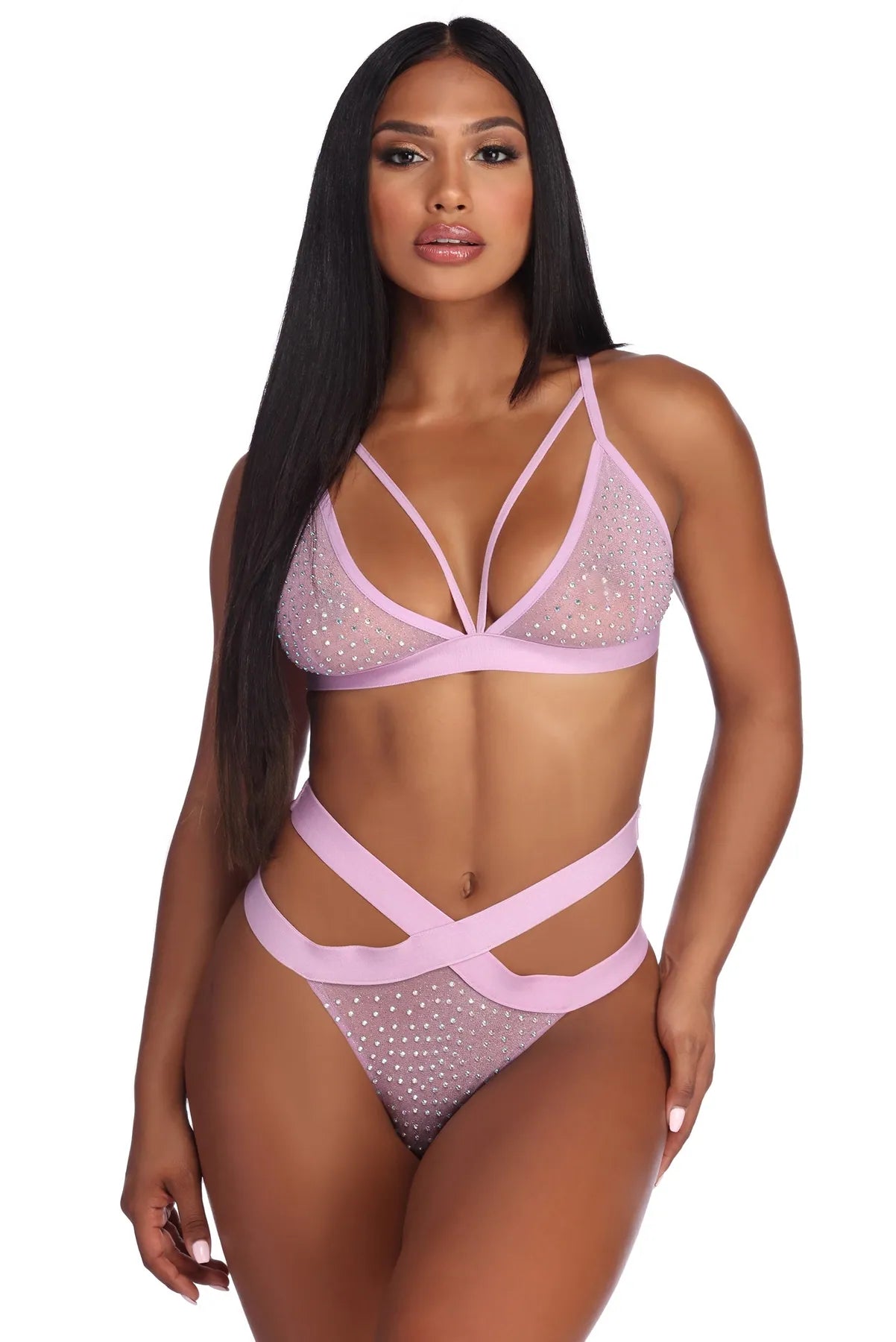 Make hearts burst in this seductive bralette and panty set. Top features a plunging V neckline with strap detailing. adjustable straps. and a hook and eye closure. Bottoms feature double elastic waistbands and a very cheeky bottom. Composed of a glitter-dusted mesh fabric embellished with rhinestones.