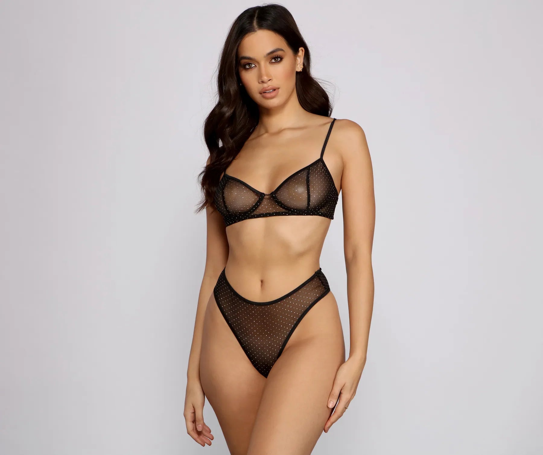 Keep it glam and sultry with a bra and panty set that turns up the heat. The set features an unlined mesh bra with a glitter dot pattern. vertical seams at the bust. and adjustable spaghetti straps. The matching unlined panty features a high rise waist and a thong bottom. Complete your look with a sheer mesh robe.?