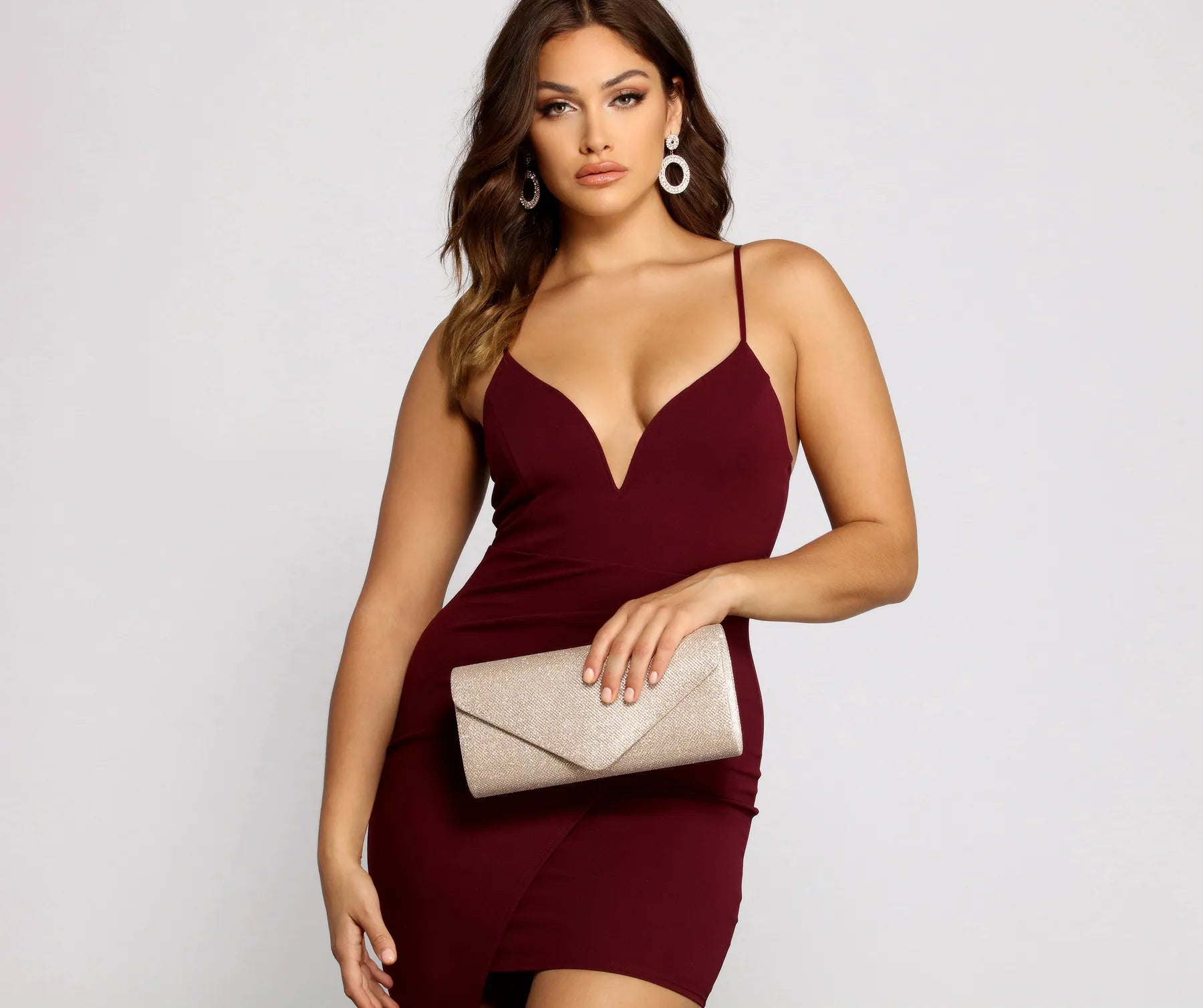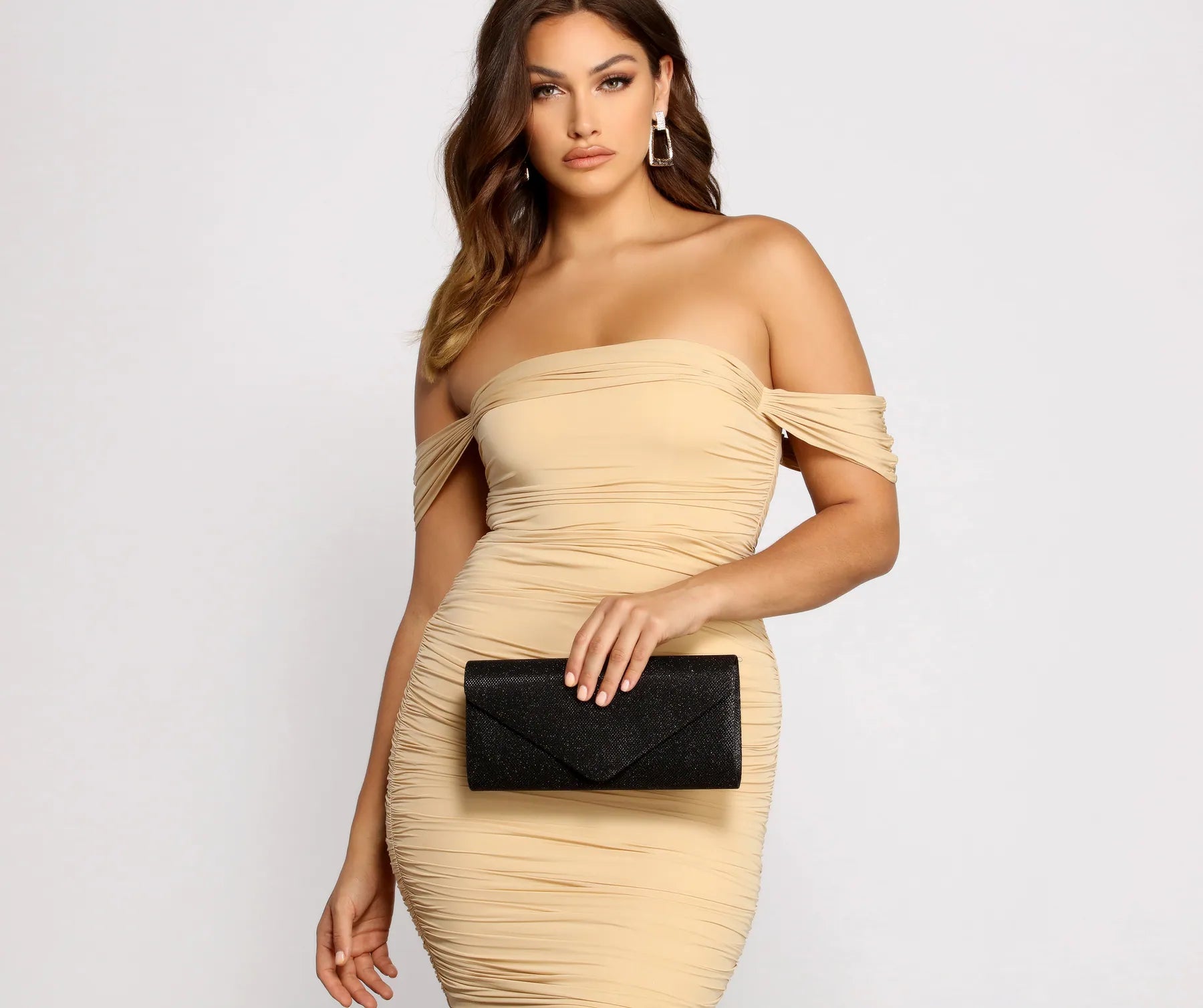 Bring the shimmer with a clutch that glows with glitz and glamour for your special evening. The clutch features a sleek rectangular mesh body adorned with glitter and envelope-style top flap closure. Complete your look with a and .?