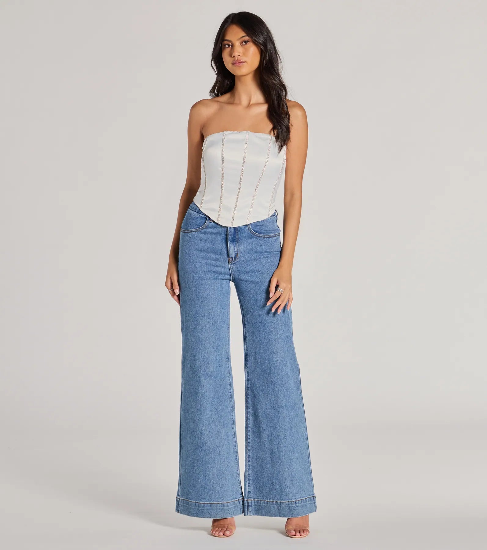 Level up the glitz factor of your party outfit with this sparkly rhinestone trim satin corset top! Designed with a silky-sleek satin woven fabric. it features a strapless neckline. a shimmering rhinestone-embellished vertical trim design. flexible boning to provide structure. a complete back zipper closure. an angled cropped hem for that iconic snatched silhouette. and a form-hugging fit. Style with a and heels!