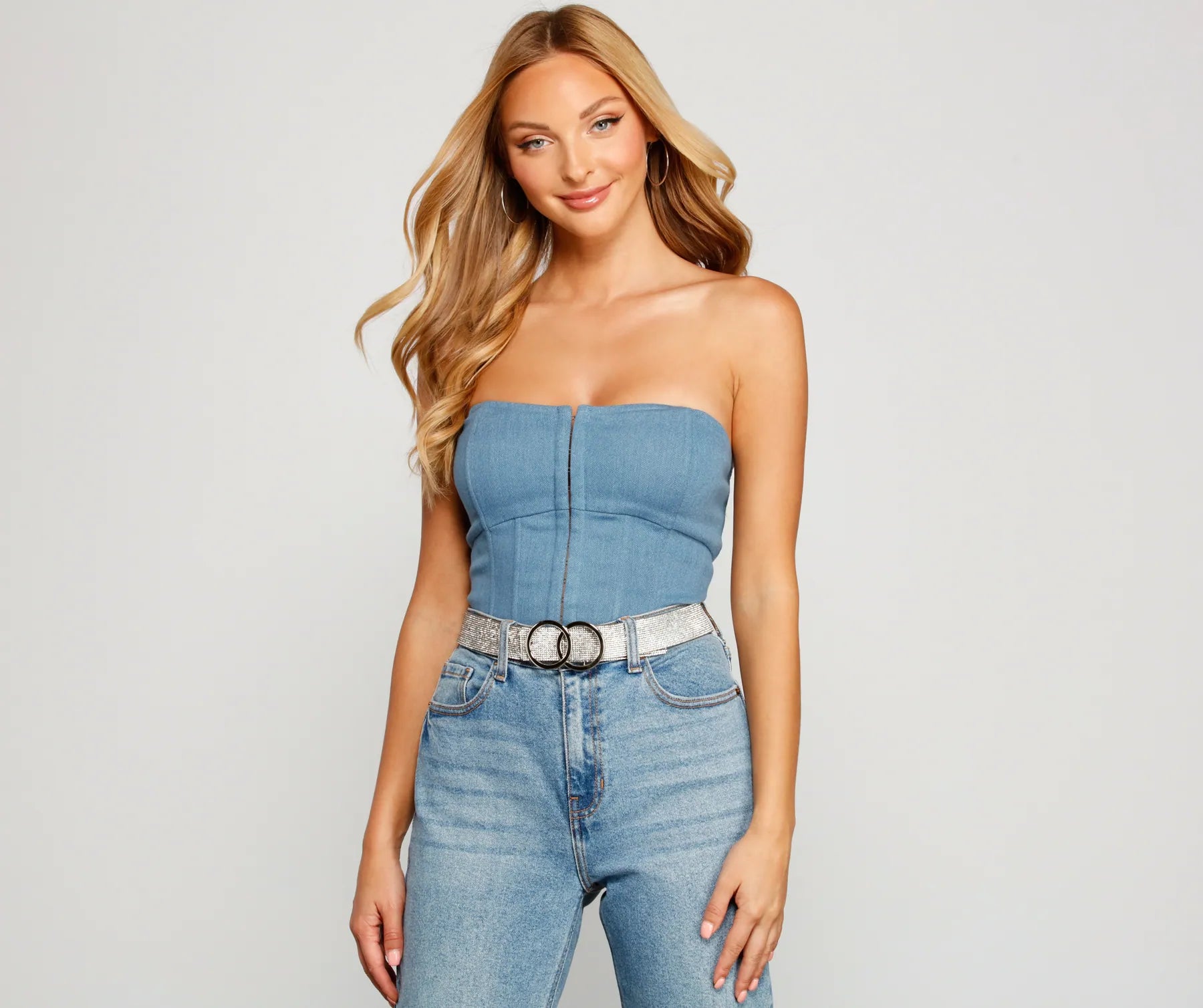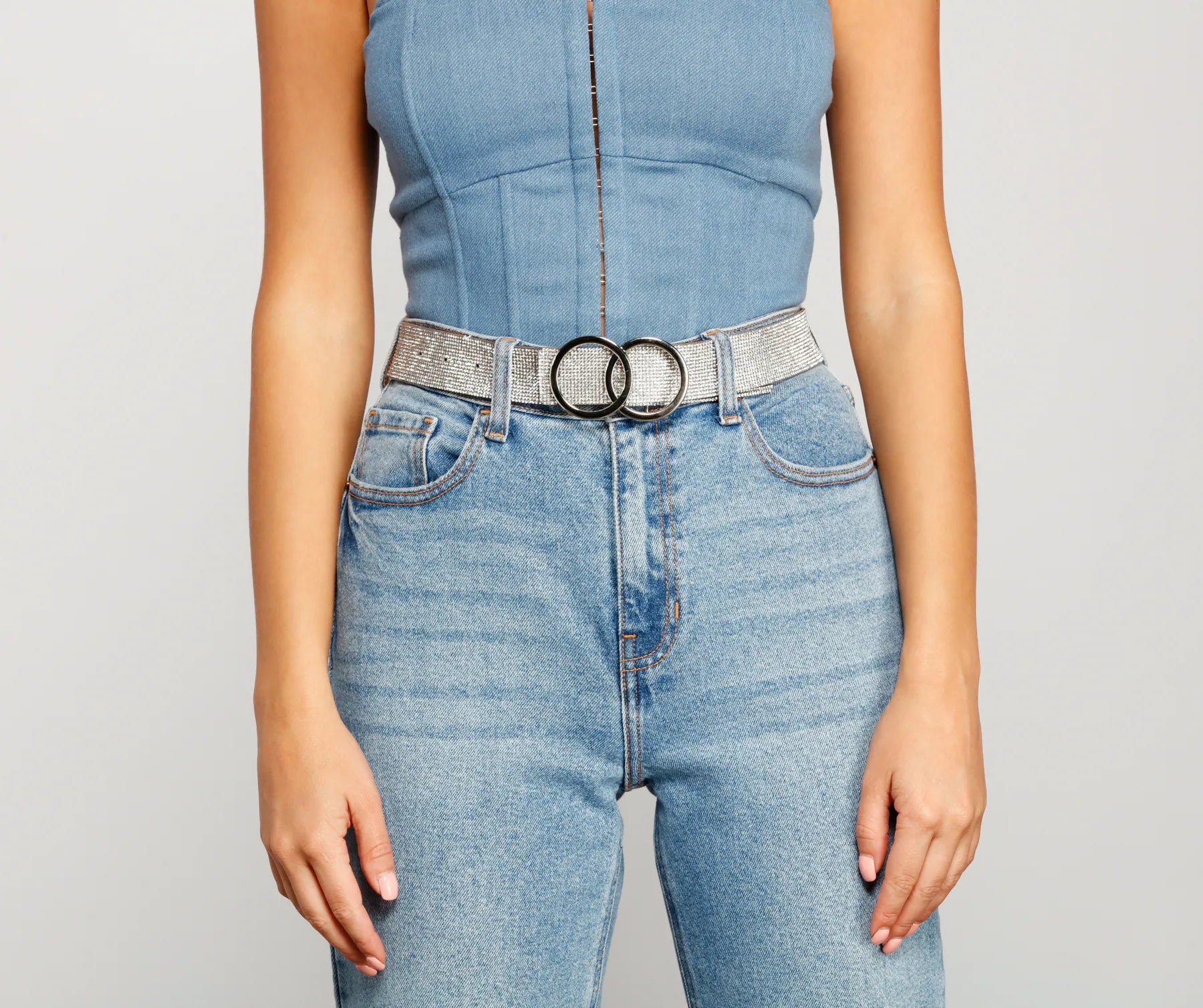 Hey babe. showcase a glam and glitzy look with this fab embellished belt! It features all-over rhinestone embellishment with a trendy double O-ring buckle. Style this belt with and a cute crop top.