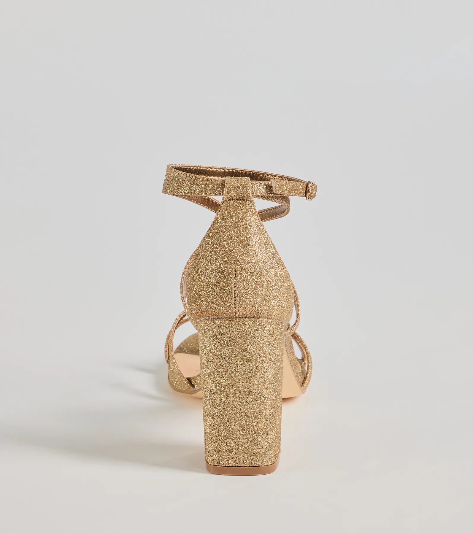 Step up your glam game with the glitzy strut glitter mesh block heels. Featuring a chic criss-cross design. adjustable ankle strap. and cushioned insole for all-night comfort.