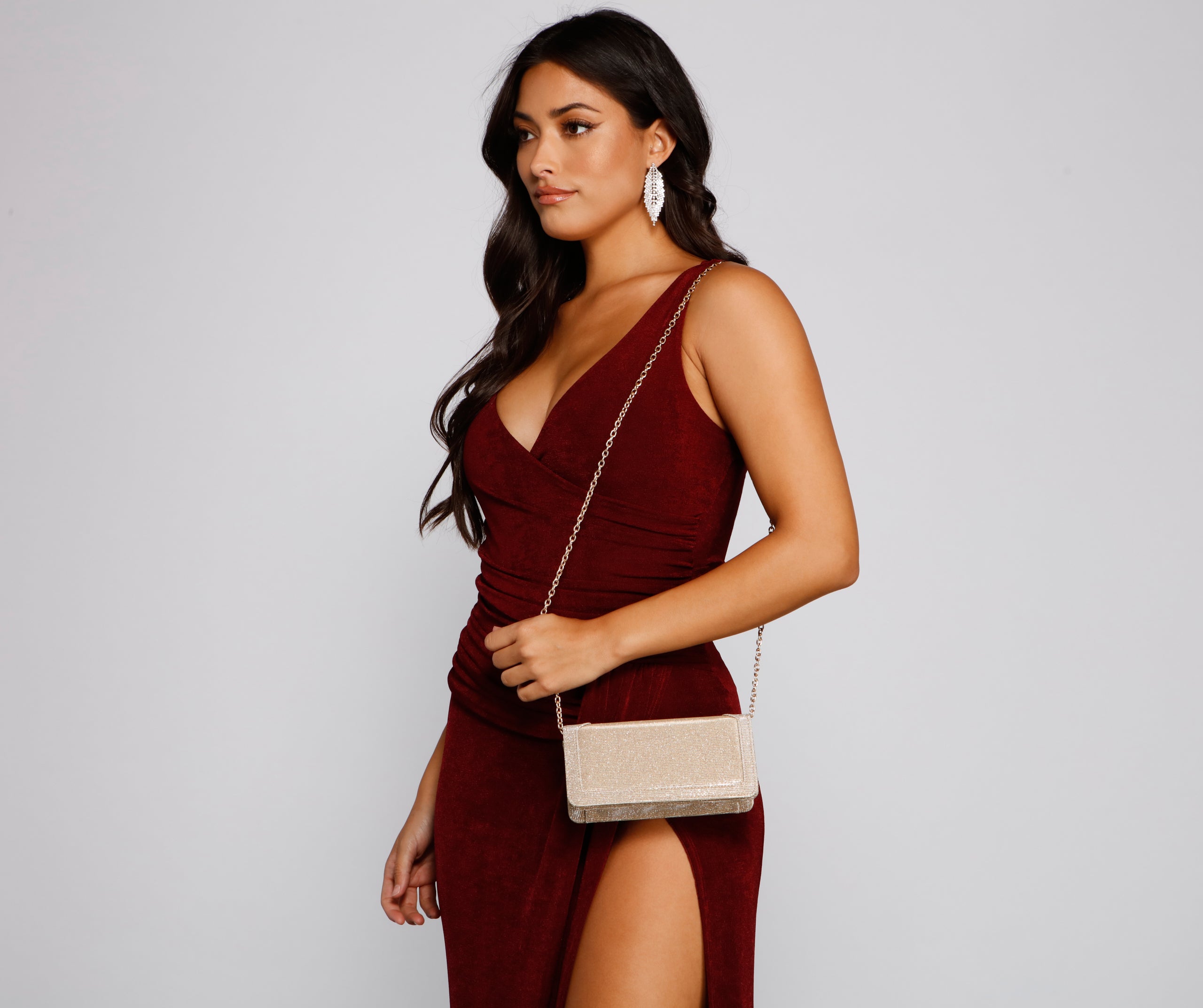 Glow on babe with a crossbody that brings the glitz! The crossbody features a glitter body. a small rectangular shape. a fold-over closure. and a chain-link shoulder strap. Complete look with a and rhinestone earrings.?