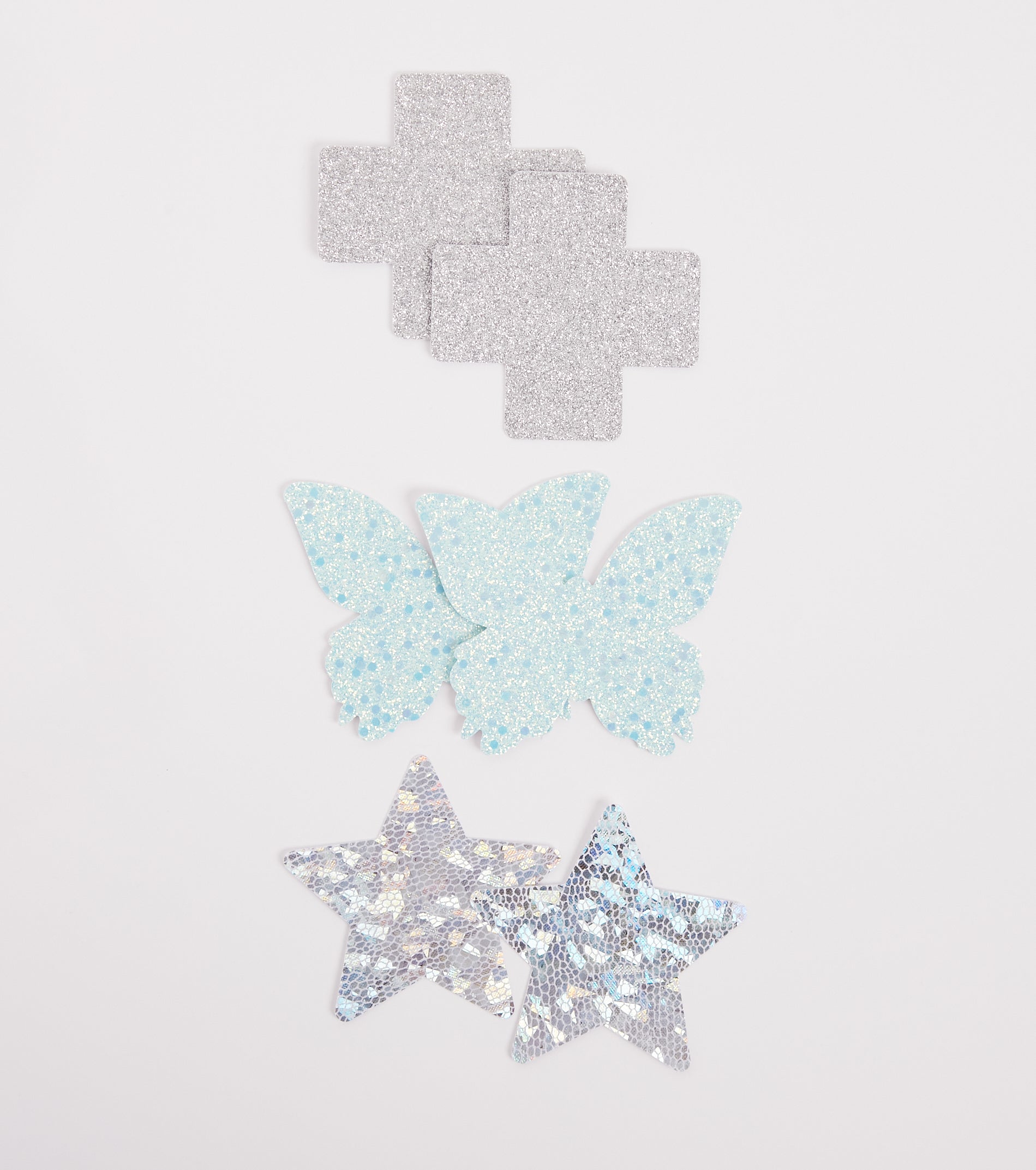 Why blend in when you can glow-up? This three-pack pasties set is essential for keeping your outfit on point. Achieve a smooth look without the fuss of wearing a bra. It features one glitter butterfly pair. one glitter X-shaped pair. and one holographic star pair each with a strong adhesive back. Style with a low-cut and stiletto heels for the perfect night out!