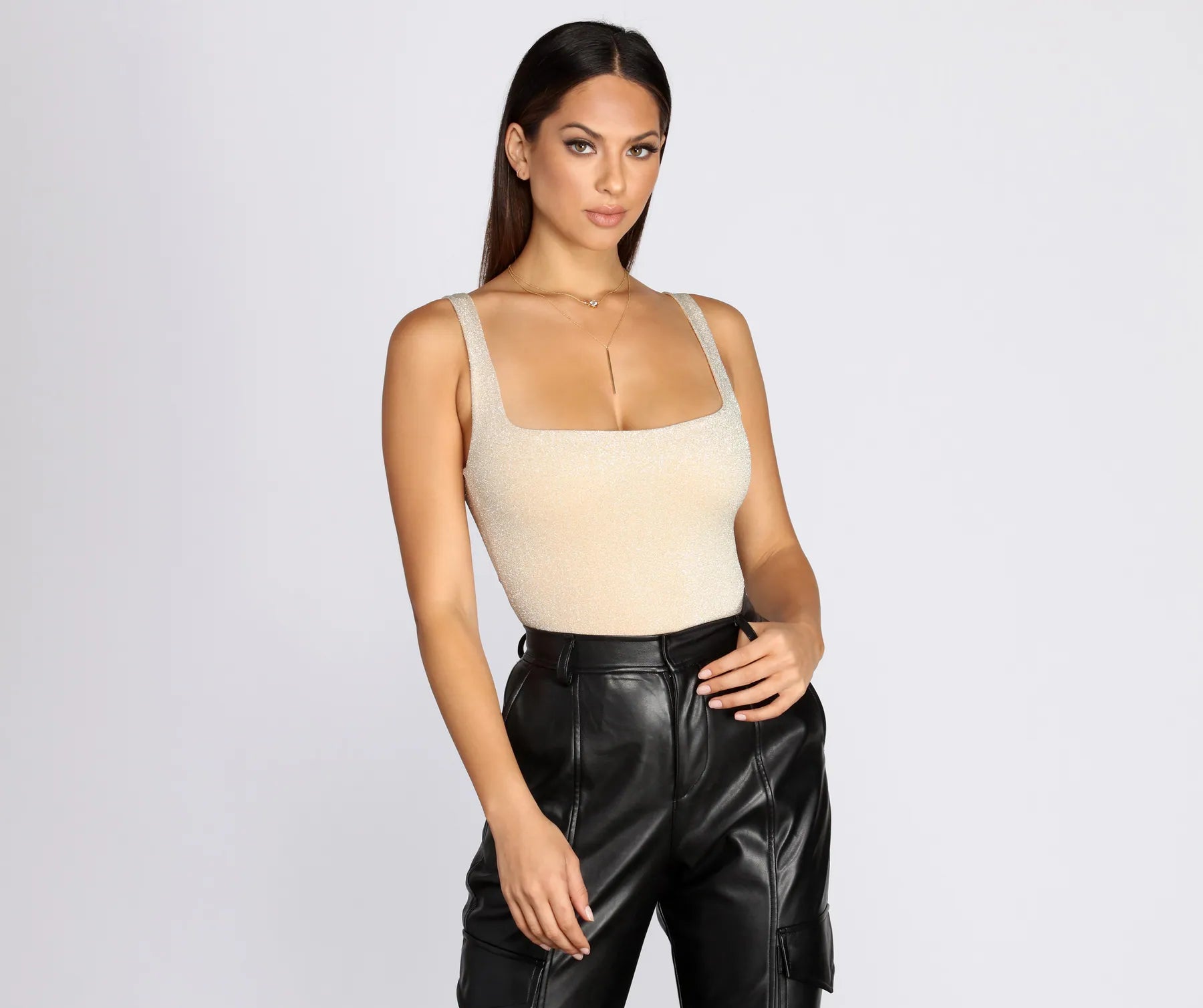Dig for those goals baby! This gleaming bodysuit features a square neckline. tank straps. and a form fit with a thong bottom and a double snap closure. This sleeveless bodysuit is composed of a smooth inner lining and a mesh knit overlay adorned in glitter!
