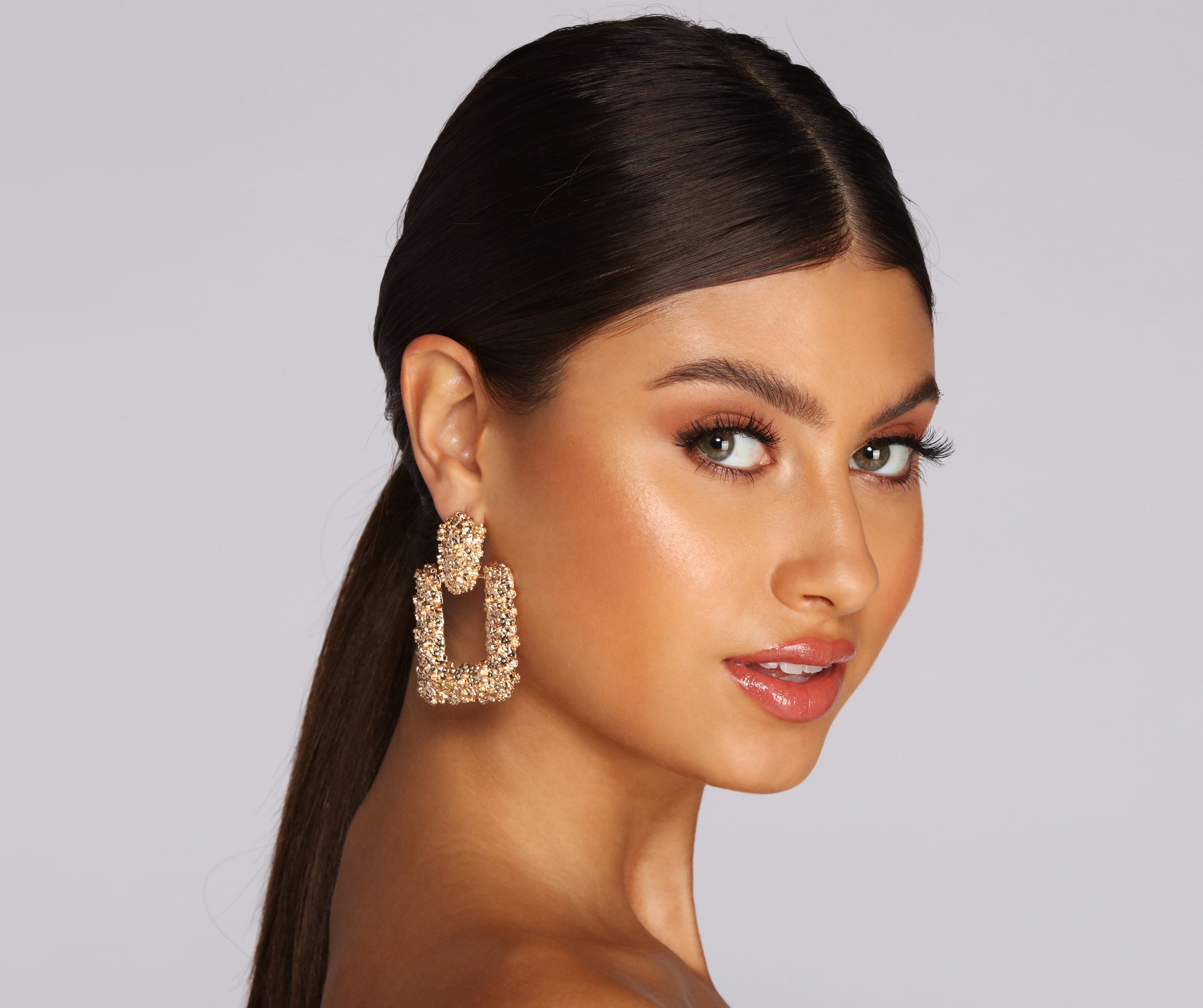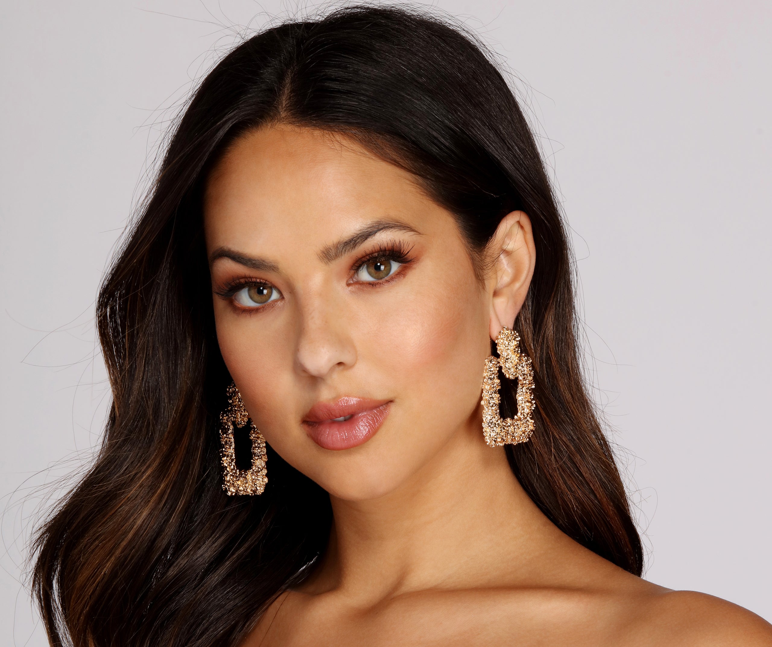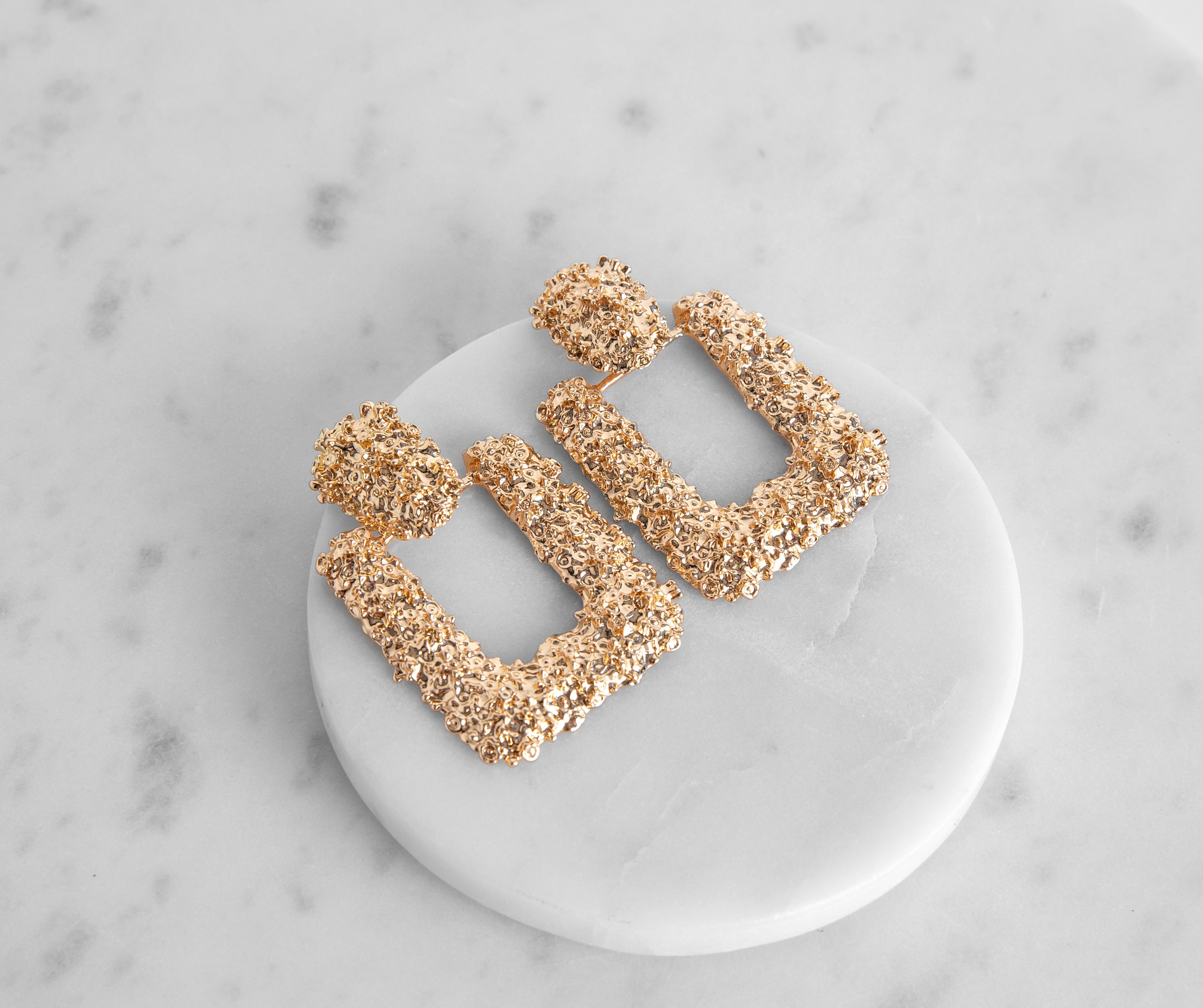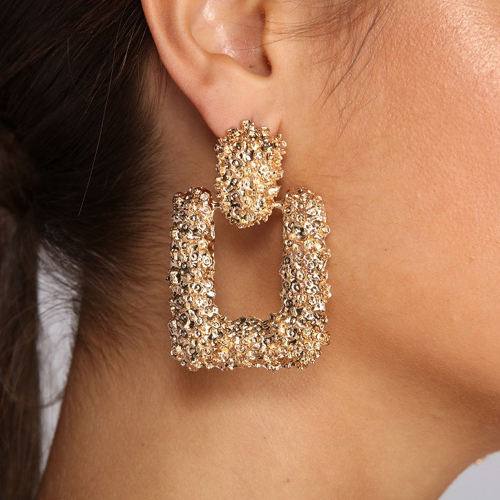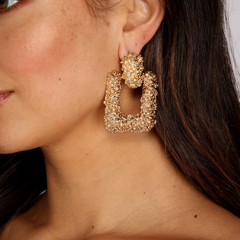 You don’t shy away from big and bold—so go for the gold with this door knocker style! Earrings are made made from an eye-catching textured gold metal and feature an oversize. open square shape attached to a solid gold oval with post back closure.