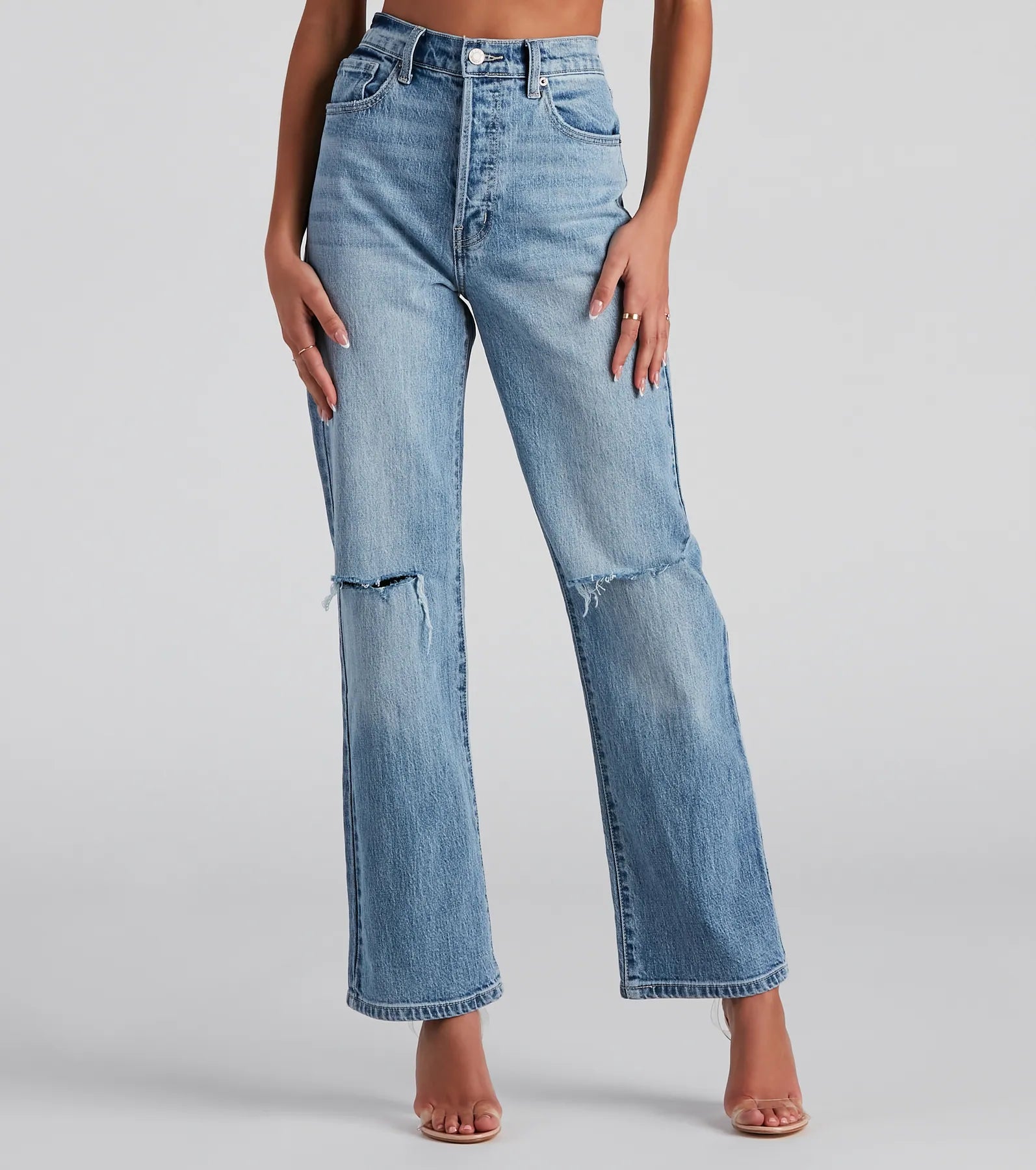 Perk up. these high-rise boyfriend jeans are perfect for slaying every ootd! They feature an ultra-high rise waist. knee slits. a color fade effect. and a boyfriend-style leg-on medium wash denim for a cool vintage look. Complete the look in a top.