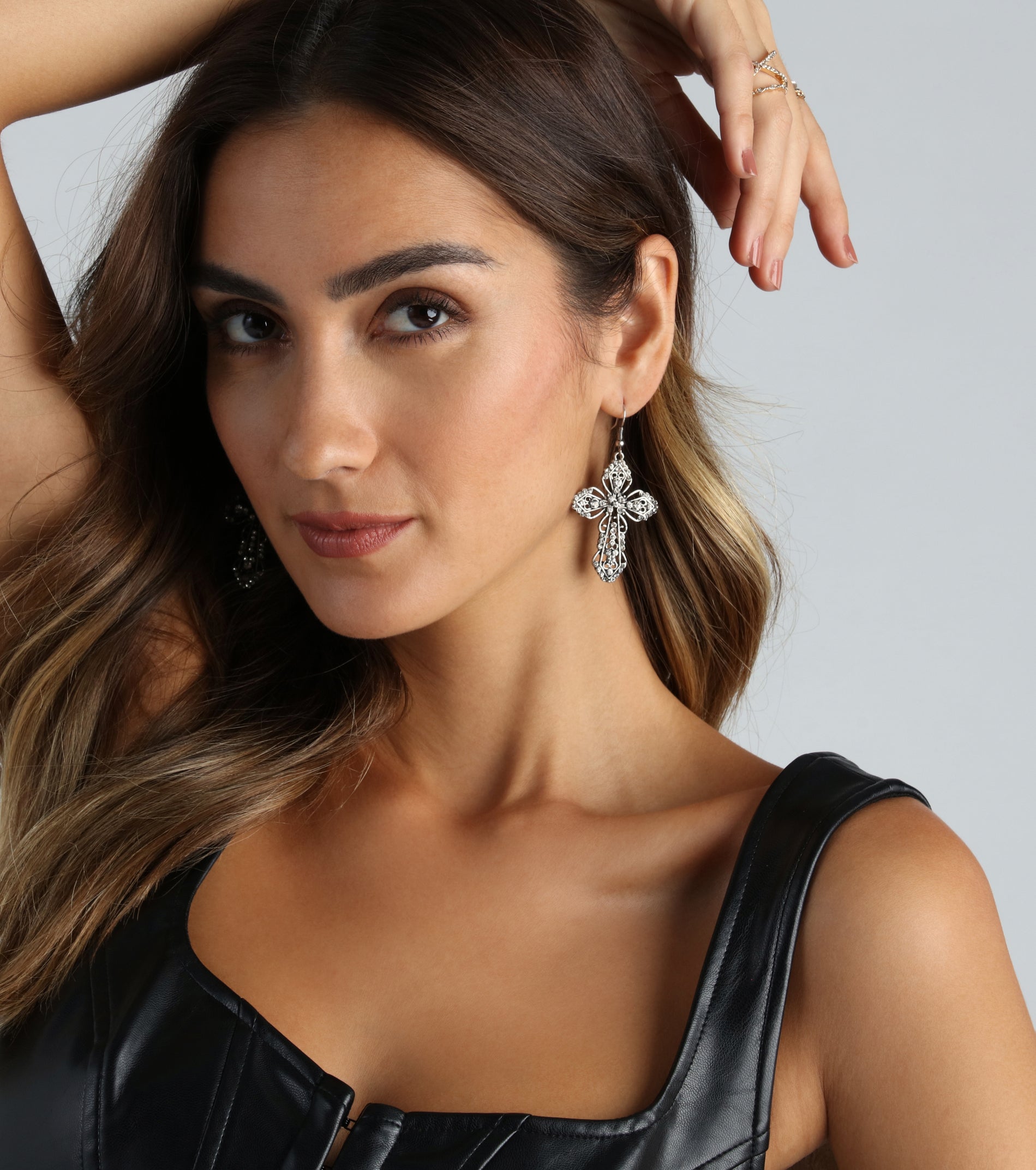 These bold rhinestone cross charm earrings will give off those gothic glam vibes. They feature a hanging design with an intricately detailed cross charm with mini rhinestone embellishments for a chic sparkle. Includes a fish hook closure. Style with a .