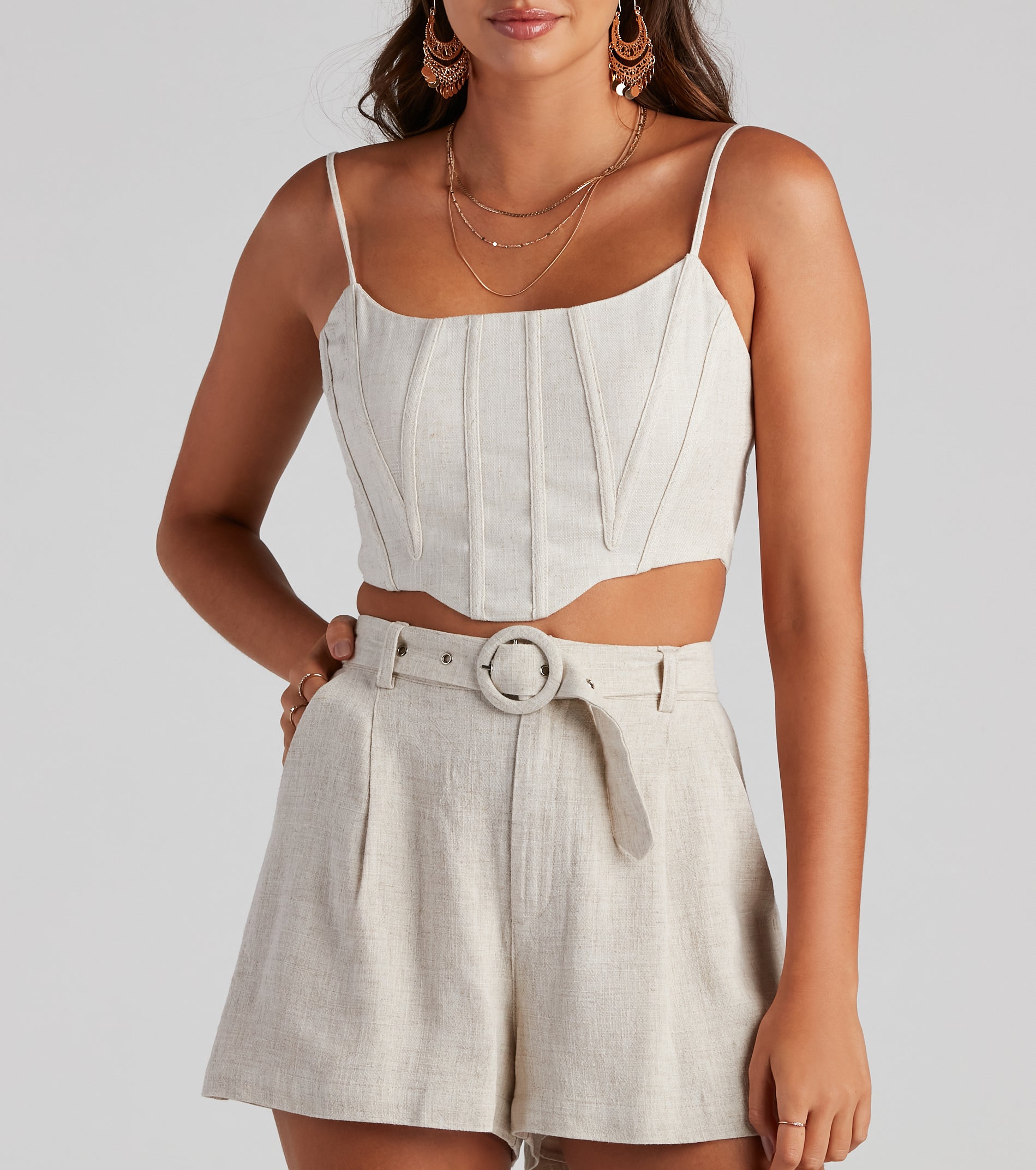 If this bustier could get graded it’d receive an A. It features a sleeveless. boat neck. adjustable spaghetti straps. a cropped hem. hook-eye back closures. and flexible boning to provide structure. Complete the look in high-rise for wine tasting.