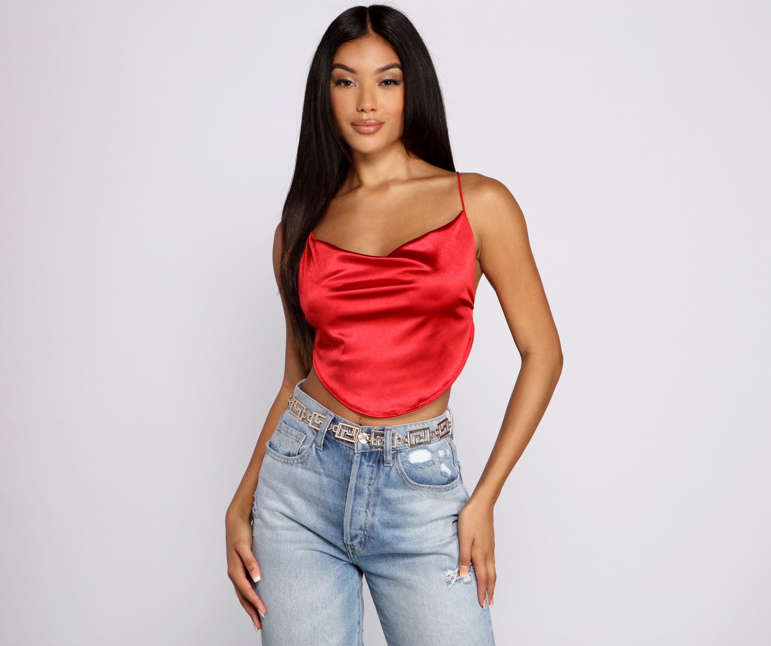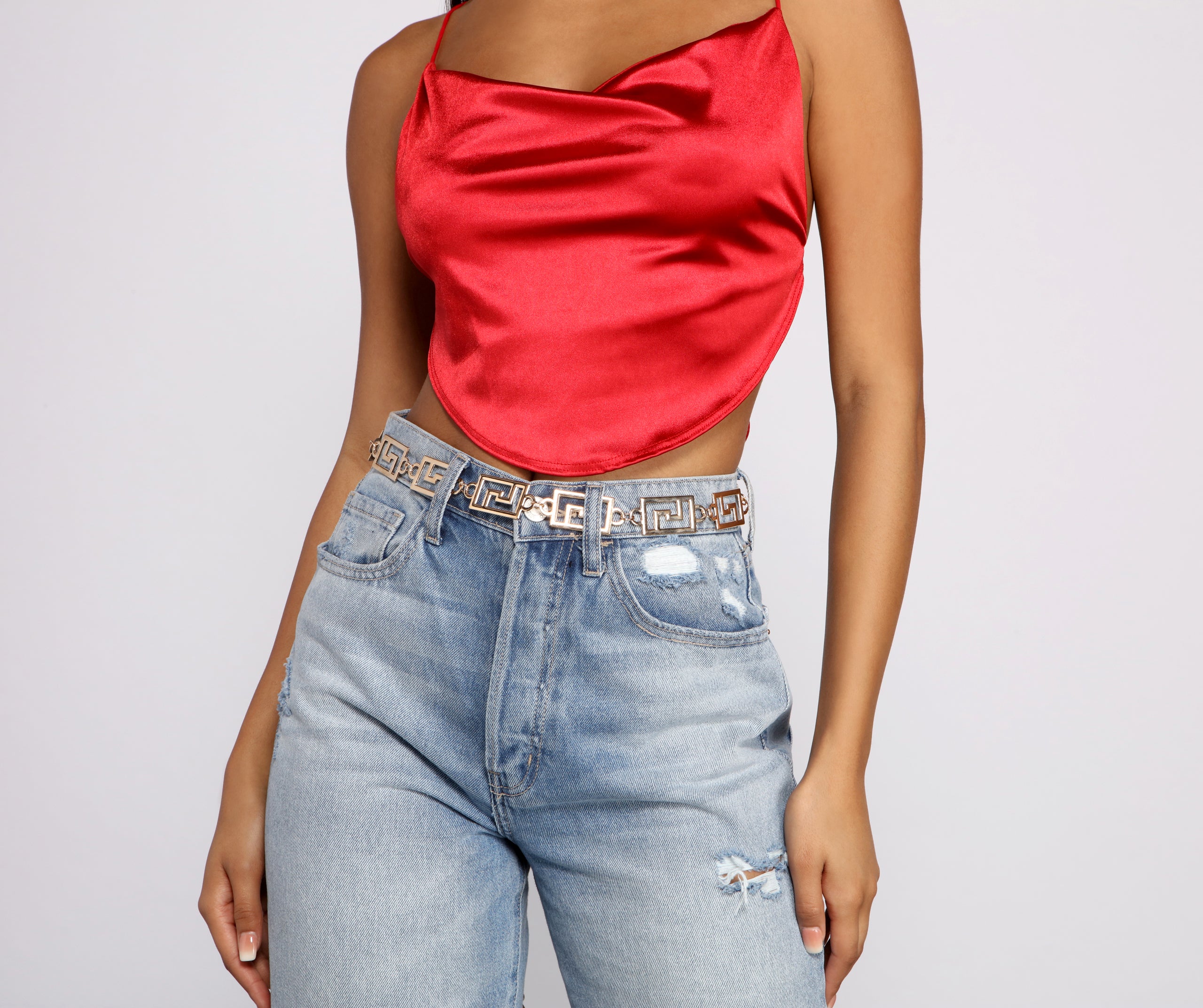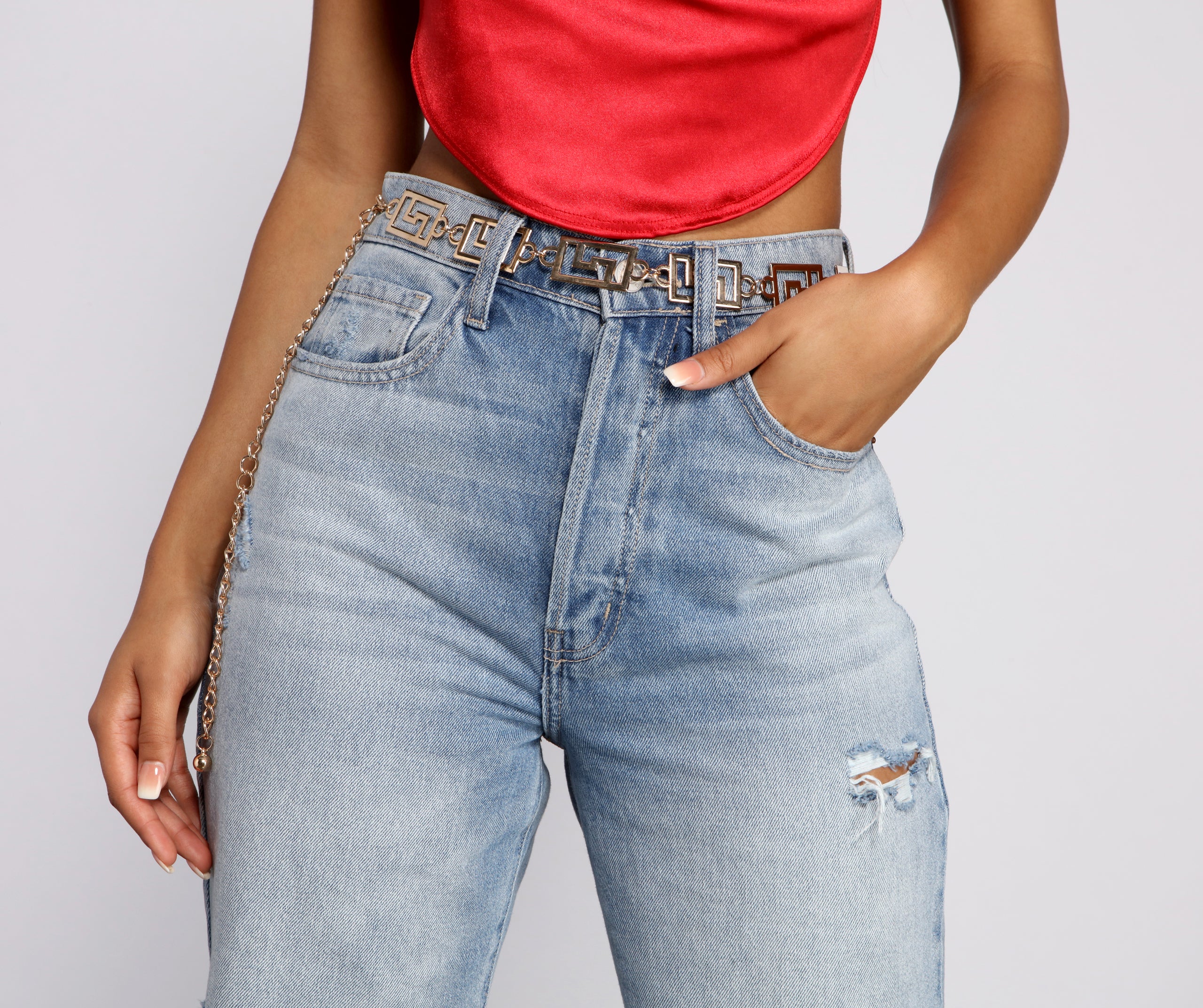 Add on this trendy chain-link belt to create a stunning look for your next party! It features a greek key design with an adjustable chain. Pair this belt over a for an added touch of glam.