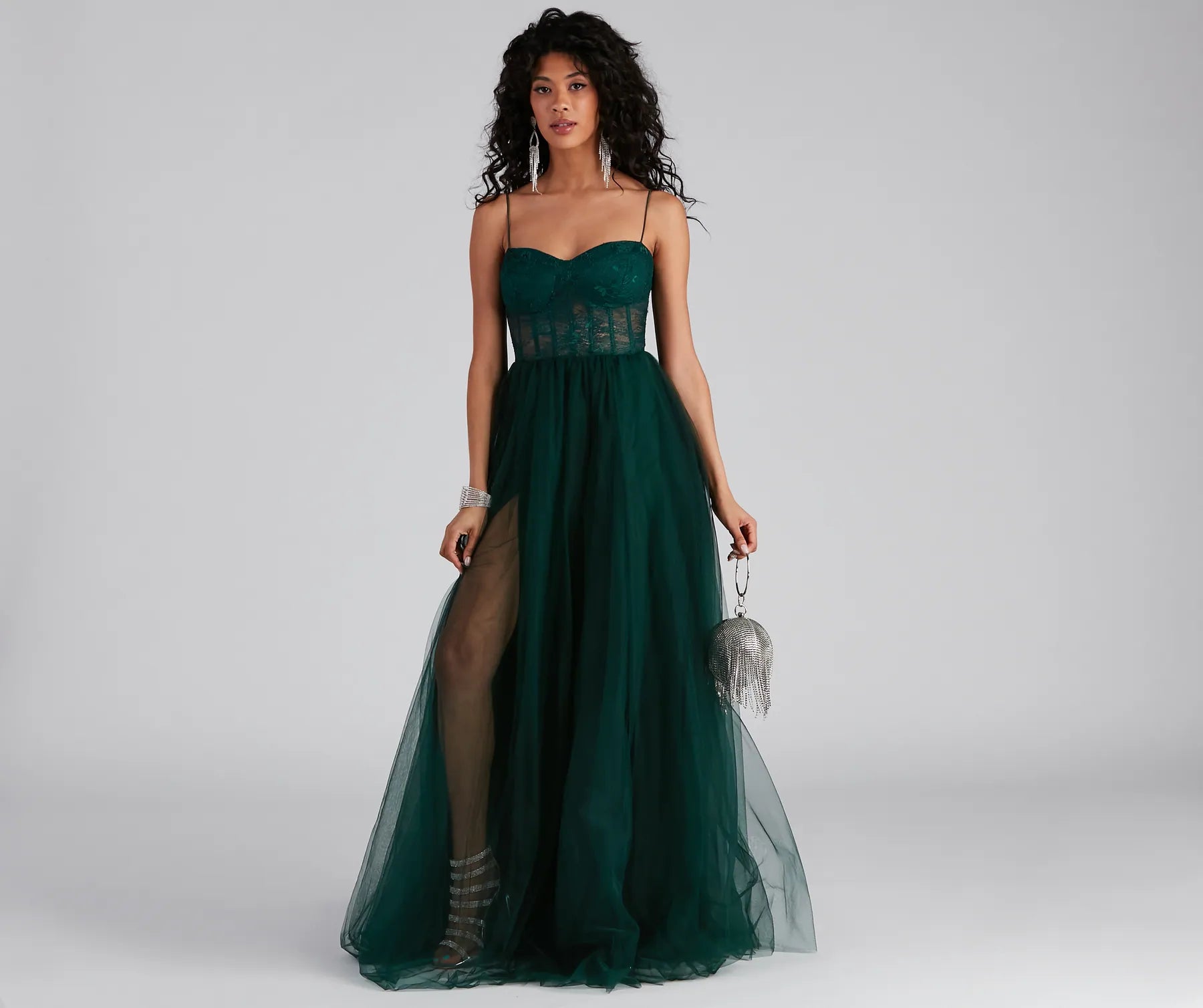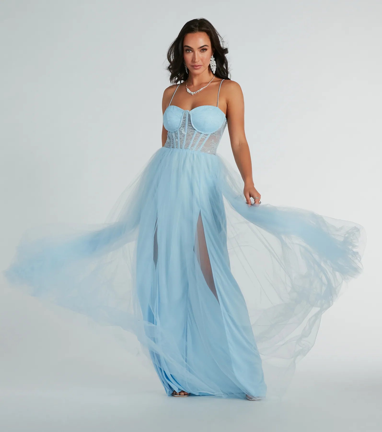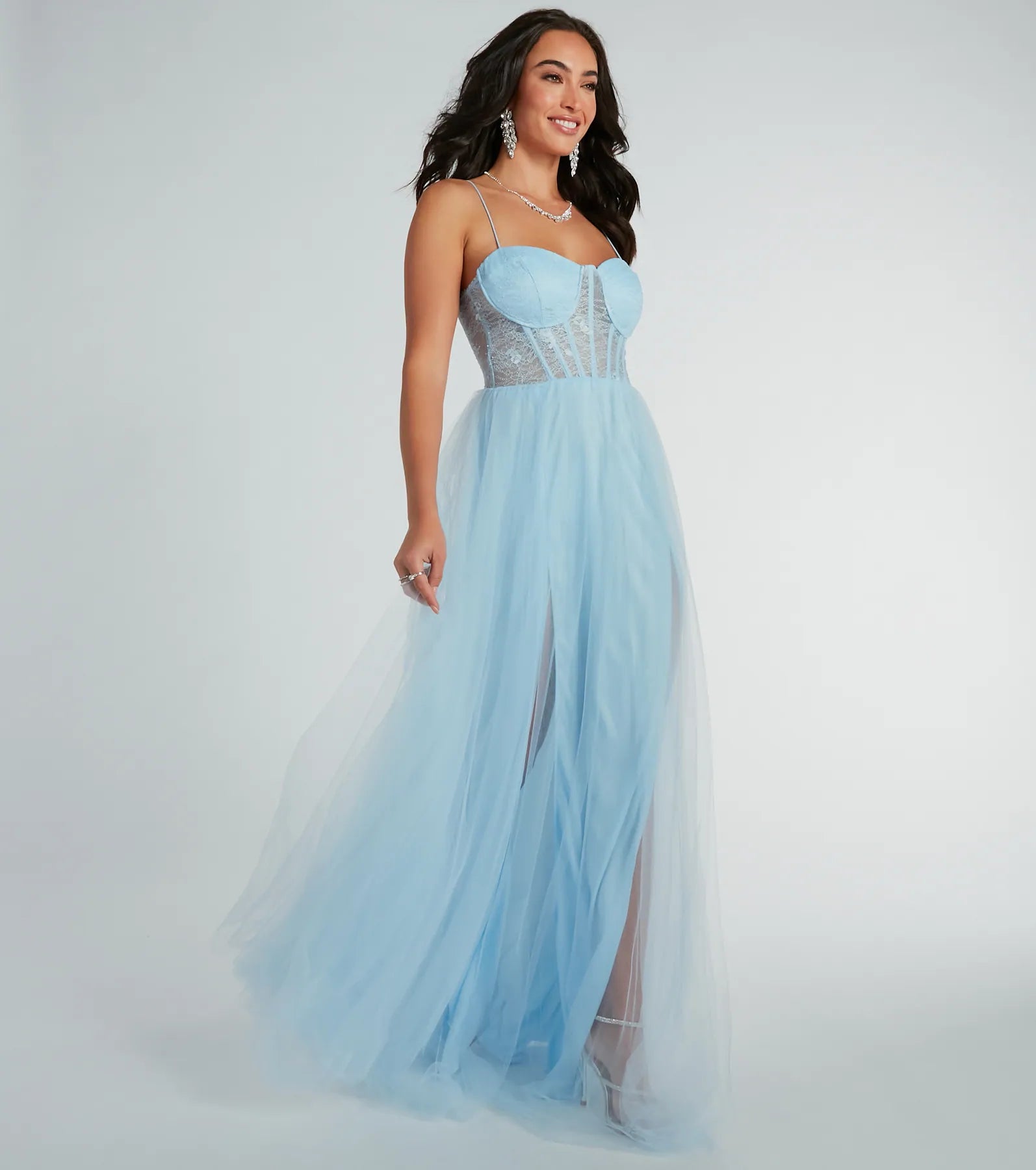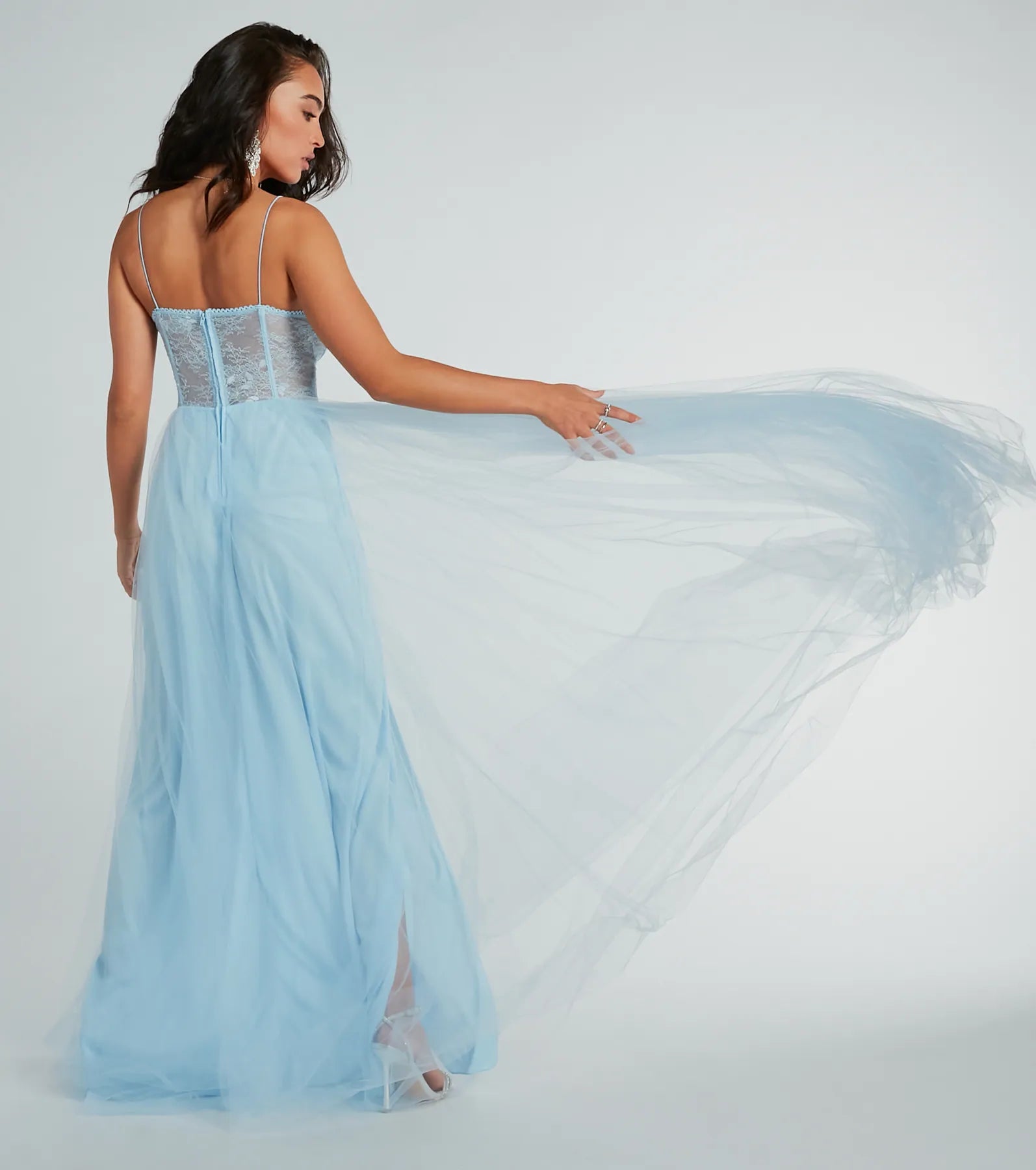 Radiate in a prom dress that is fit for a queen! Hailey enchants with a sleeveless sweetheart neckline to showcase your. molded padded cups that eliminate the need for a bra. and sleek bungee straps. Her bodice features a gorgeous lace design. contrast piping. and flexible boning that offers support. Her slim-fit bodice leads to a flowy floor-length A-line skirt composed of tulle. Her knit lining features a daringly high side slit to create a chic sheer contrast. Complete your prom outfit with rhinestone heels and clutch.