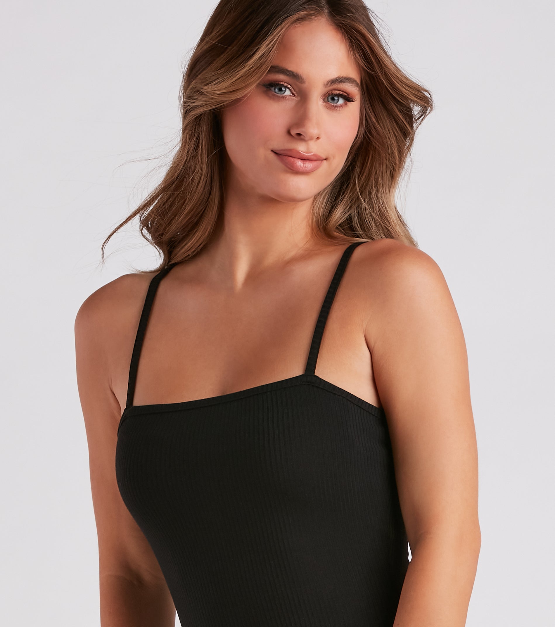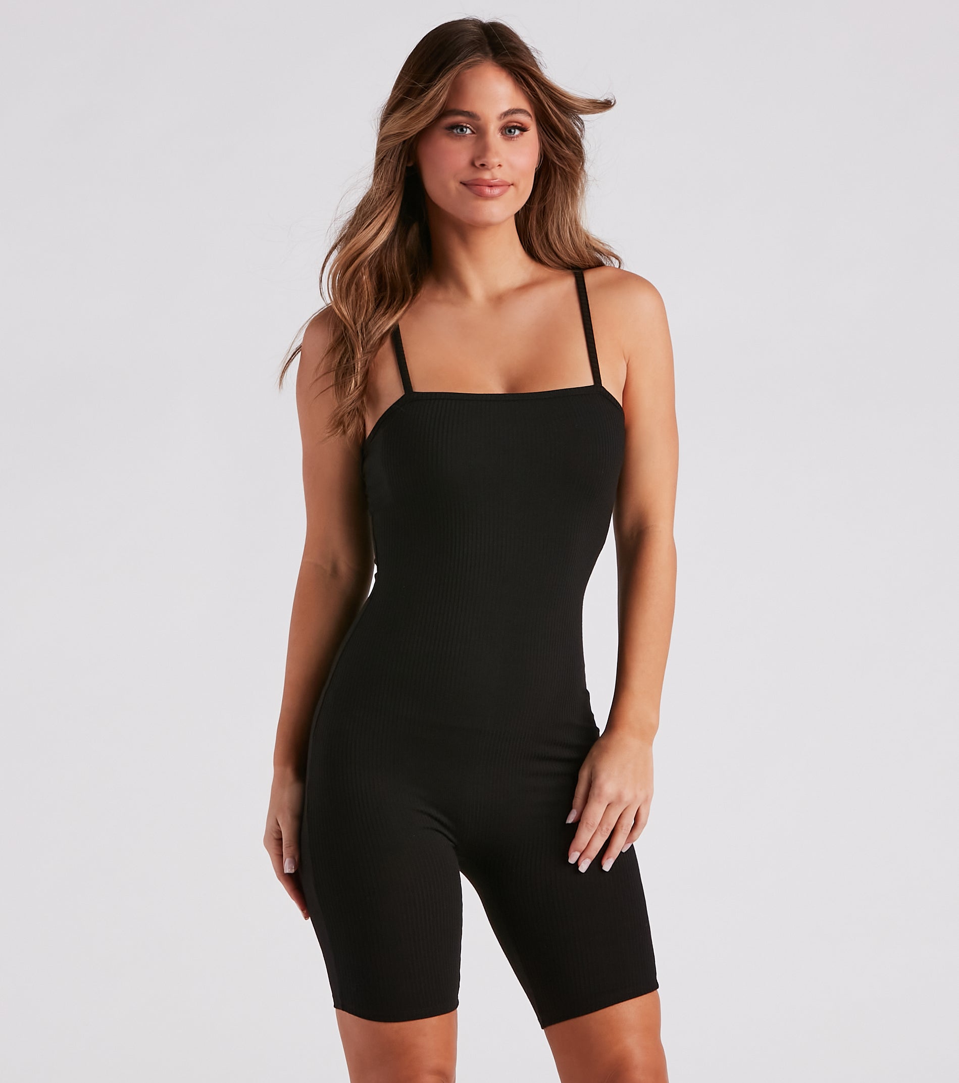 Love staying in? Look comfy and cute in this seamless pajama romper perfect for lounging or styling up to get some coffee! It features a sleeveless square neck. adjustable spaghetti straps. a form-hugging silhouette. and fitted biker-style shorts on stretchy rib-knit fabric. Complete the look in a and sneakers!?