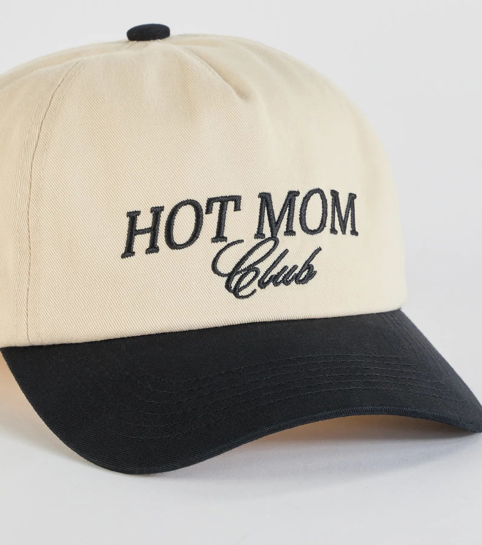 This cute baseball cap features a trendy two-tone design and a front embroidered script reading. Hot Mom Club.
