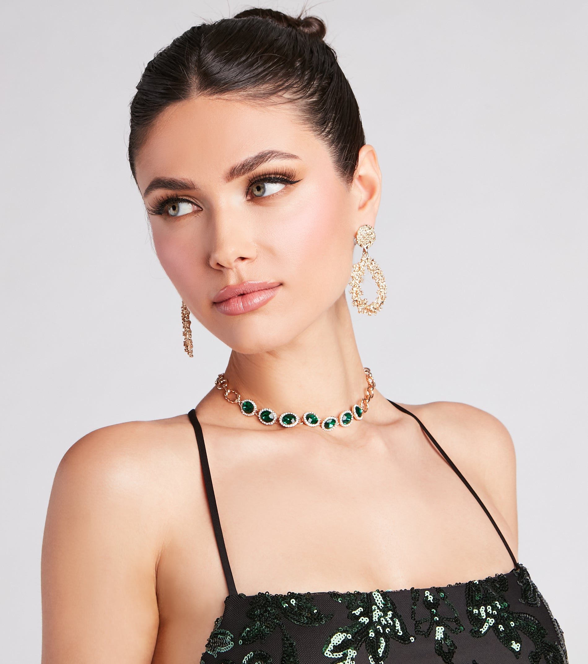 This gorgeous gemstone choker necklace will have you in the mood for glamour! It features a chain-link design leading to front oval-shaped gemstones outlined with mini rhinestones. Style with sleek .