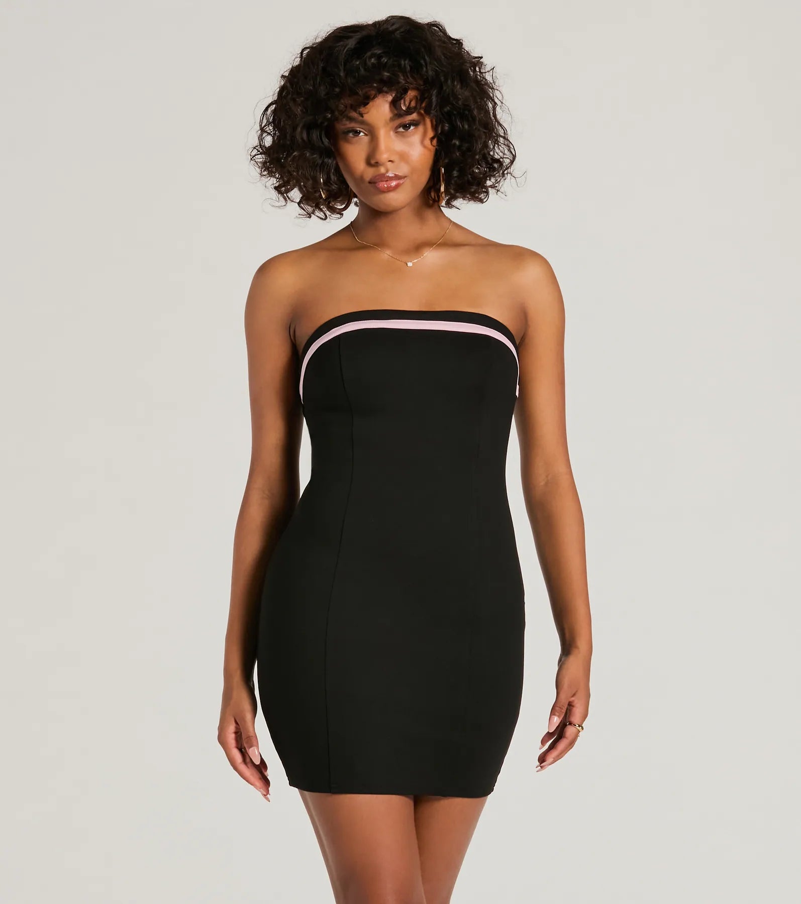 Charm your way through any soiree in this ponte mini dress for an irresistible confidence! Featuring a strapless neckline with contrast trim for a trendy touch. a non-slip grip lining for a secure fit. and a satin ribbon lace-up back for a fun twist on the classic bodycon fit along the mini-length hem. Complete the look with a chic for a touch of glamour!