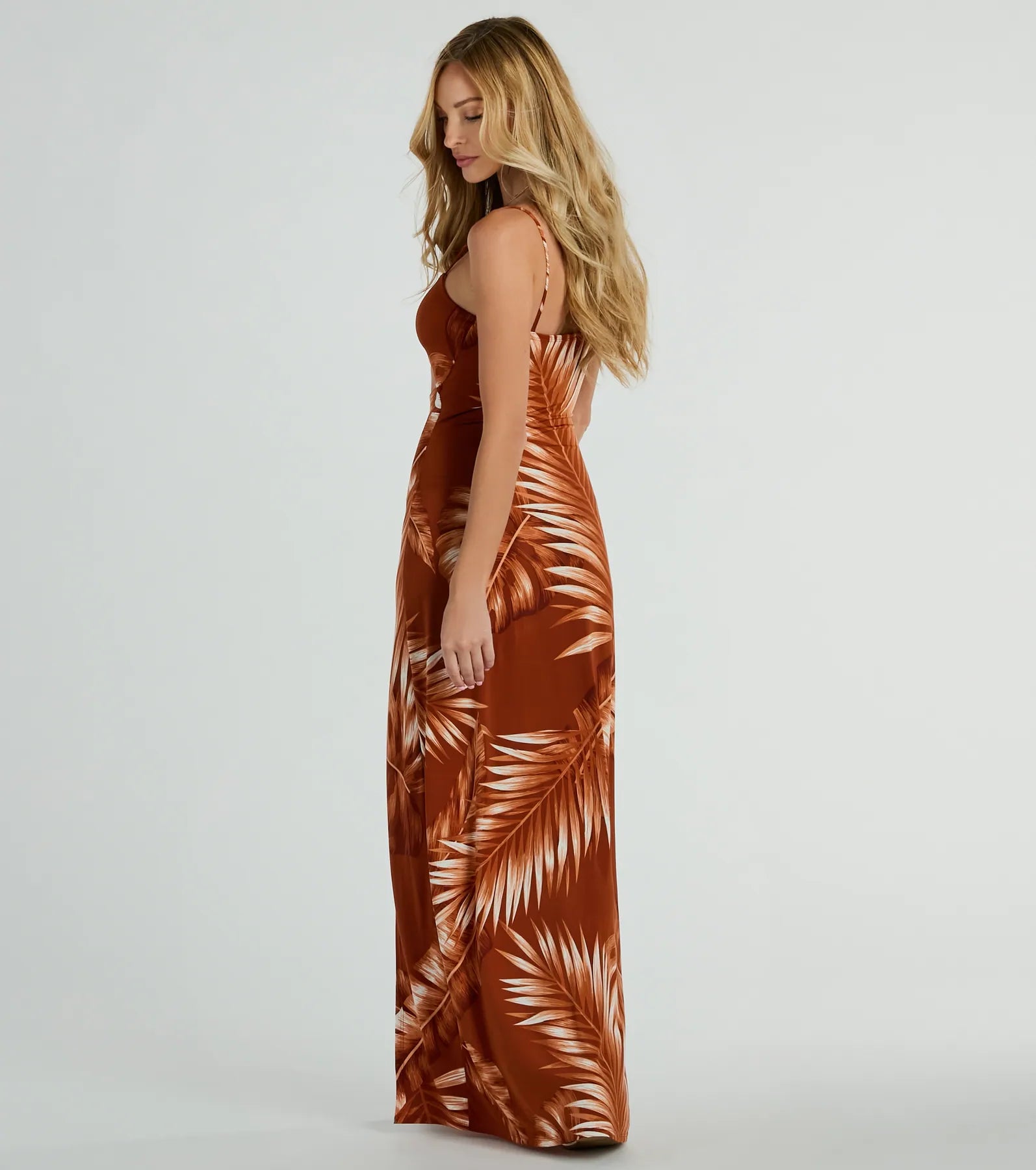 Feel the island breeze in this tropical maxi dress while on vacation! ?With a square neckline. spaghetti straps. and a form-hugging fit. this maxi dress is perfect for a day in the sun. The cutout bodice and high front slit add a touch of playfulness to your island look. Complete the look with .