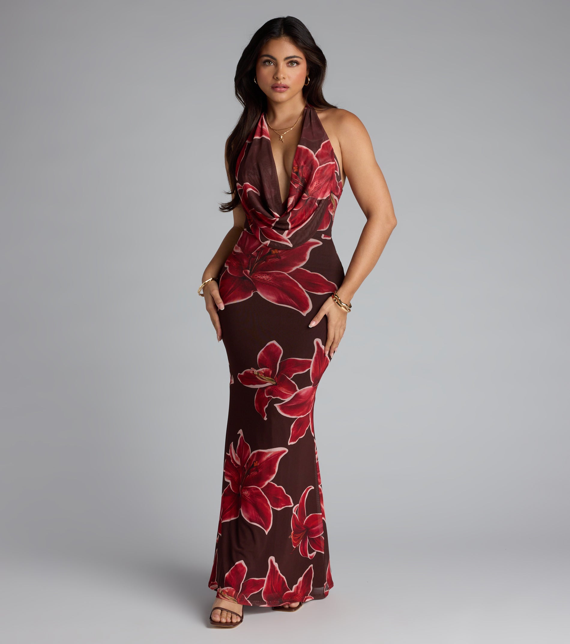 Beach date or rooftop night out? You’re covered. With a drapey neckline and bold floral print. this maxi gives you that effortless she’s glowing moment.