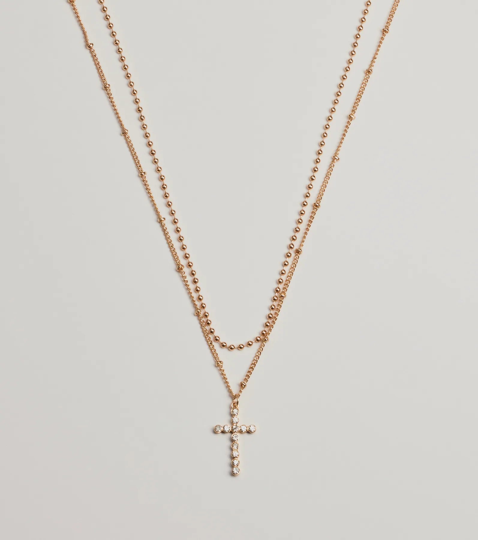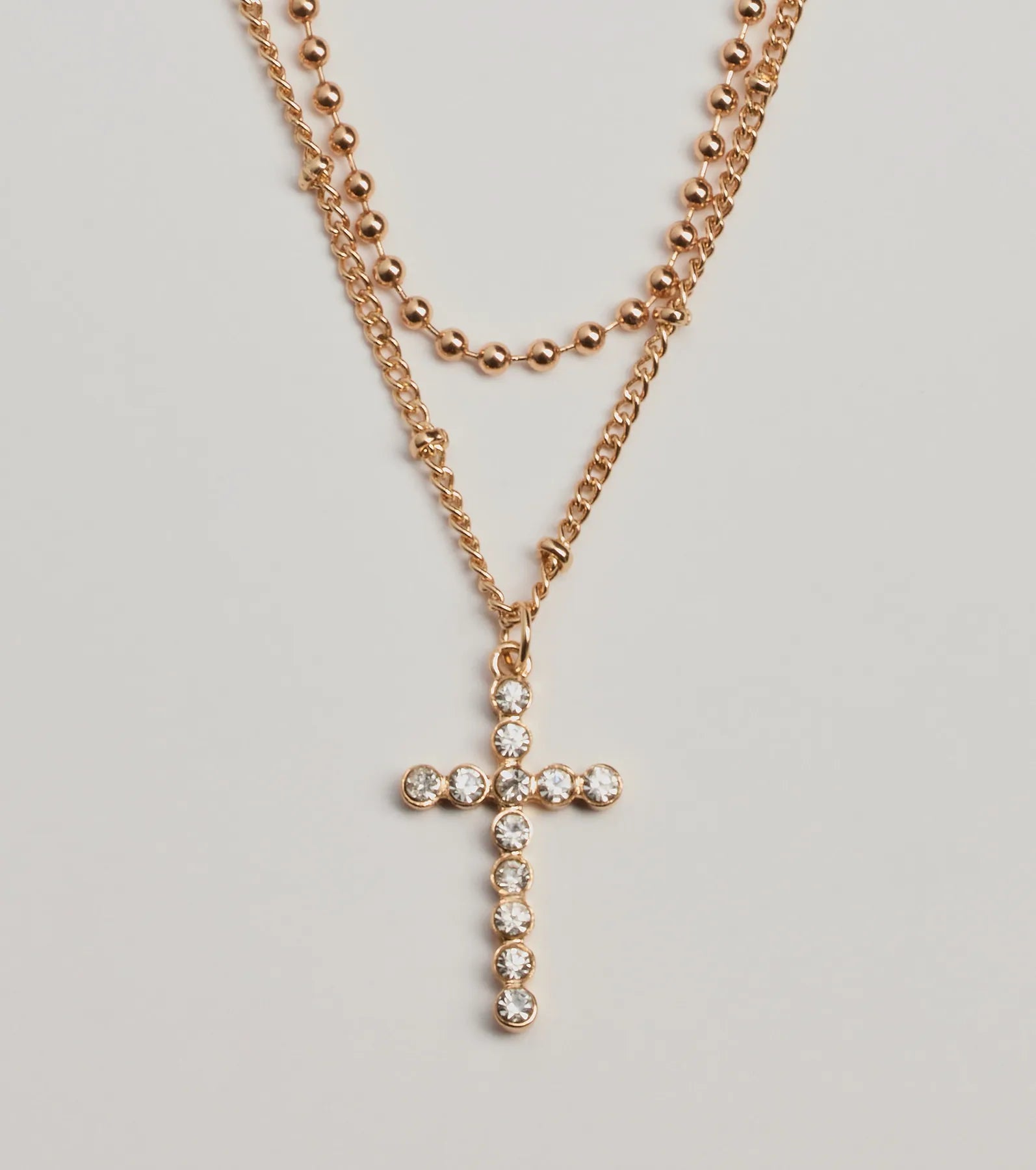 Tis the season for joy with this glam layered cross necklace designed with dainty beading and glam rhinestone embellishments. Complete the look in a long sleeve top and midi skirt.