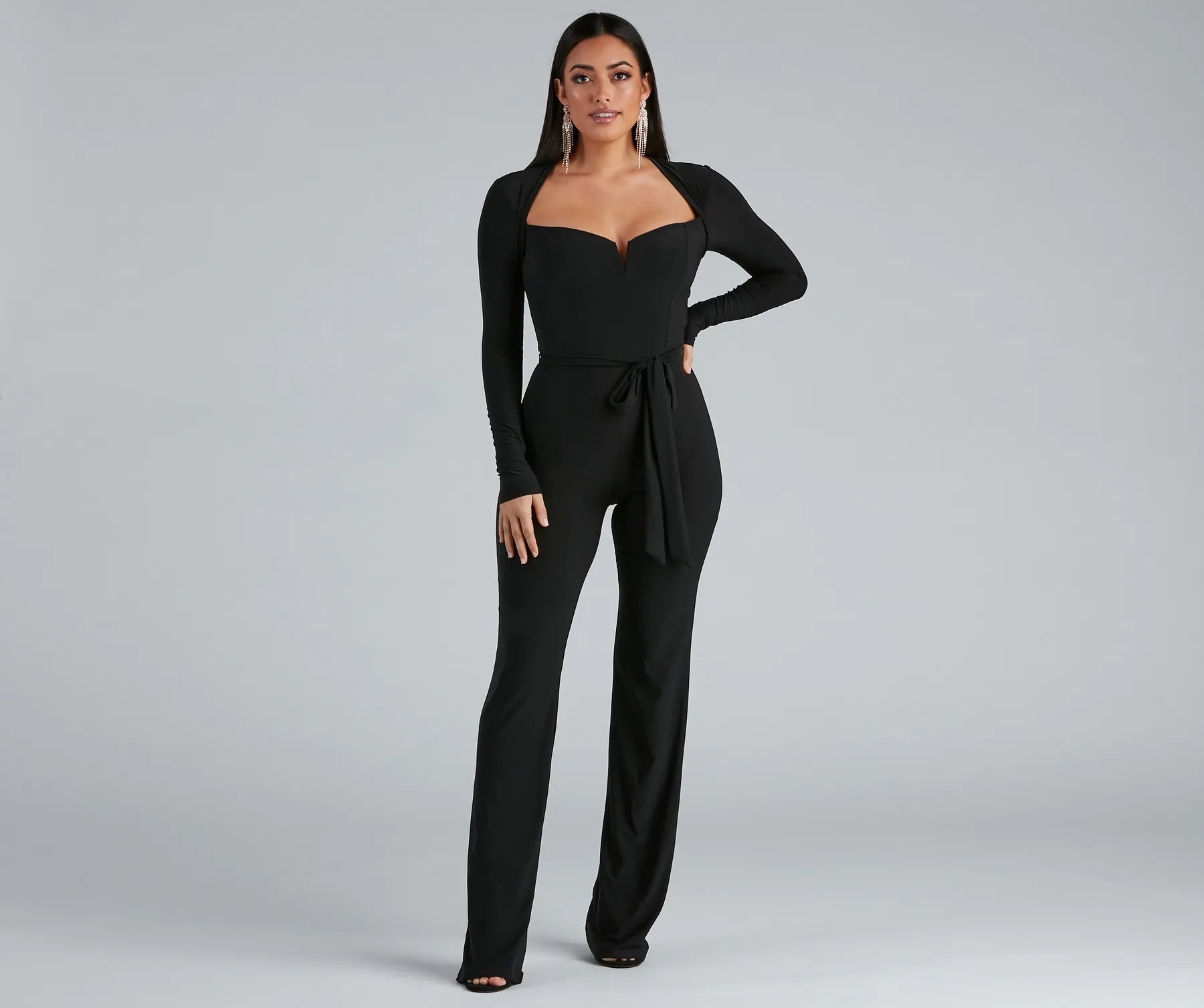 Keep your look simple and chic with this sleek woven jumpsuit. It features a wired V-neckline. long fitted sleeves. a tie-waist. and straight pant legs with a flared hem. The stretchy woven fabric offers a form-hugging fit. Style this jumpsuit with .