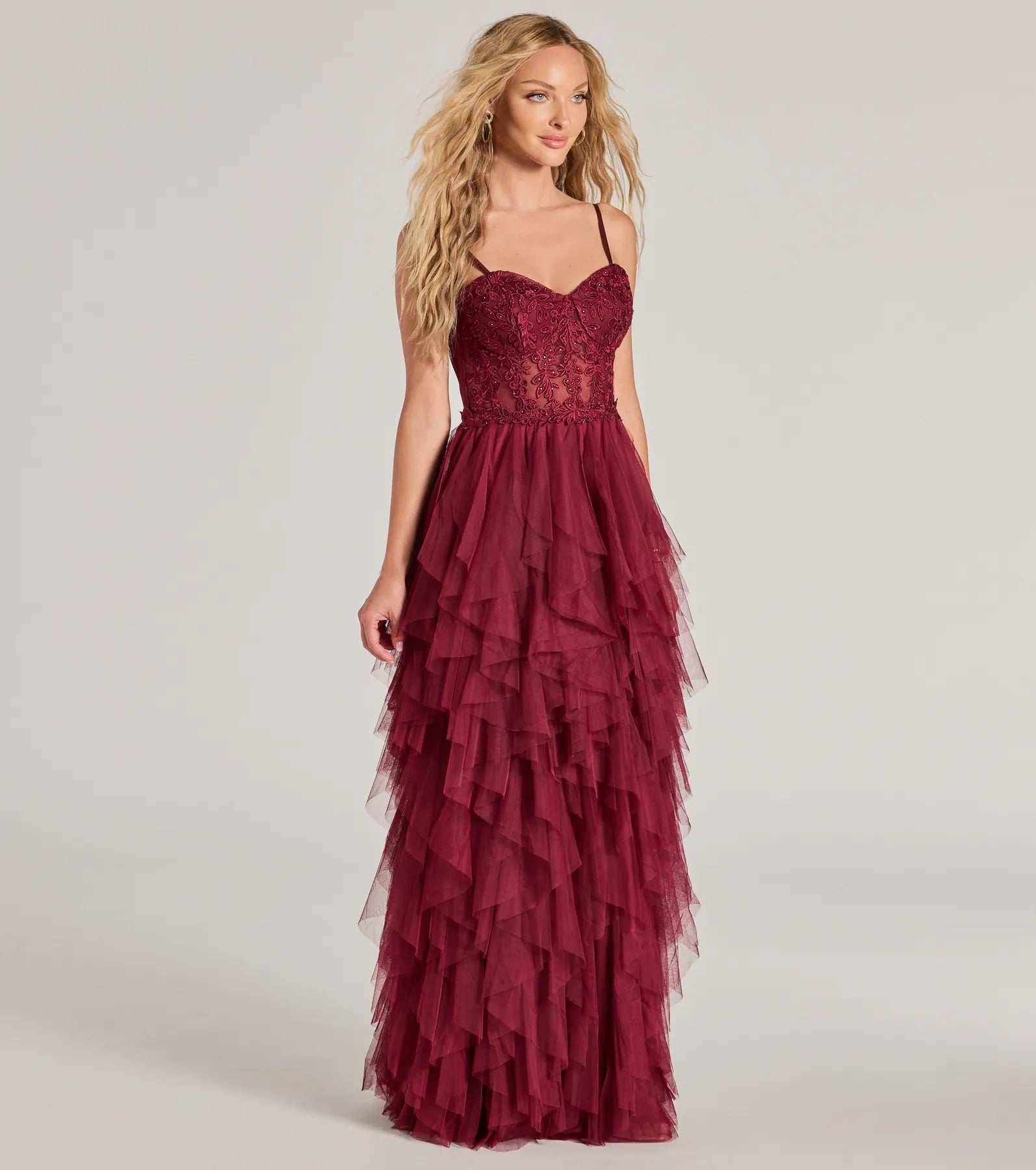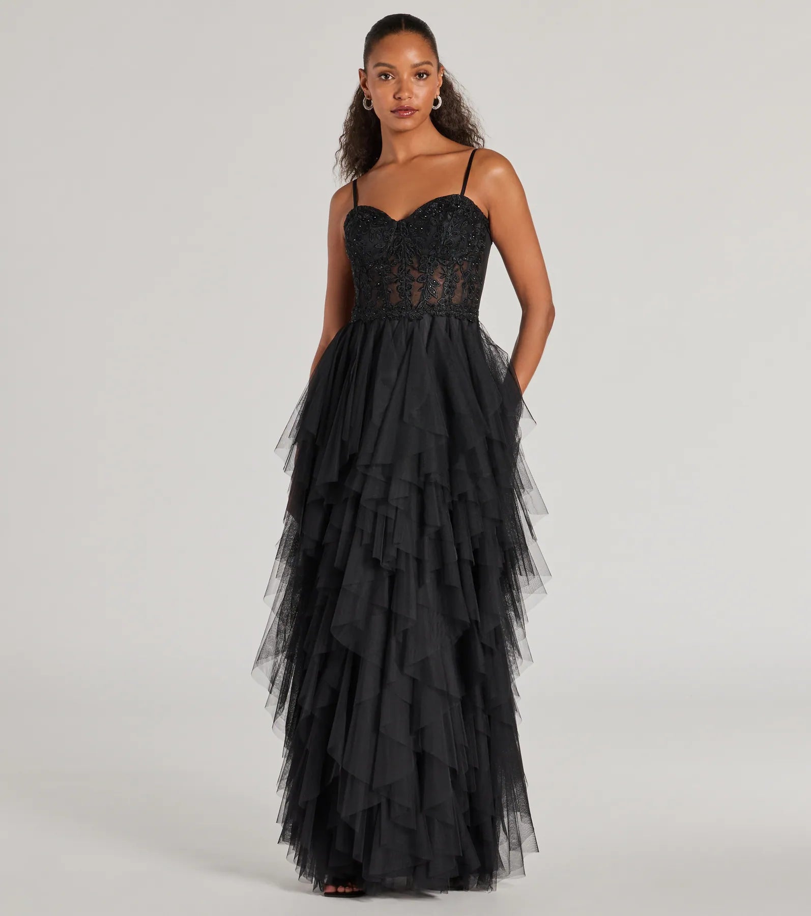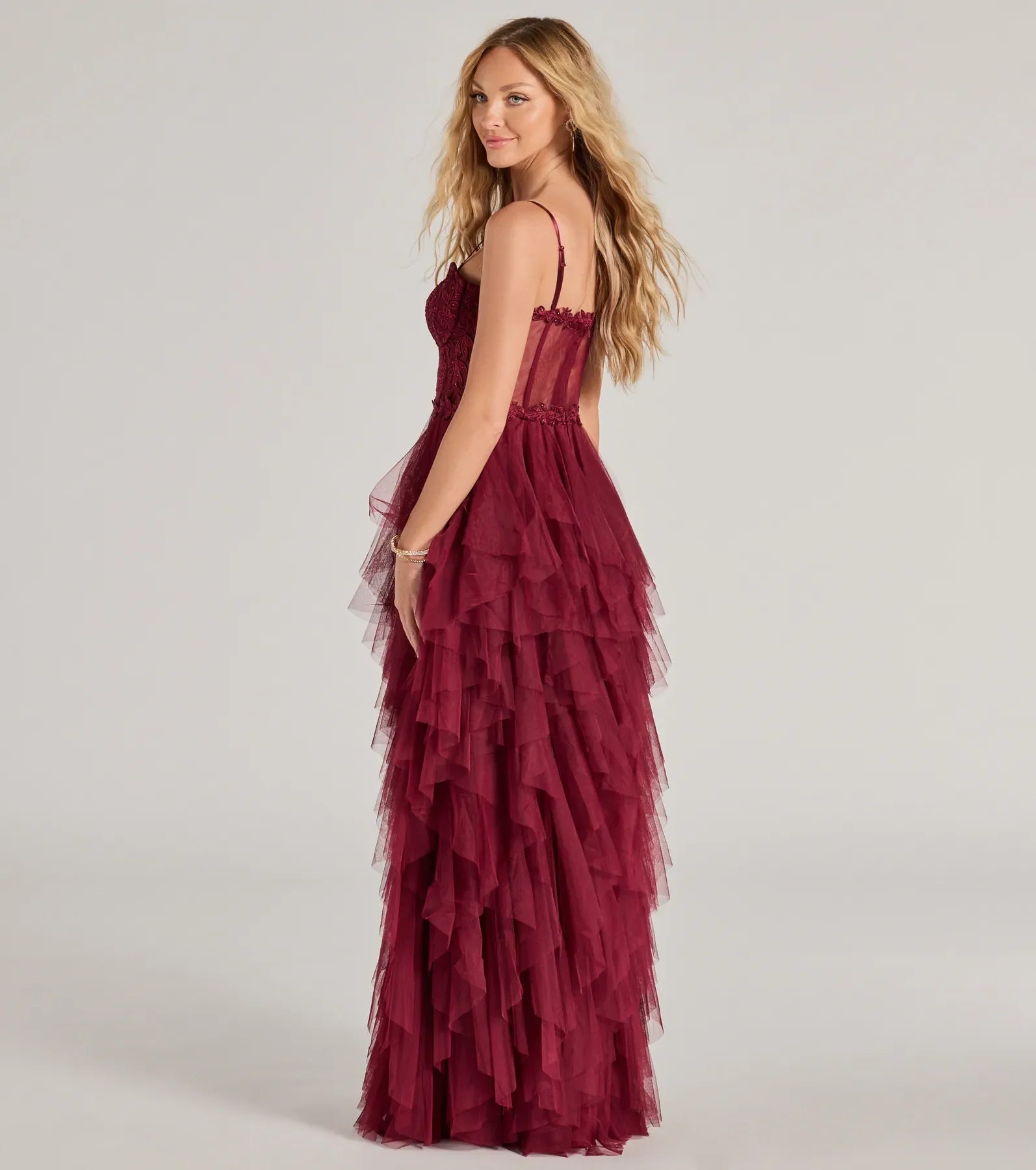 Live out your fairytale dream in the Keyla floral applique tiered ruffle tulle gown for an enchanting night! The corset bodice is sheer for that hint of allure. accented with a gorgeously chic floral applique with small rhinestones for a regal sparkle. The fitted high waist leads to a floor-sweeping tiered ruffle design to give you a voluminous effect for all the drama.