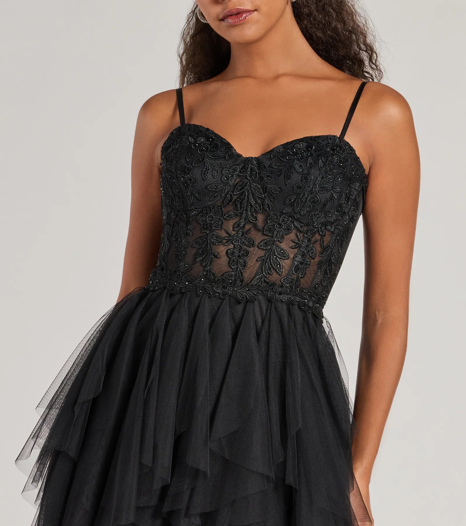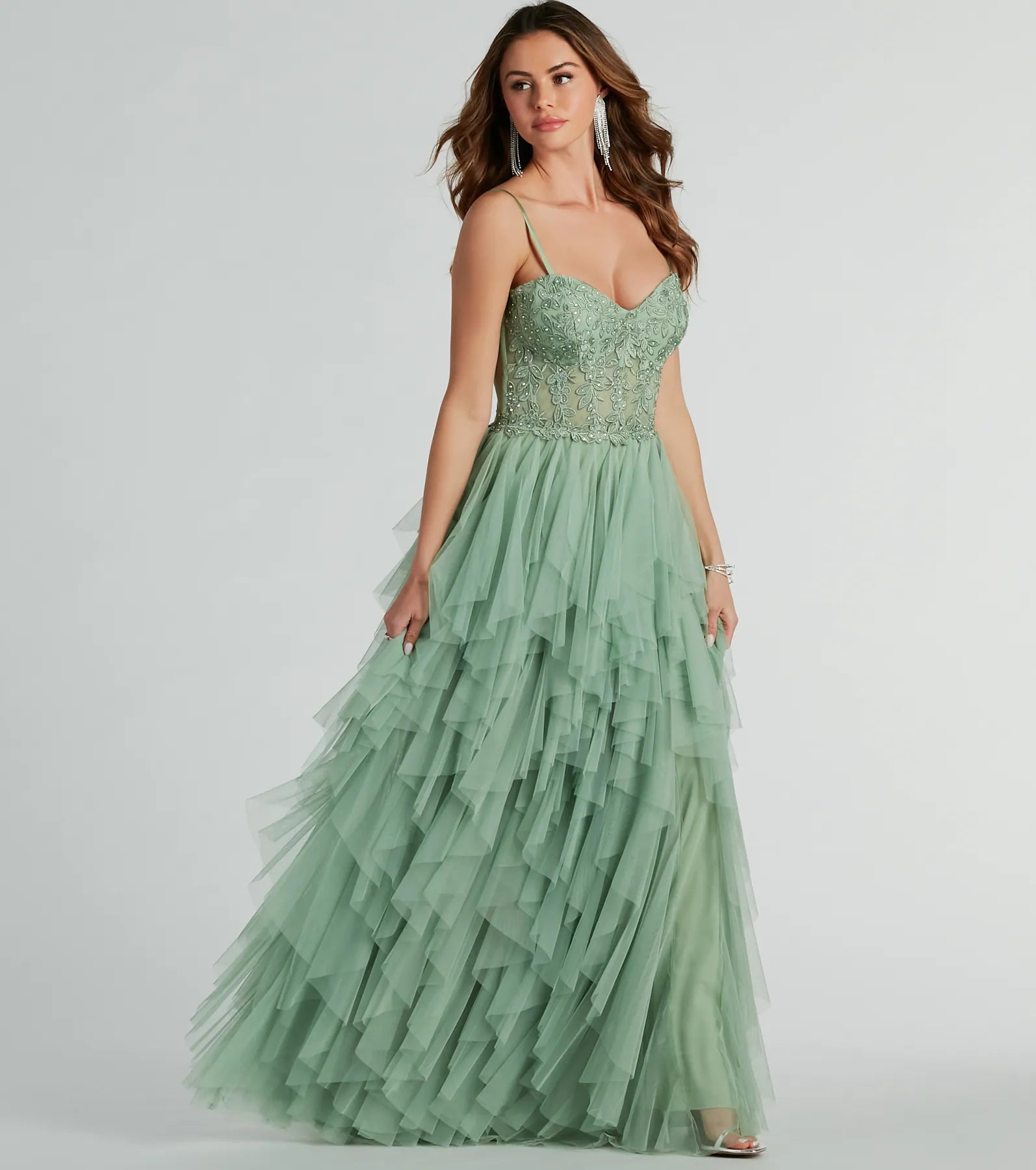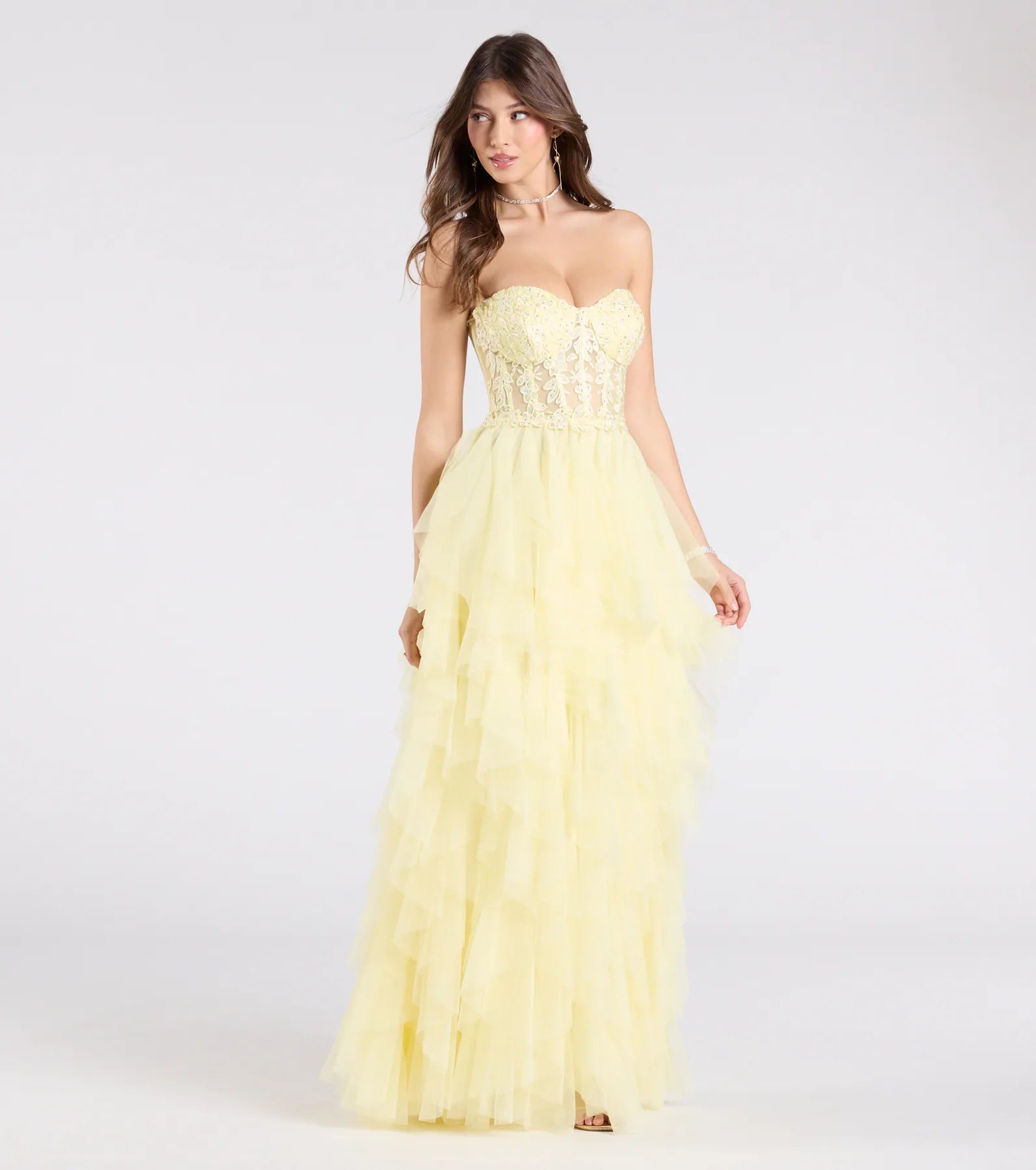 Live out your fairytale dream in the Keyla floral applique tiered ruffle tulle gown for an enchanting night! The corset bodice is sheer for that hint of allure. accented with a gorgeously chic floral applique with small rhinestones for a regal sparkle. The fitted high waist leads to a floor-sweeping tiered ruffle design to give you a voluminous effect for all the drama.