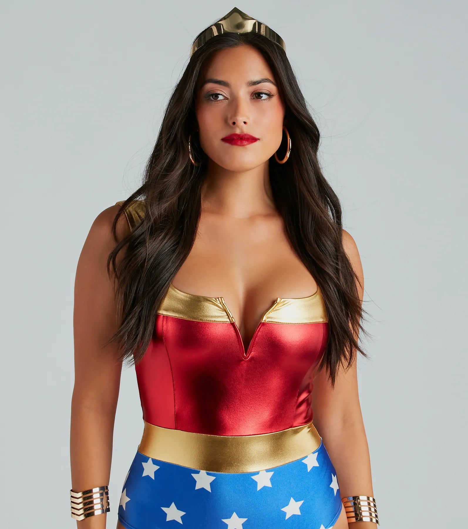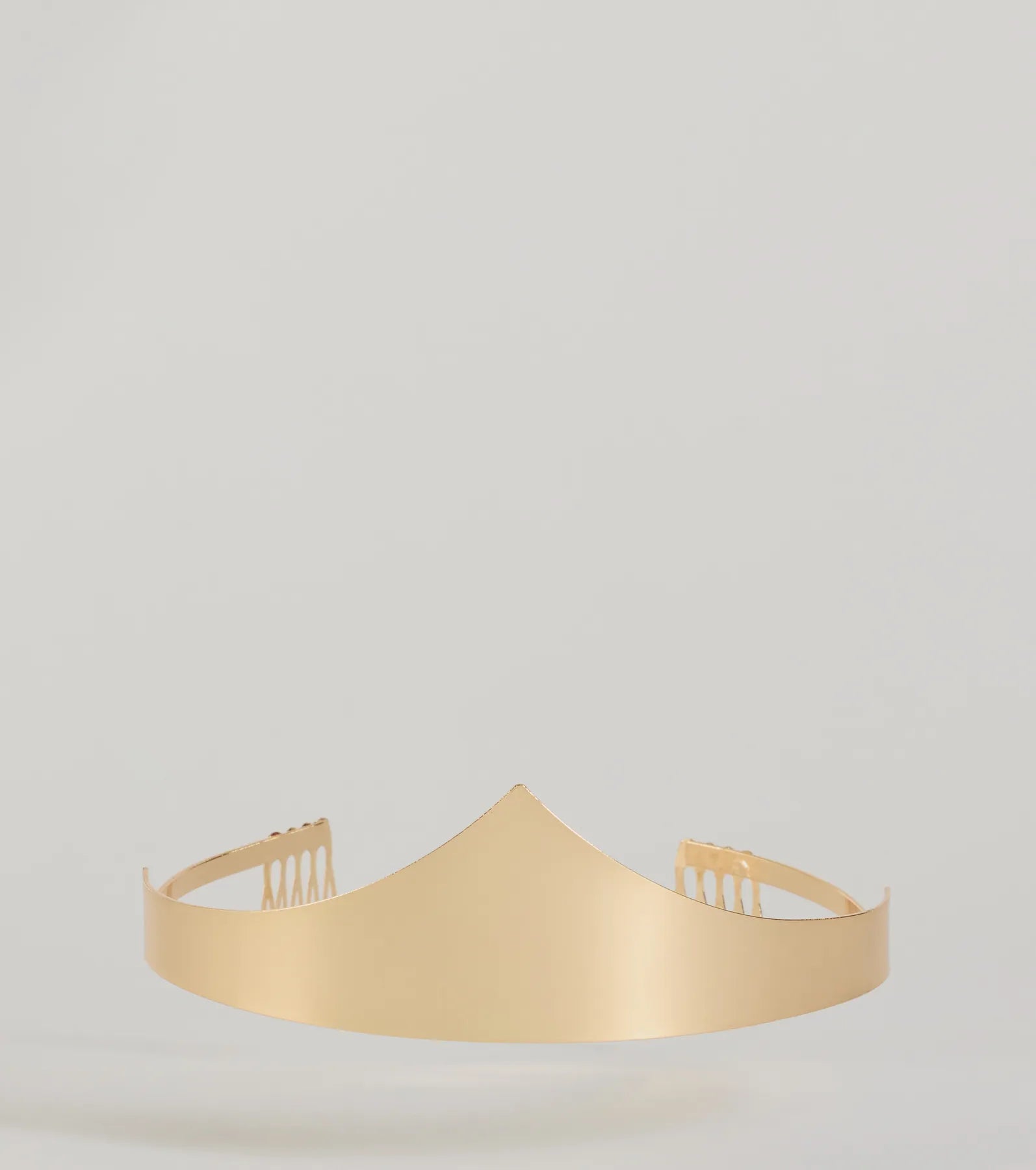 Take on the day as Lady Justice this Halloween with a chic metal headband to bring your costume together. Style with the metallic bodysuit. metal plate belt. and faux leather boots.