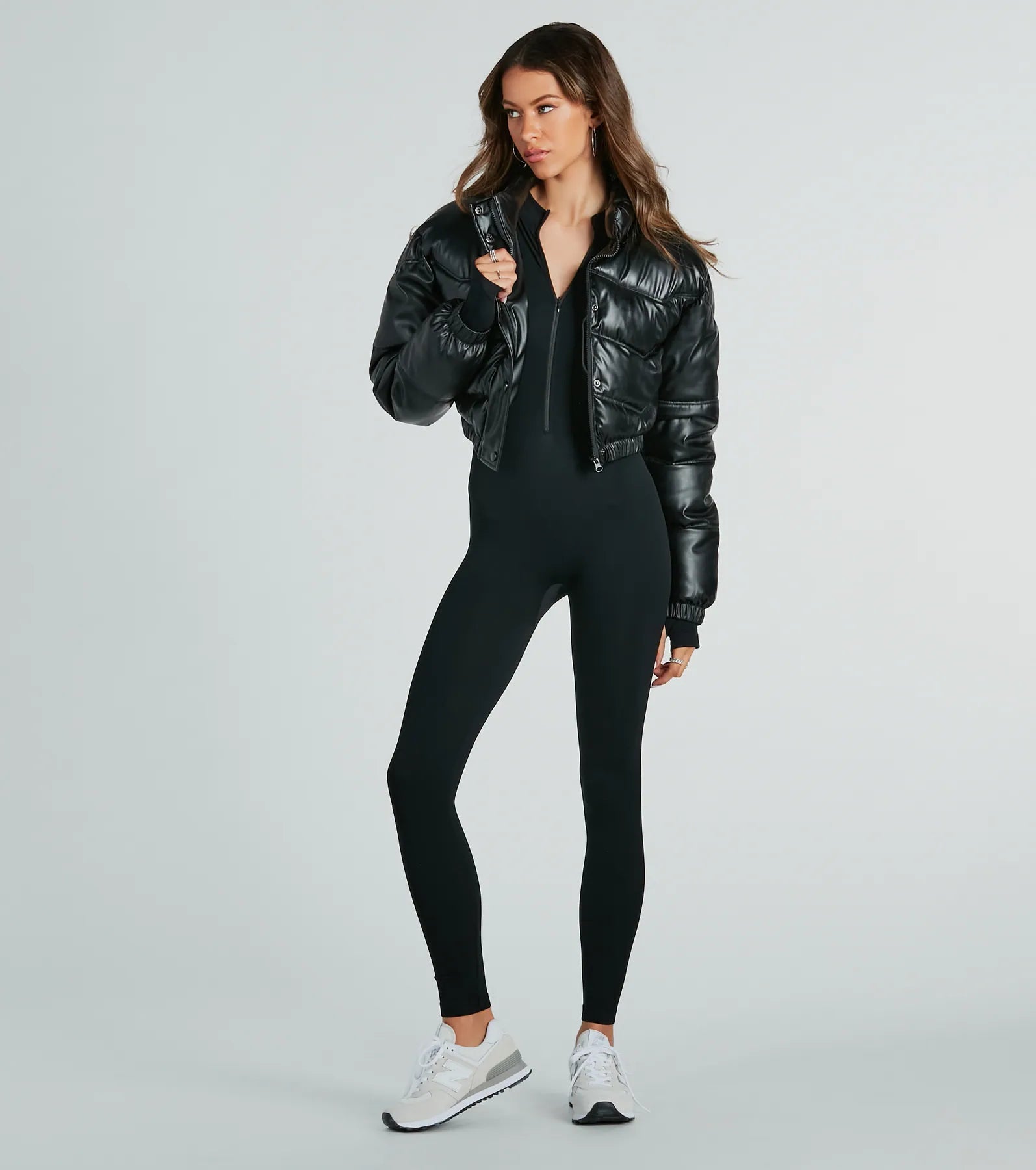 Check out the latest seamless catsuit for the greatest vibe of all time! It features fitted long sleeves. a crew neckline with a zip-up closure. a form-hugging fit. and a skinny-leg design on seamless knit fabric with plenty of stretch. Complete the look in a trendy for a coffee run and errands!