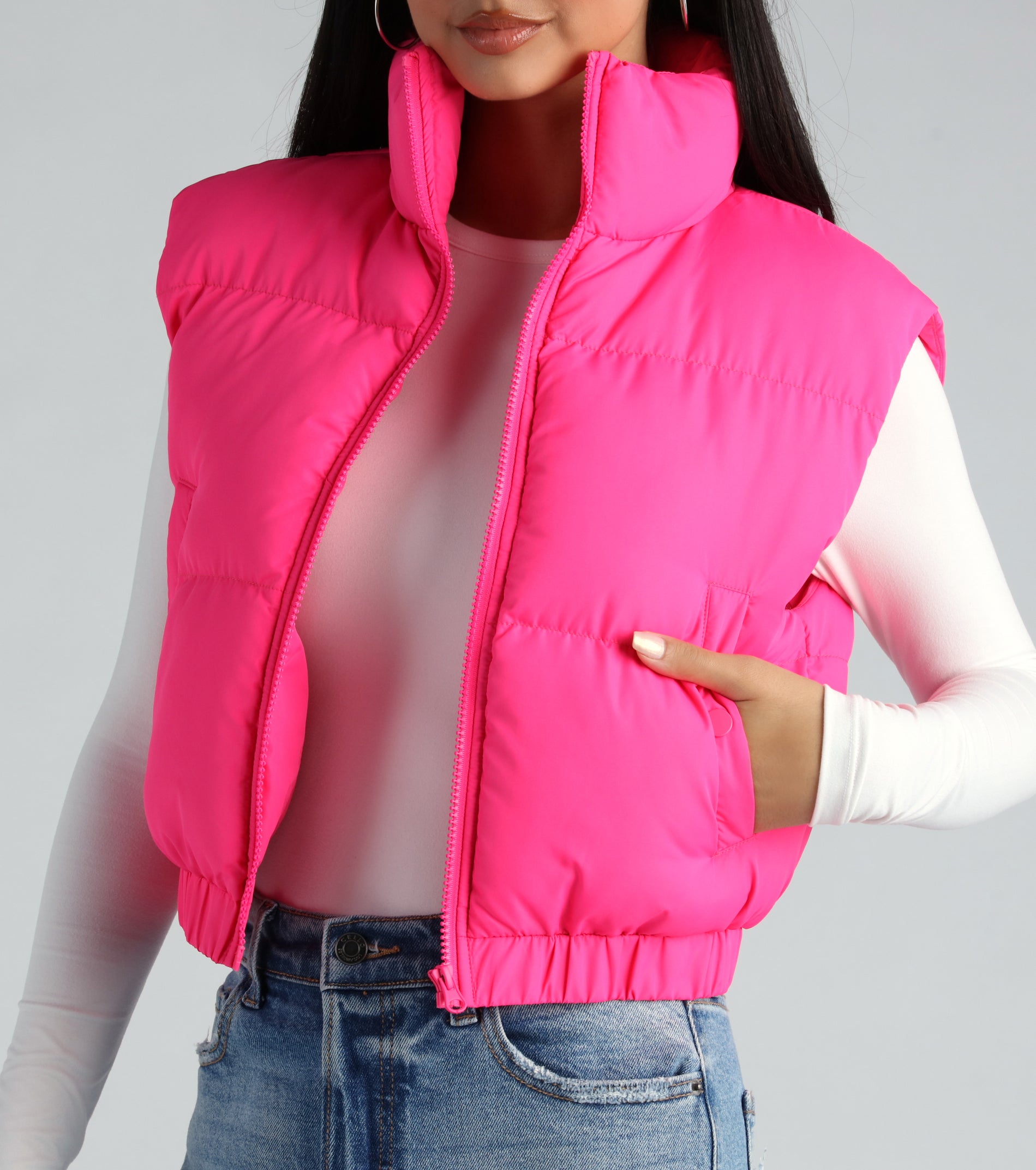 Style up your look in this puffer vest for the chilly season ahead!?Featuring a sleeveless design with a standing collar neckline. front zipper closure. and an elasticized cropped hem. Crafted with an insulated nylon woven fabric and hidden side pockets with snap-button closures for extra comfort and warmth. Complete the look in a and jeans for a coffee run and errands!