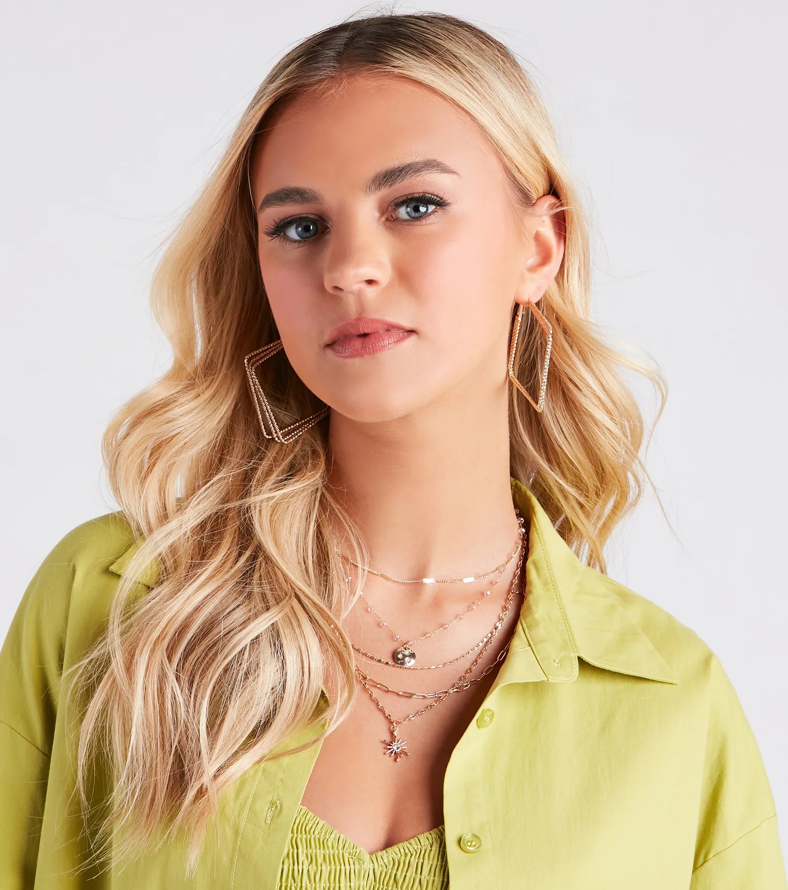 You’ll be layered in trendy glamour with this dainty necklace set. It features five necklaces with varying designs. including a dainty chain with sleek bar accents. a beaded chain with a circle charm with mini rhinestone stars. a flat chain. a paperclip chain. and a dainty chain with a star charm with a rhinestone center detail. Style the set all together with a to dress it up!