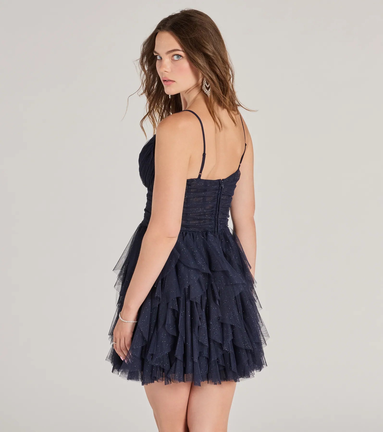 The Leanna glitter mesh skater dress features a fitted ruched bodice with a sheer waist insert and a cascading ruffled skater skirt creating an iconic fit-and-flare silhouette for a voluminous effect. Style with metallic heels for homecoming or a formal party!