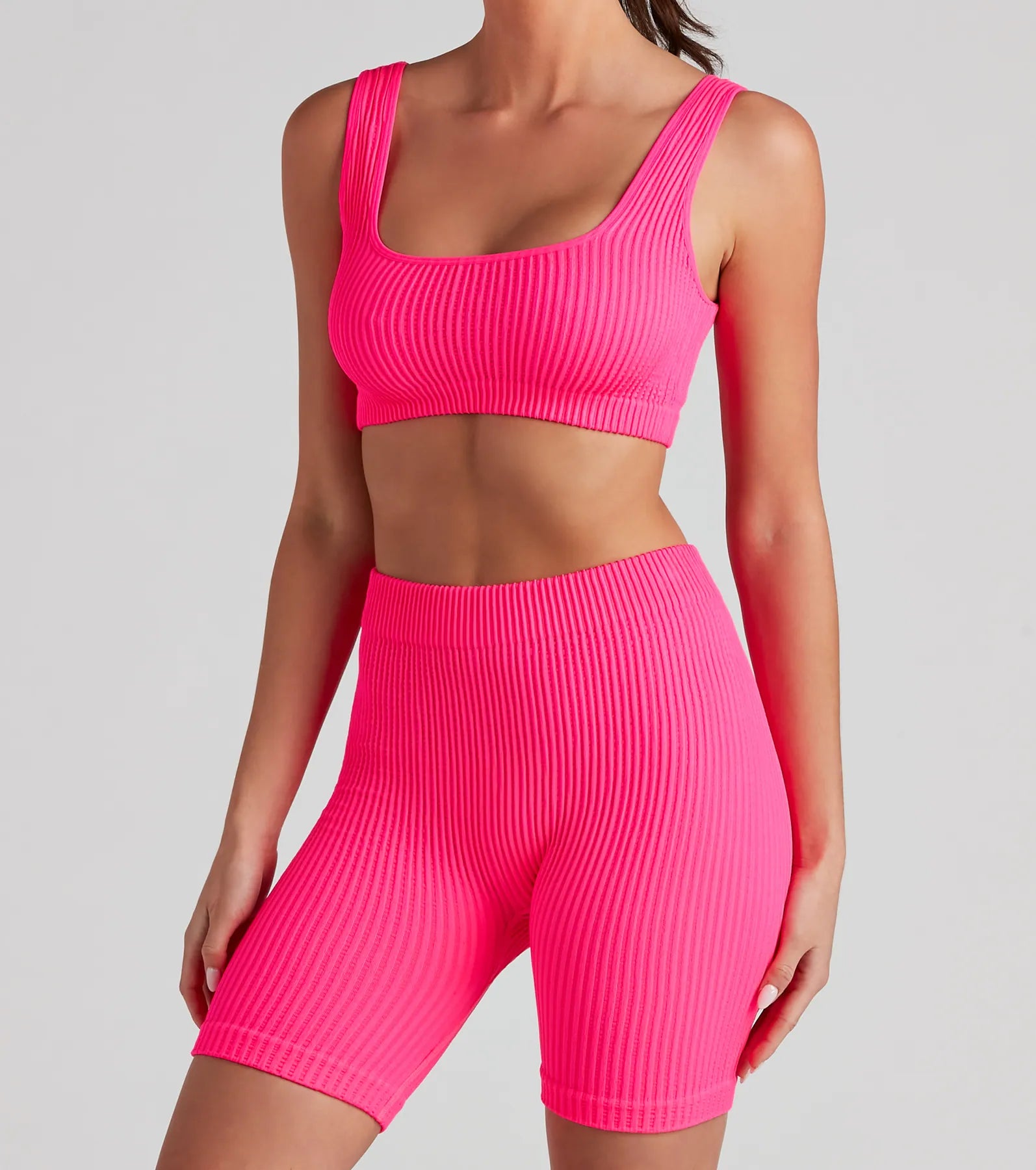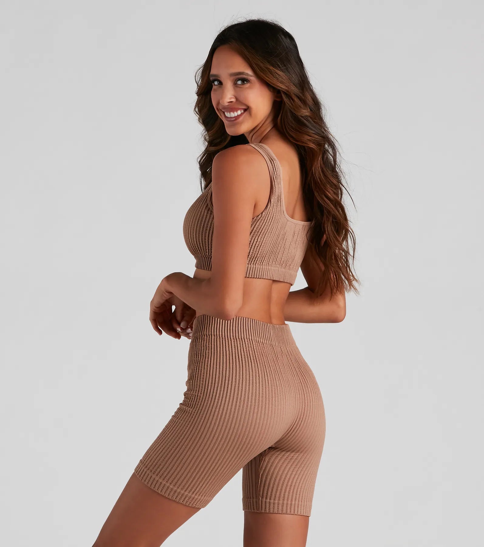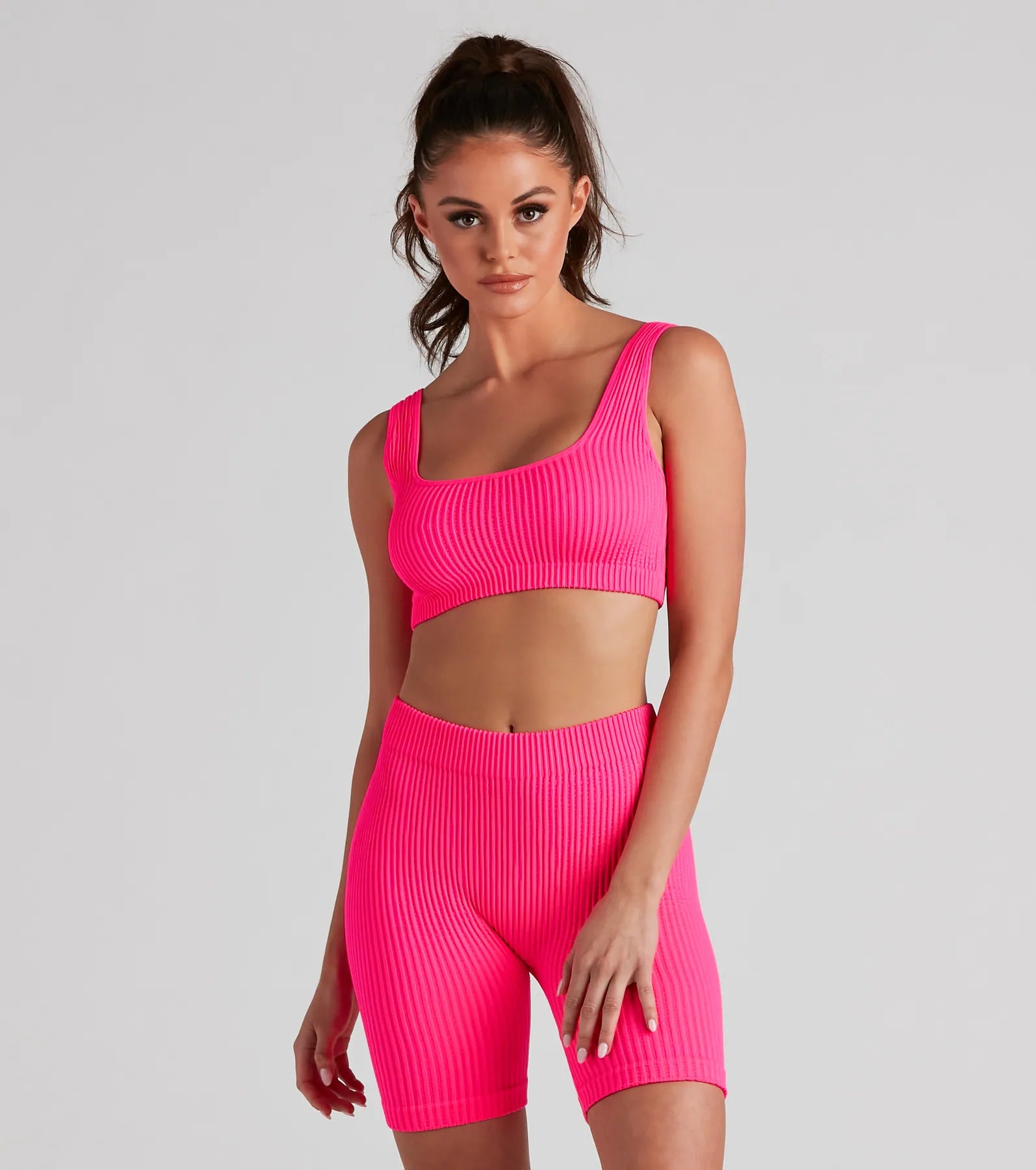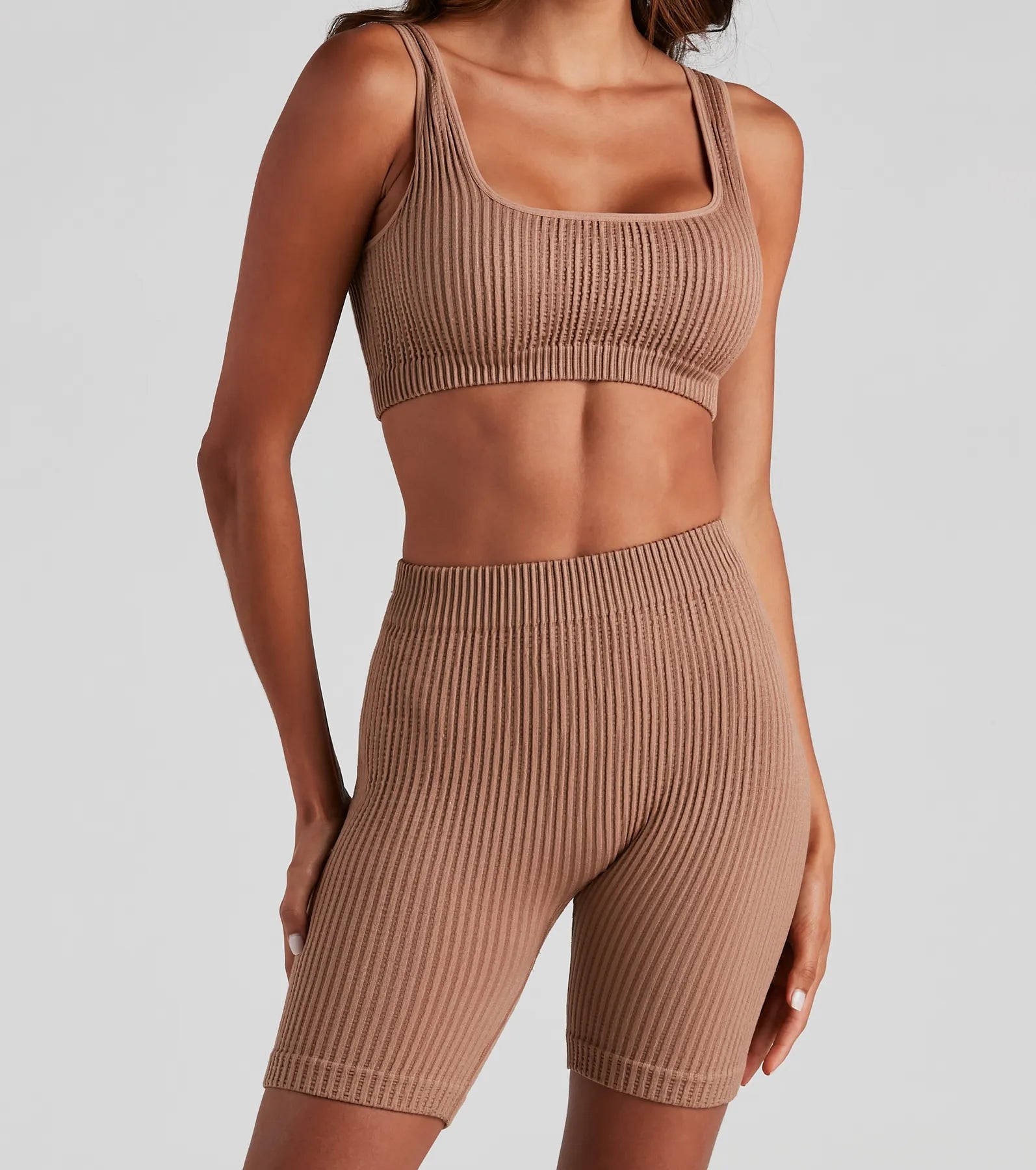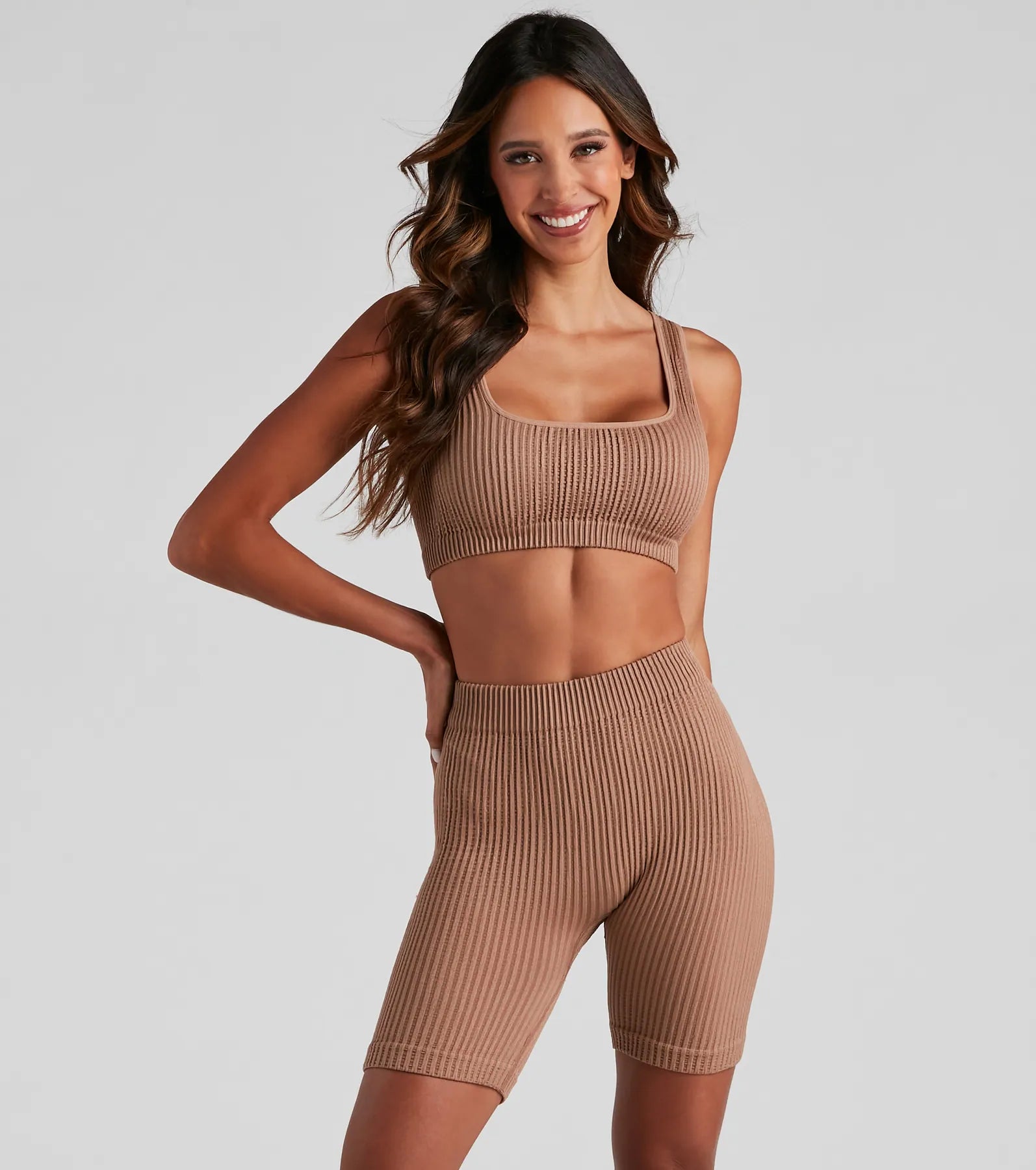 The perfect ribbed bra for living your life of leisure! It features a sleeveless. square neckline. tank-style straps. and a soft and comfortable seamless knit design. Complete the look in the matching shorts.?