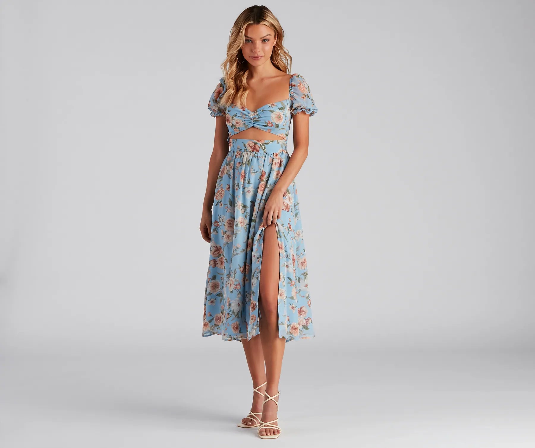 This floral cutout midi dress makes getting ready a breeze! It features short puff sleeves and a ruched sweetheart bodice with a flirty waist cutout that leads to a flowy. midi-length silhouette with a slit accent. Composed of a chiffon-lined fabric with no stretch. Style with a trendy