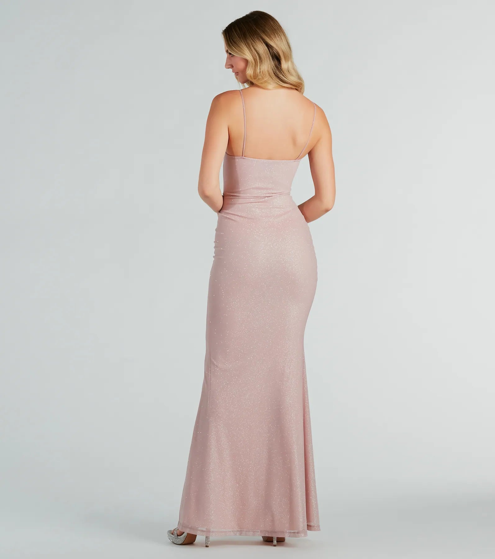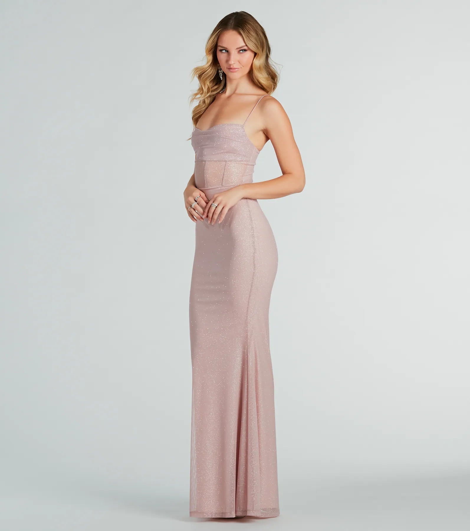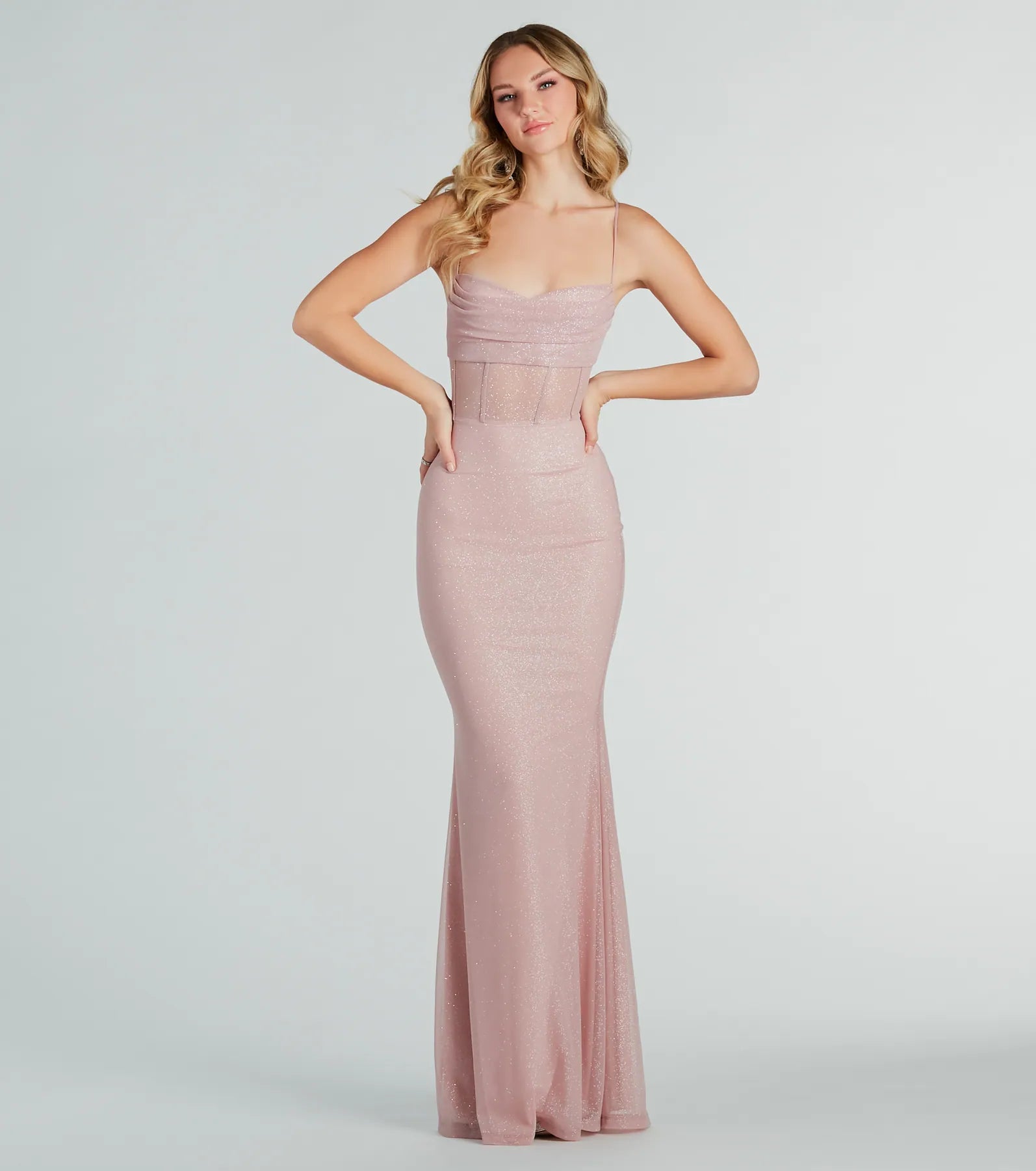 Captivate every audience in the Liv formal glitter long dress with your shimmer! She features a sweetheart neckline with a cowl draping. spaghetti straps. a chic sheer corset-trim bodice. and a curve-hugging mermaid silhouette with a graceful floor-length hem. The formal maxi dress is composed of a sparkly glitter mesh fabric with a stretchy knit lining. Finish the look with for a fancy birthday soiree or party!
