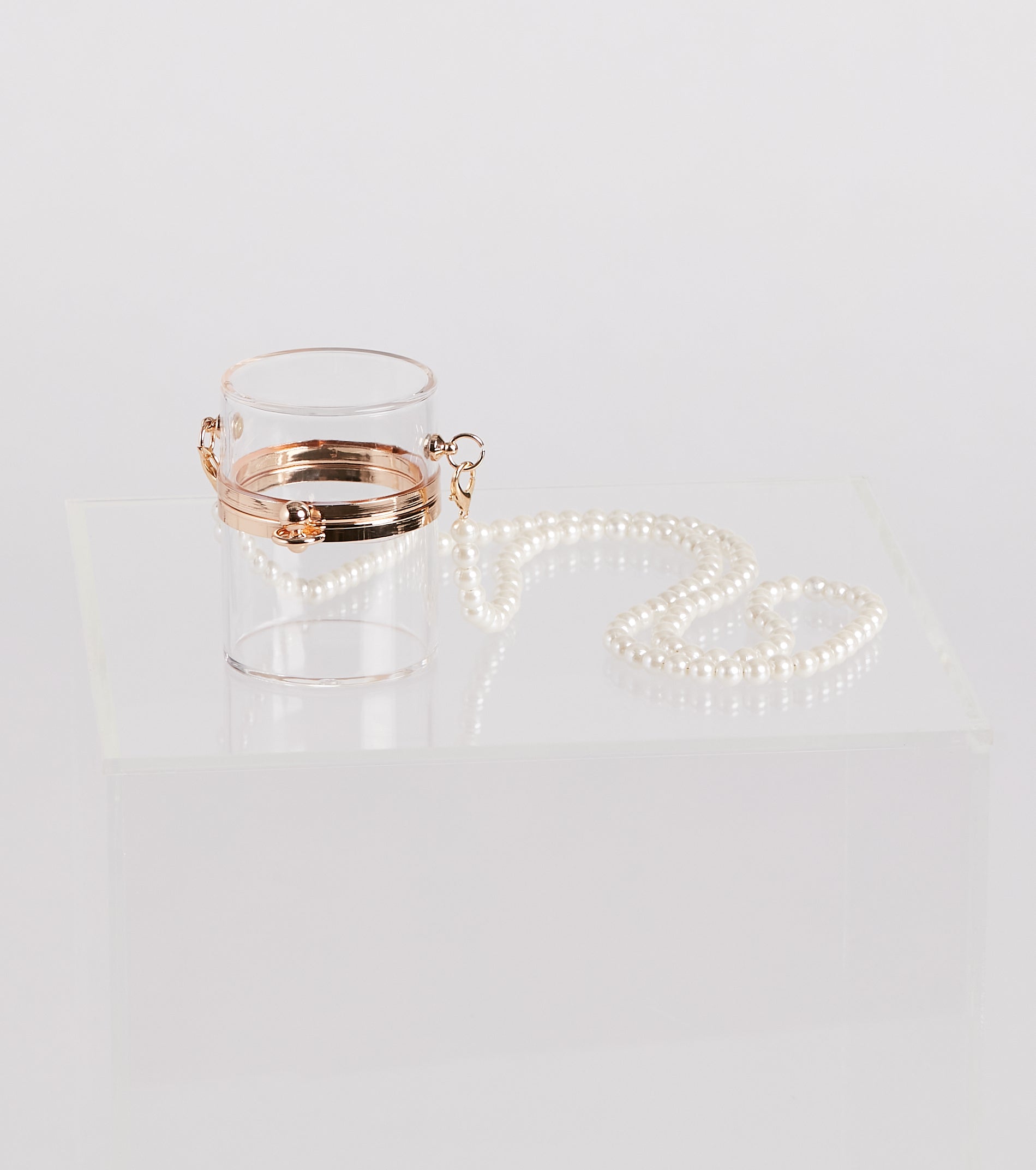 Live the chic life with this ultra-glam clear crossbody bag! It features a clear design with a mini cylinder shape. a gold metal trim with a clasp closure. and a long detachable faux pearl crossbody strap. Style with sparkling .