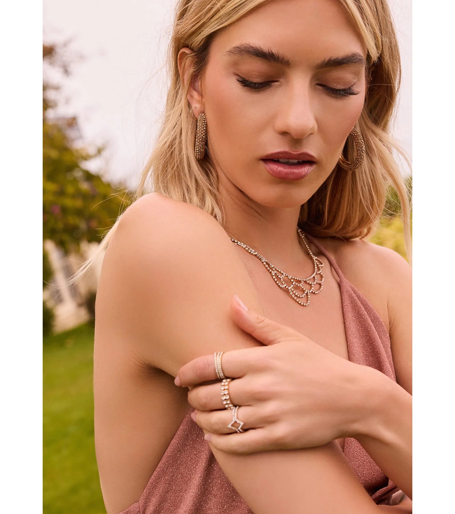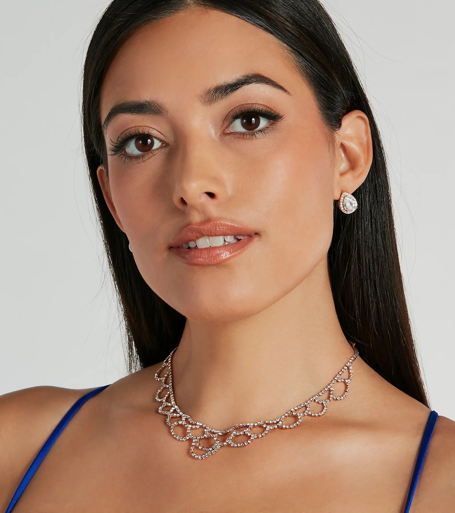 Add that luxe touch to your formal looks with this stunning rhinestone scalloped collar necklace. It features a dainty detailed scalloped design with a single row of rhinestone embellishments for a gorgeous shimmer. Style with .