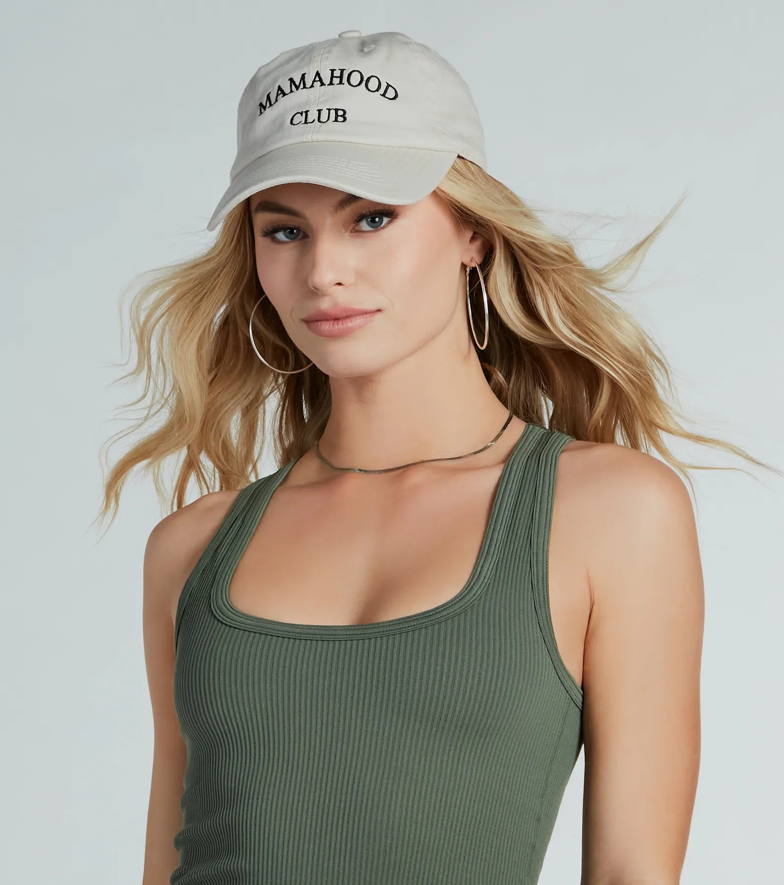 Show off your proud mom status in style with this classic baseball cap! Features an embroidered Mamahood Club on the front. adjustable pull-tab for a comfortable fit. and curved brim to help shade on cotton material. Complete the look in a for running errands or coffee meet-ups with other mamas!