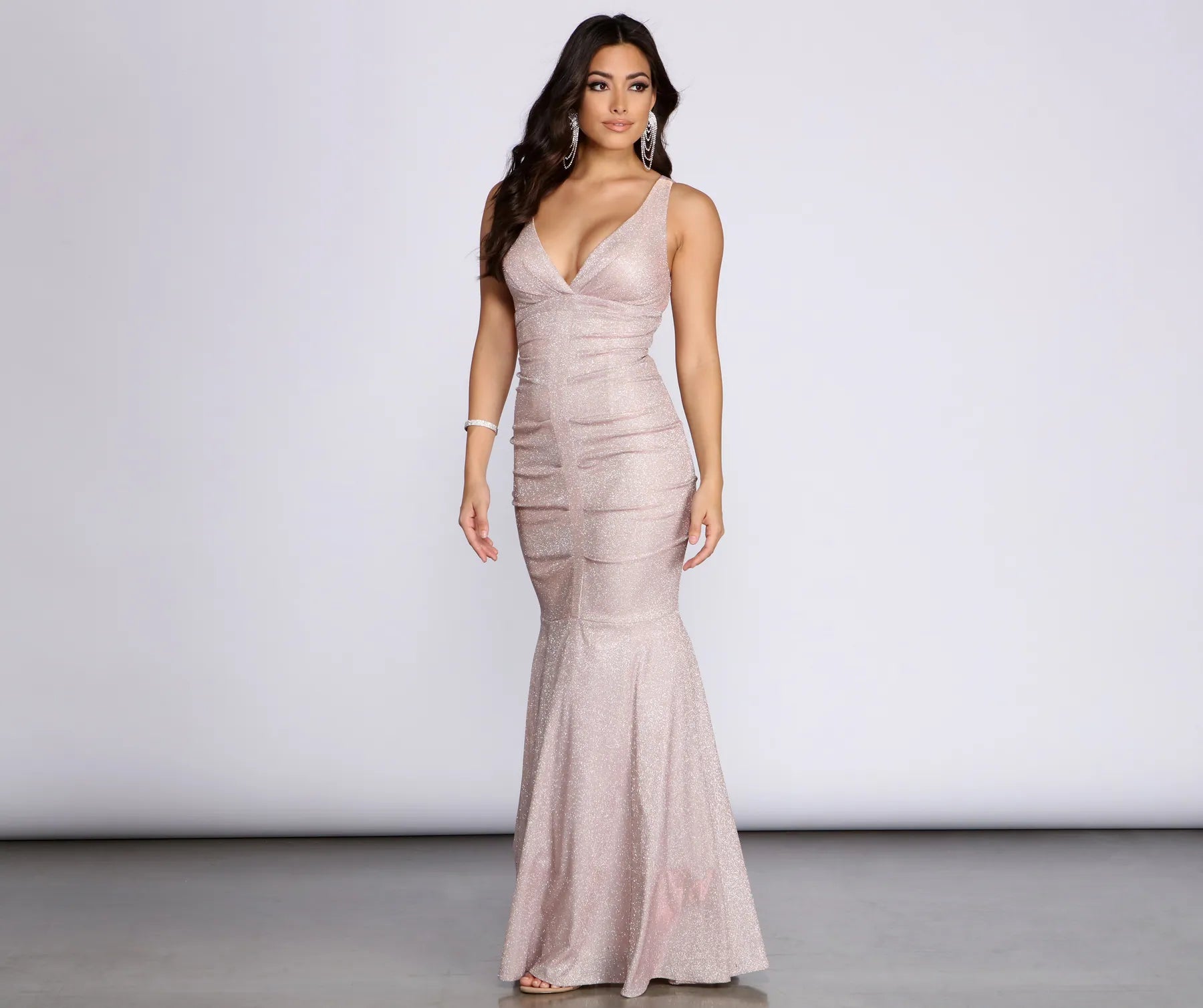 Who doesn’t love to shimmer in glitter??Our elegant Martina showcases a pin-tucked bodice that trails into a flattering mermaid silhouette.?Accessorize and highlight your glow with some stunning sparkling jewelry!?