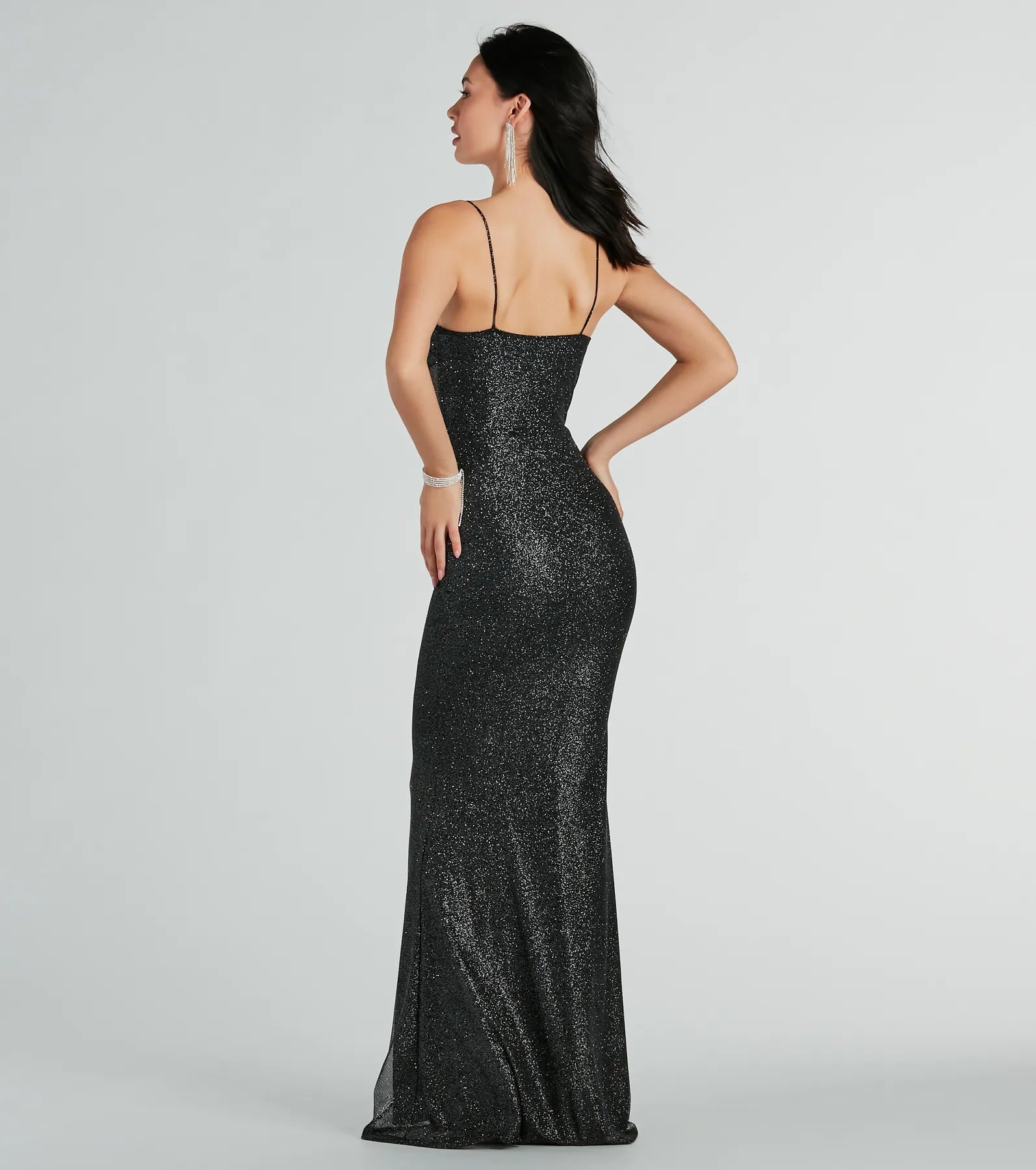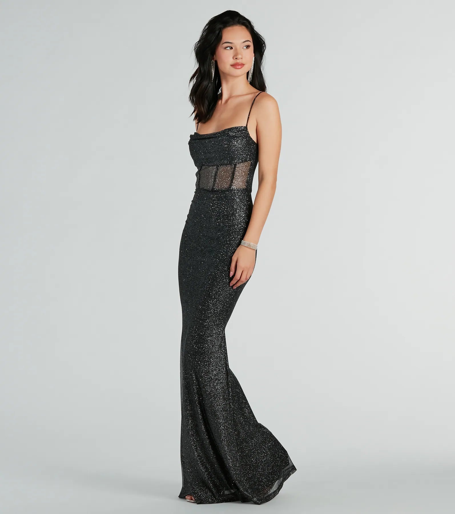 Glitter amplifies the brilliant sparkle on the Maryam formal long dress perfect for any fancy affair! She features a sweetheart cowl neckline. spaghetti straps. a sultry sheer corset-trim bodice atop a flattering mermaid silhouette with a graceful floor-length hem. The formal maxi dress is crafted from an airy glitter mesh fabric that shimmers from every angle and has a stretchy full knit lining. Complete the look with a for a school dance or red carpet event!