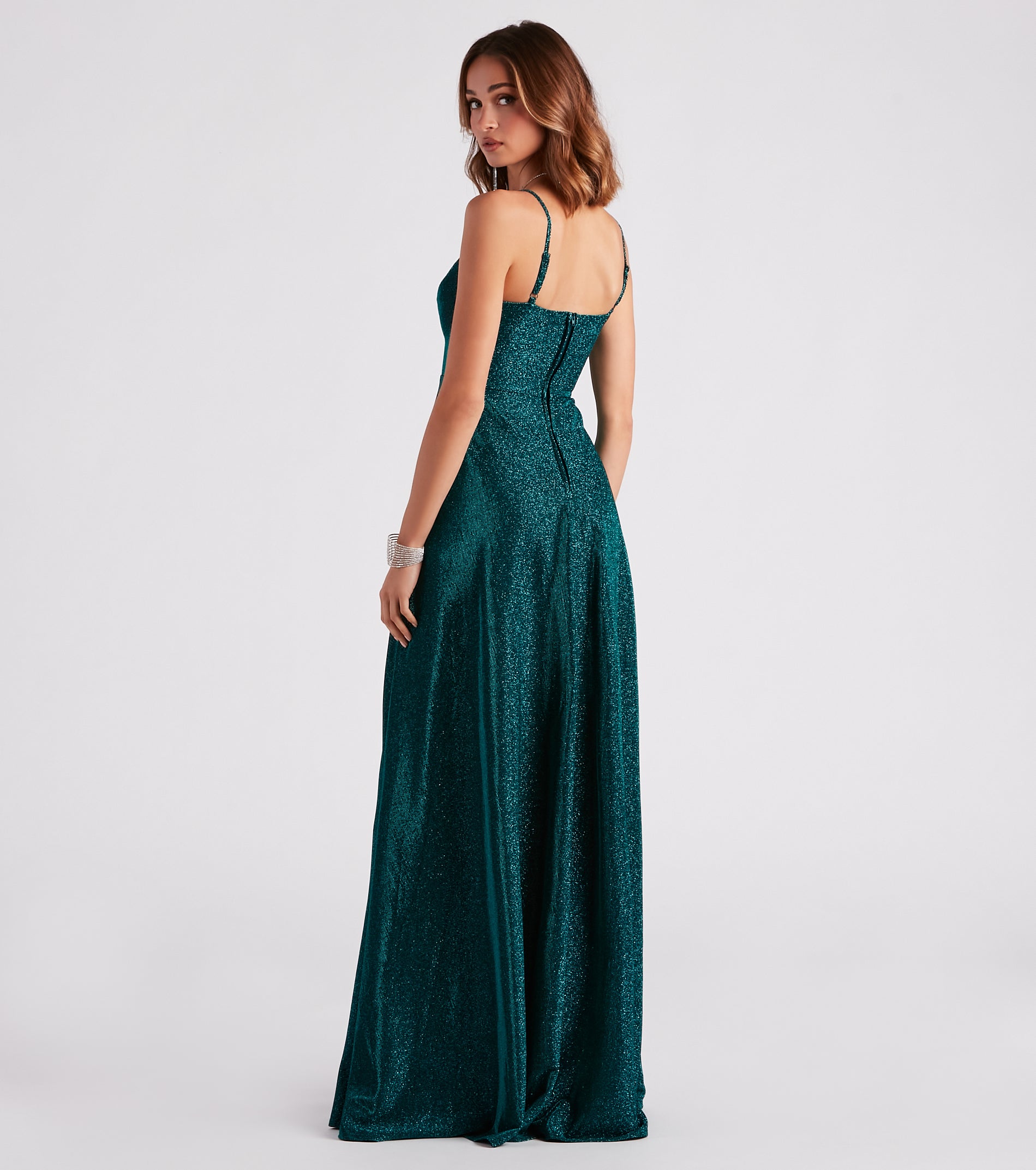 Mesmerizing glitter shines with every step on Mckenna formal dress making your way into a ball or school dance! She features a sleeveless V-neckline. a lightly padded bust. adjustable spaghetti straps. and a high-waist seam with hidden side pockets for keeping your hands warm. Her flattering A-line silhouette is designed with a high-cut front slit to show some skin along the floor-length hem. The formal dress is composed of a glitter woven fabric with a stretchy knit lining. Complete the look with a and heels.