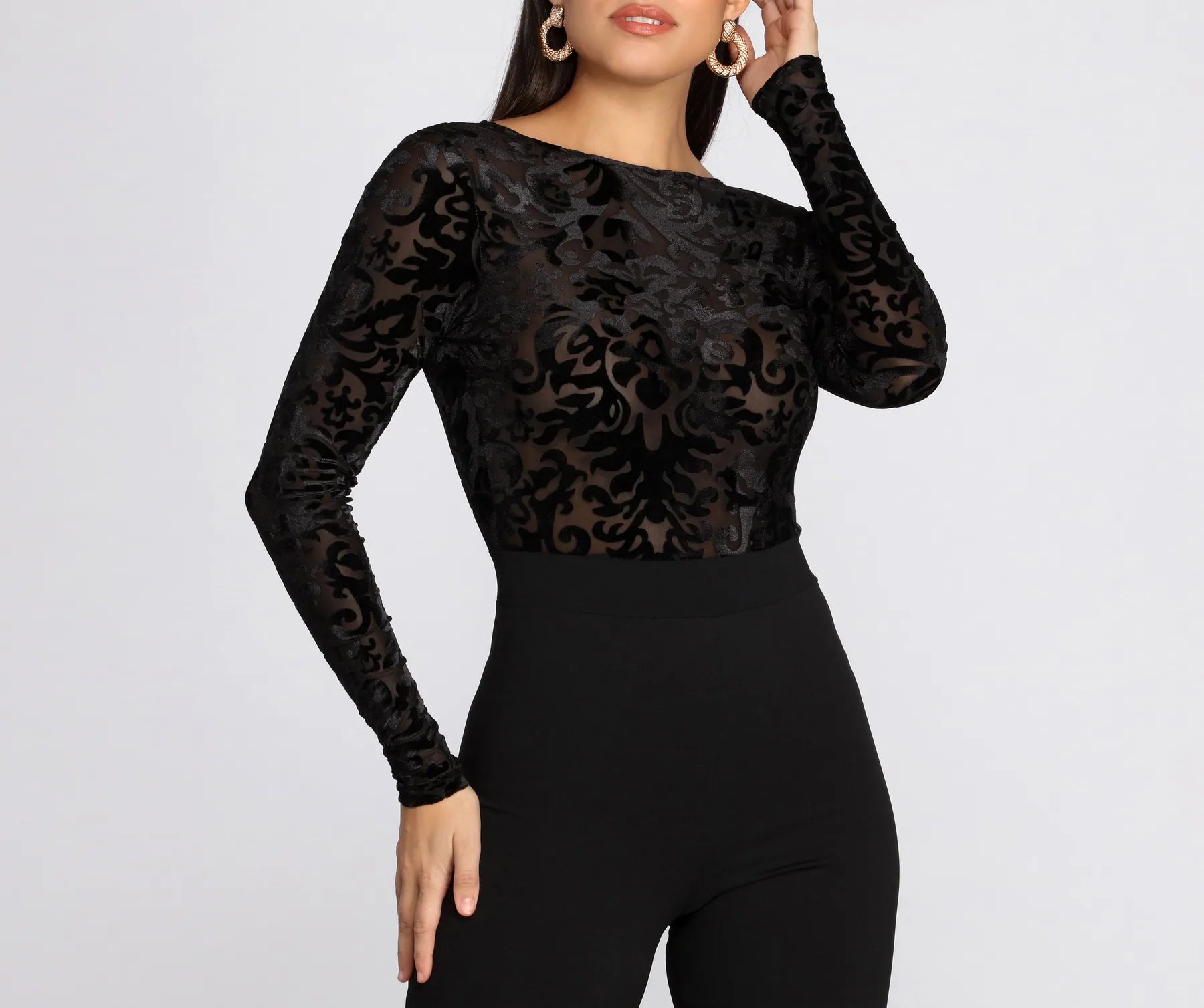 - Semi-Sheer Mesh Top With Flocked Velvet Prints Throughout