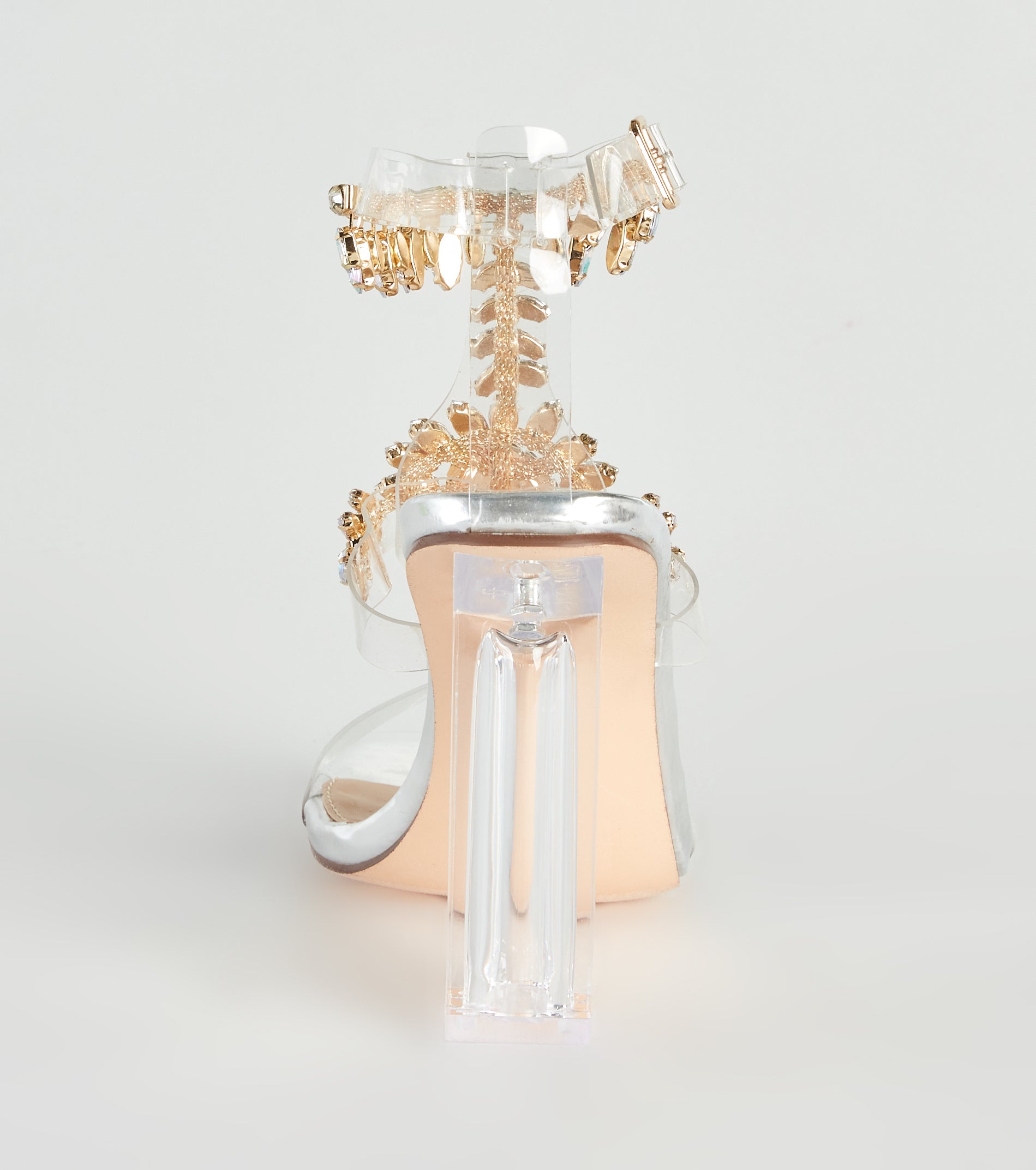 These gorgeous iridescent gemstone clear heels will radiate a glamorous sparkle. They feature an open square toe. a clear caged strap design. stunning iridescent gemstone embellishments with gemstone fringe and a center teardrop-shaped gemstone accent. a clear lucite block heel. and a chrome faux leather trim on the insole. Style with a .