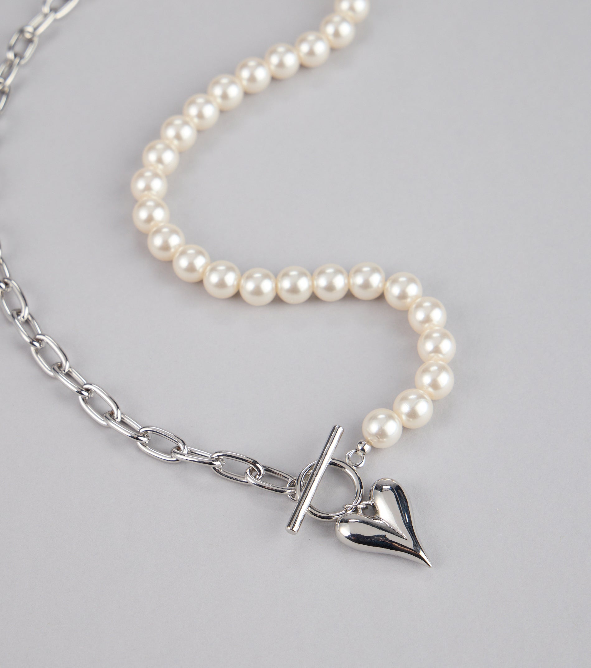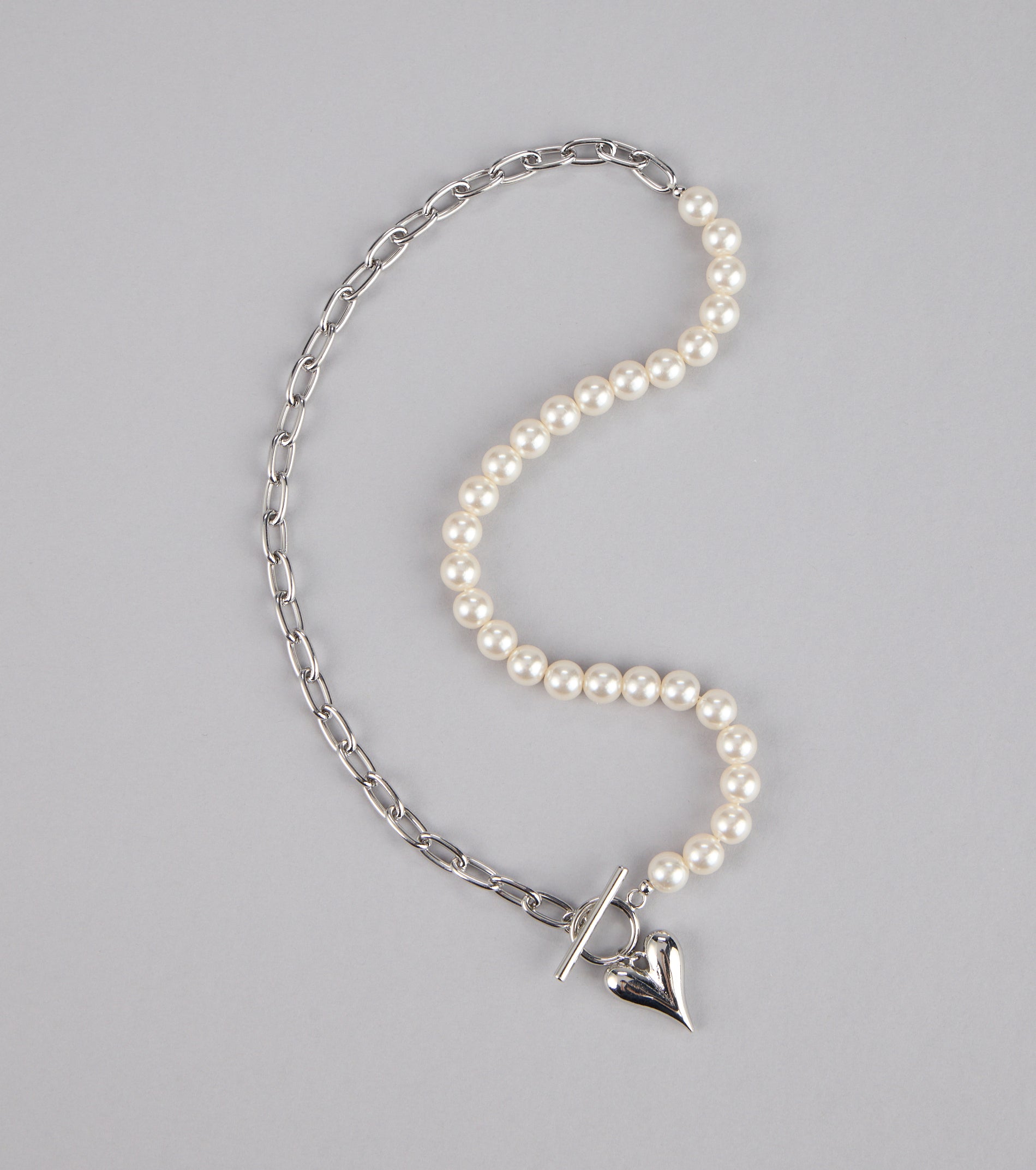 Half classic. half edgy??this chain and pearl necklace is finished with a heart charm for the perfect mix of sweet and street. The kind of piece that makes your whole outfit look intentional.