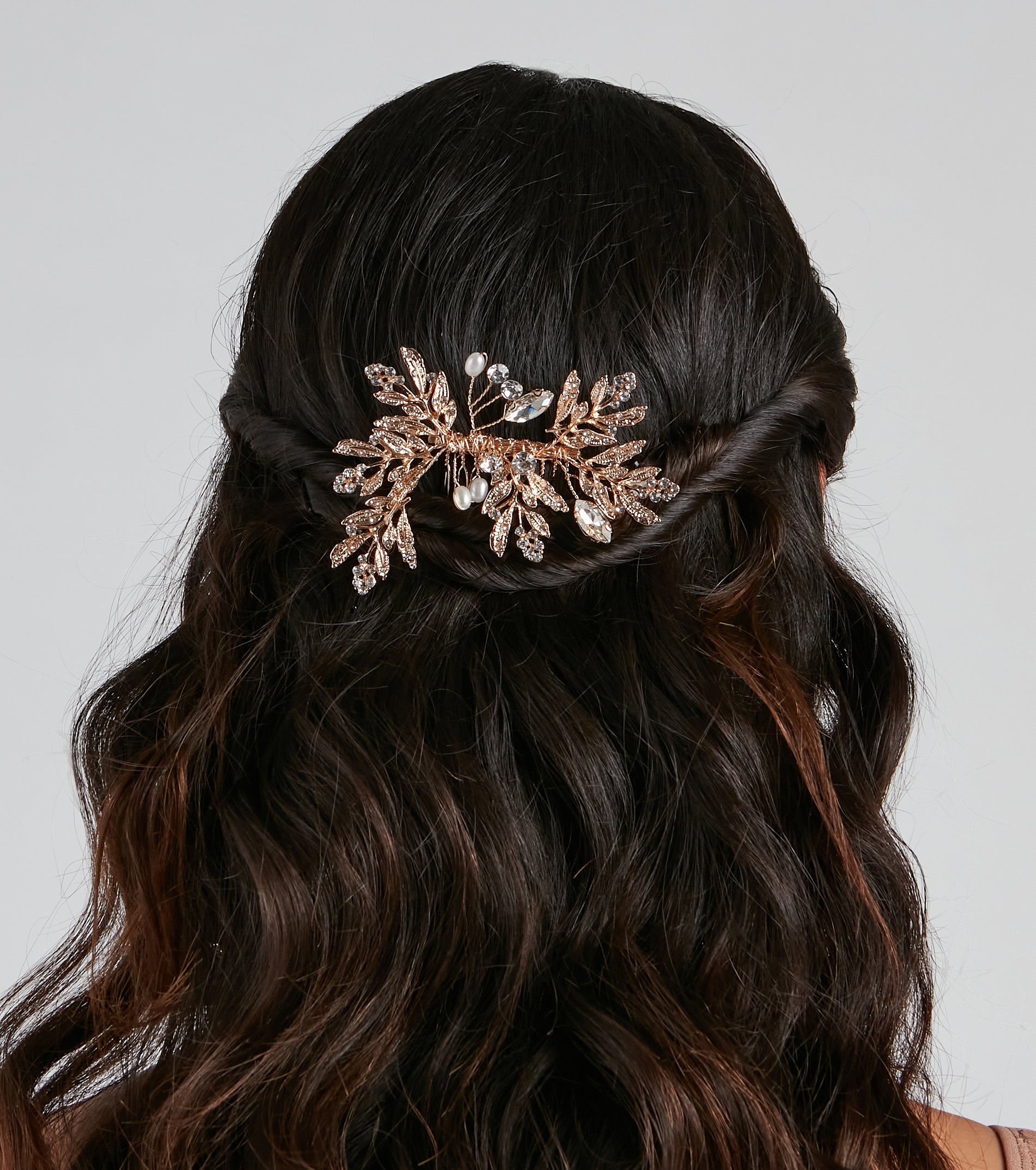 Show your love for mother earth in this enchanting hair comb featuring sprawling leaves decorated with rhinestones and faux pearl insets on a gold metal frame. Complete the look in a classy and heels.