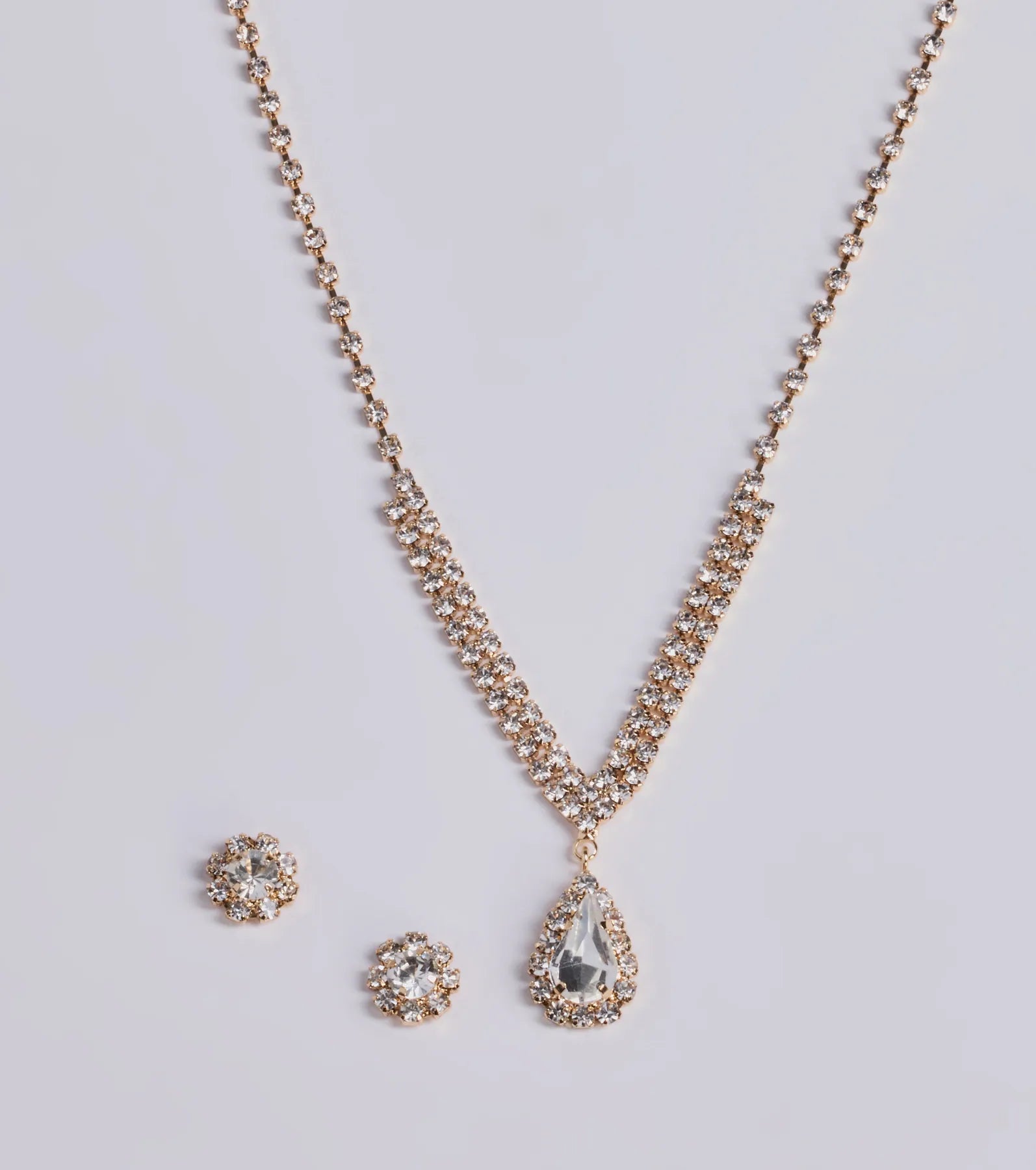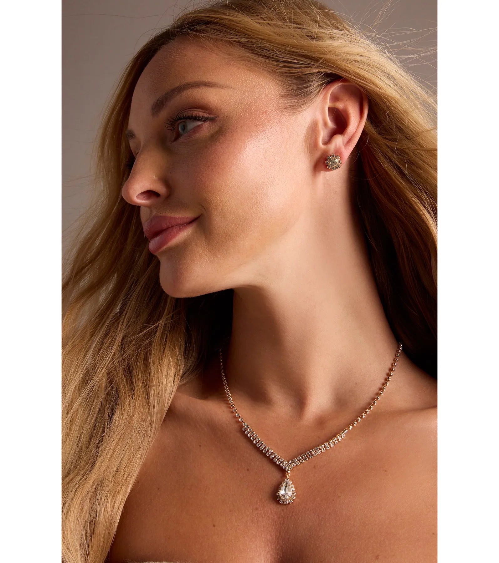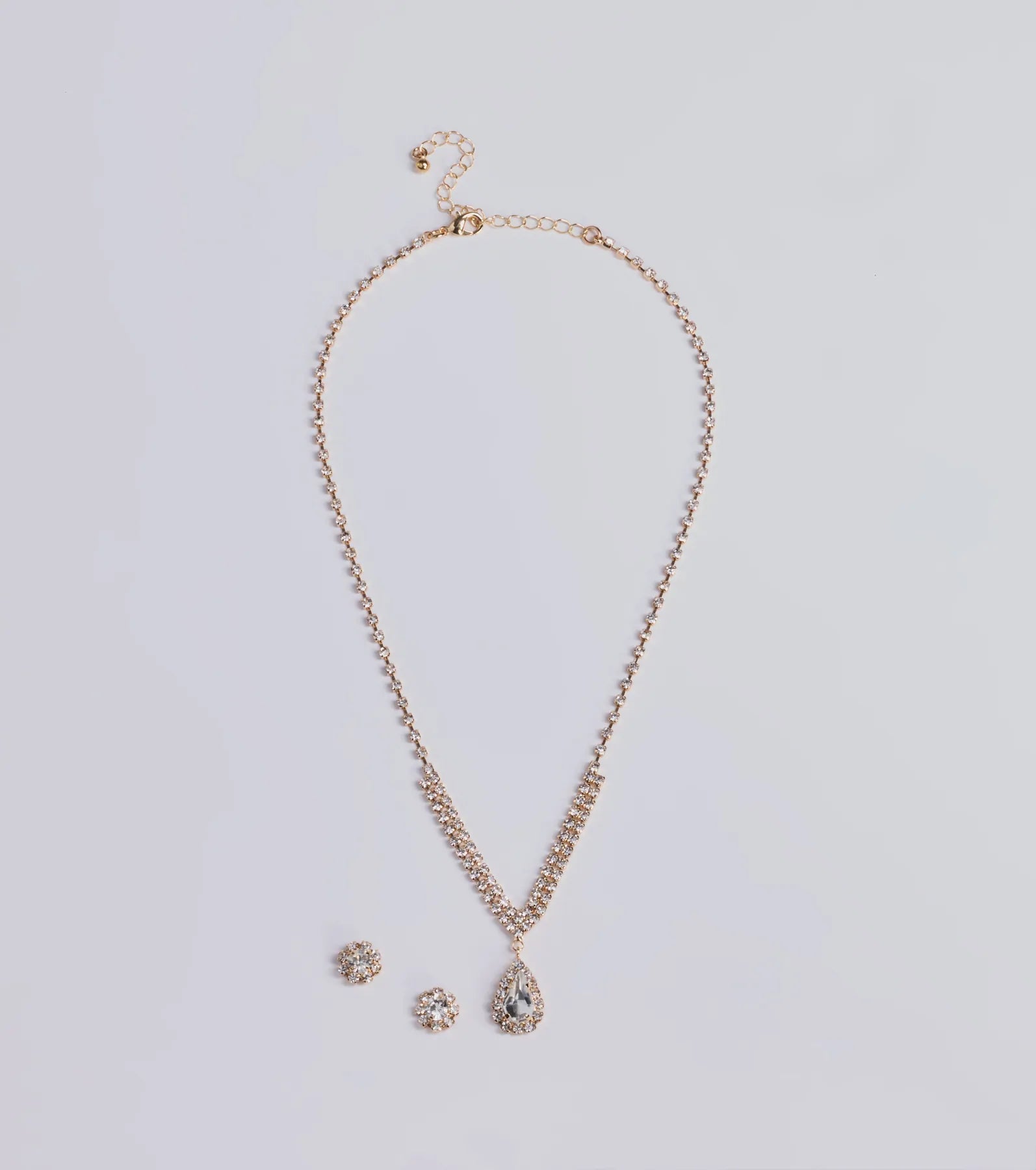 A necklace and earrings set features one pair of stud rhinestone earrings and one necklace with a rhinestone teardrop. Style with a formal satin dress for a special event.