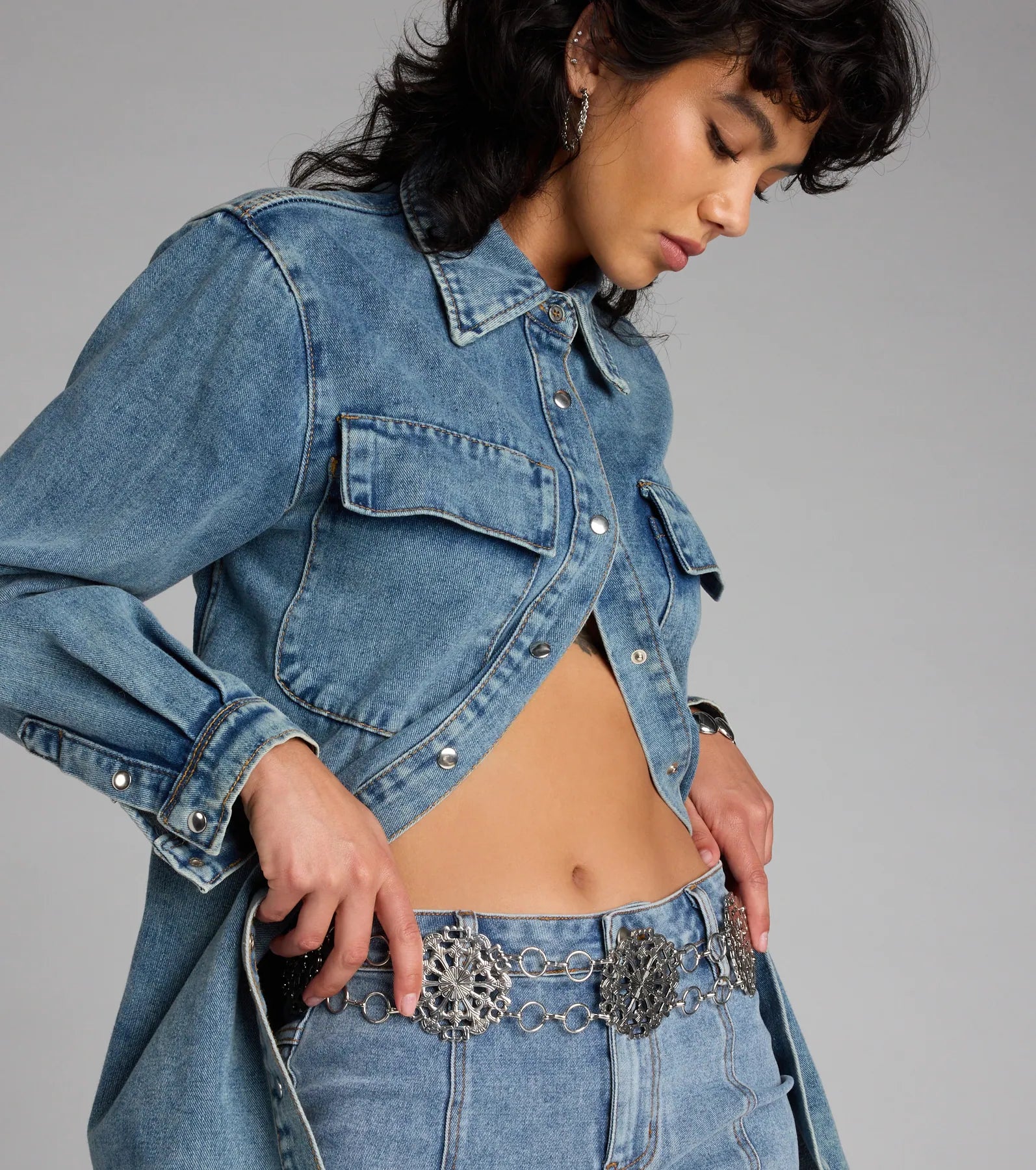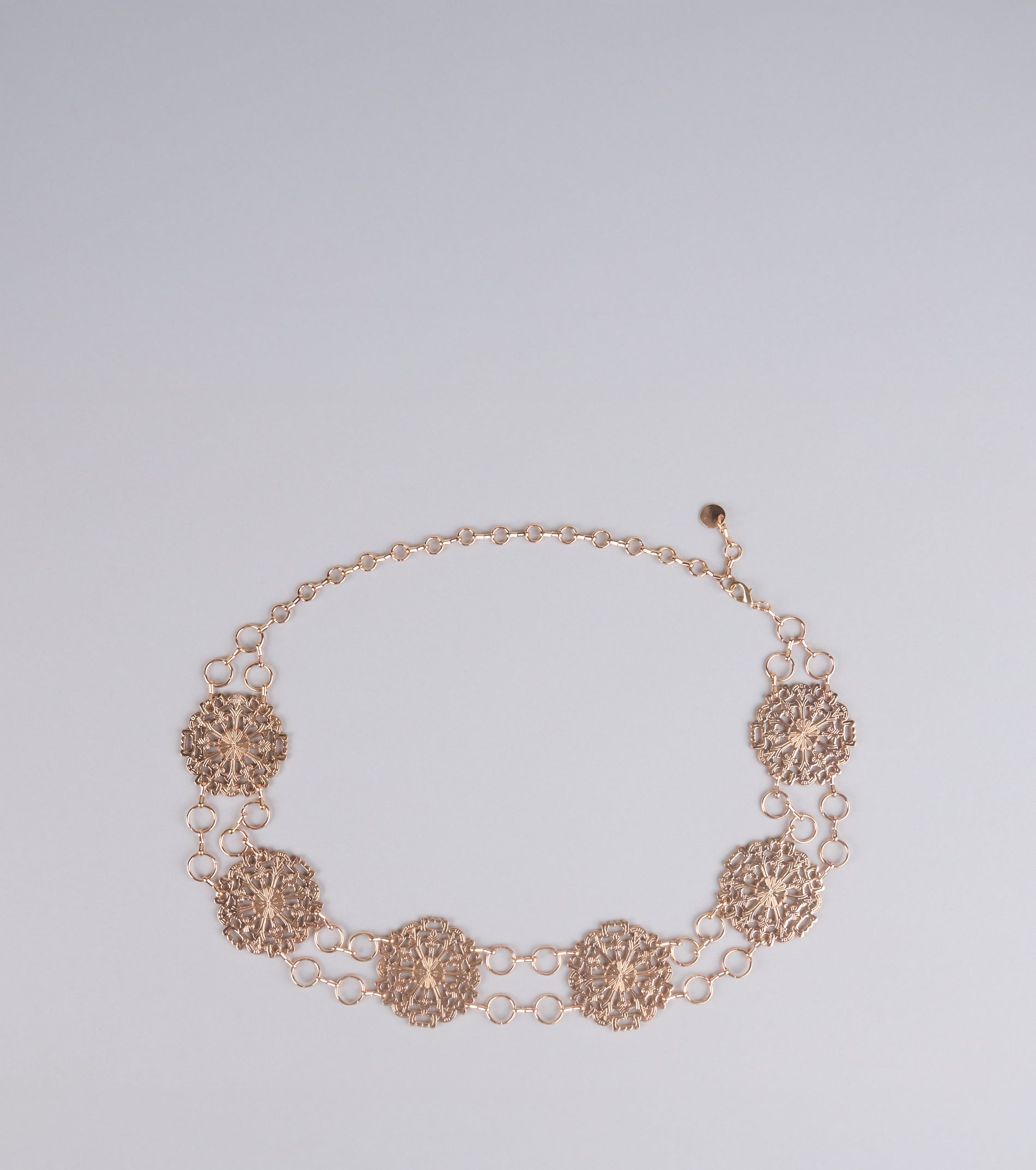 Intricately crafted conchos paired with a layered o-ring chain design. this belt adds a bold look that captivates attention effortlessly!