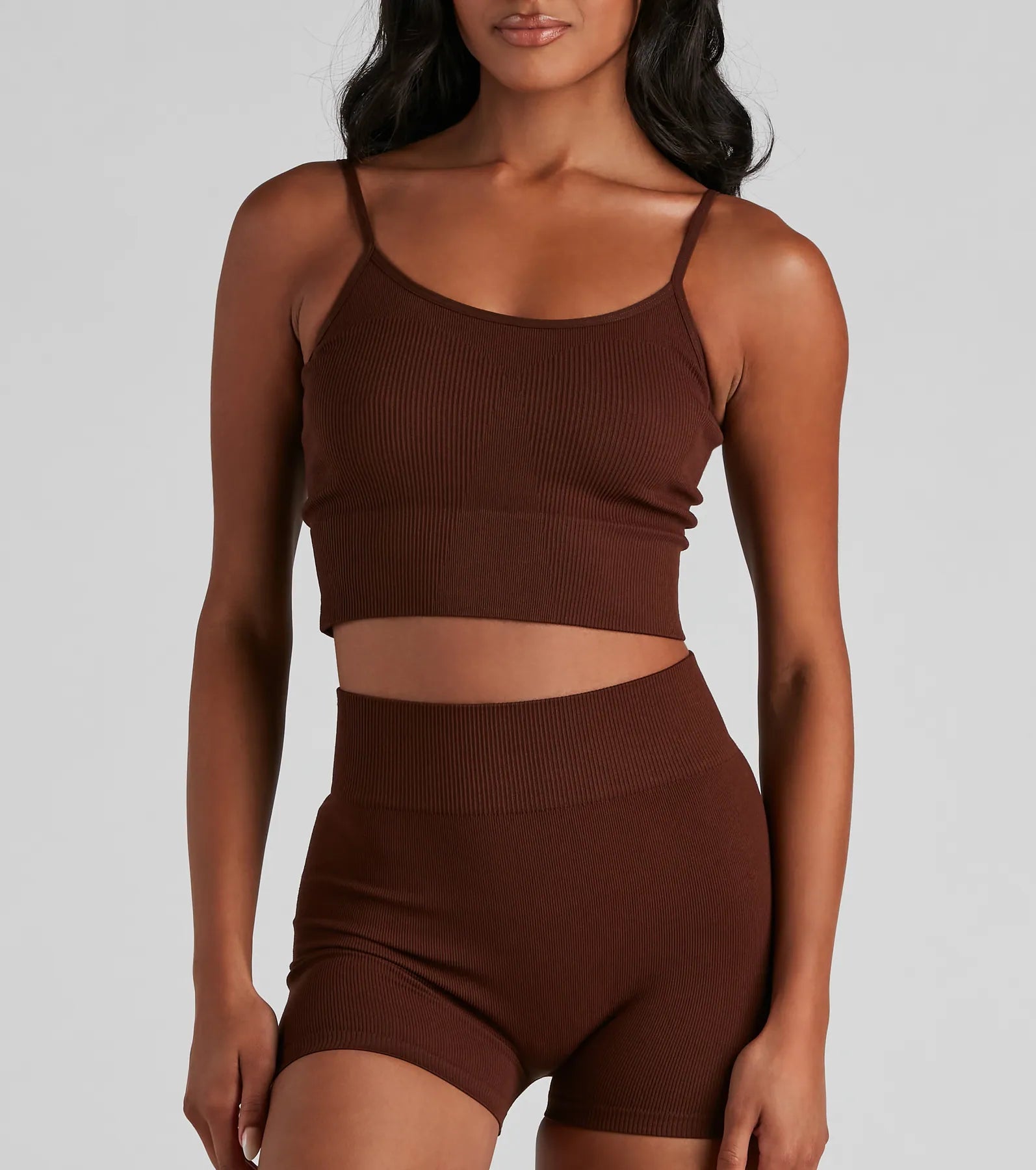 One go in this chic bralette and you’ll never want to take it off! It features a sleeveless. scoop neckline. adjustable spaghetti straps. and a longline banded hem. Crafted from a soft and comfortable ribbed knit seamless fabric. Style with the matching shorts.