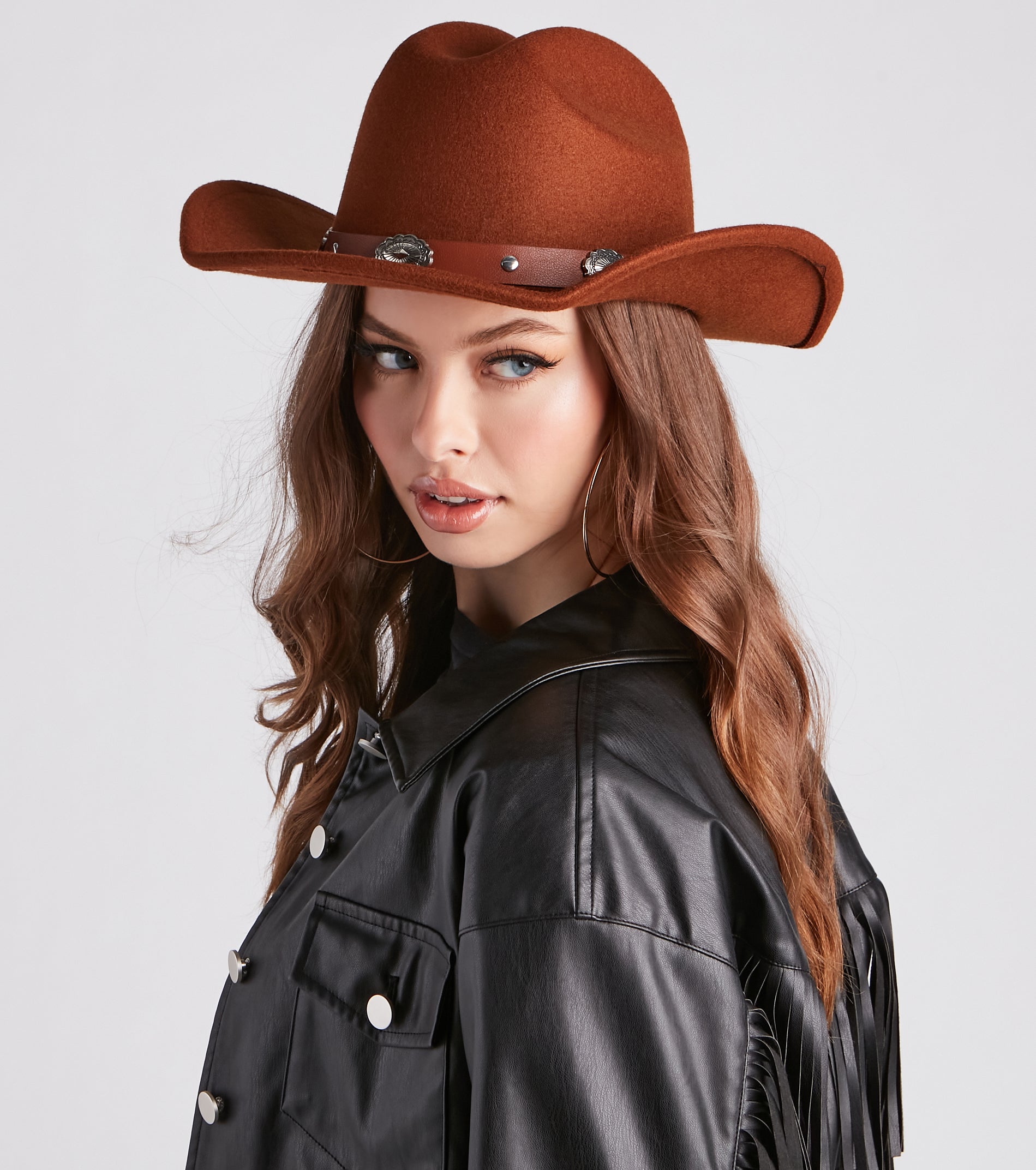 Look like a total rodeo babe in this trendy western trim faux wool cowboy hat. It features a structured top with a wide brim. an upturned side design. and a faux leather trim with studded details and engraved oval-shaped accents. Includes adjustable ties hidden on the inside for a tighter fit. Style with a and distressed jeans!