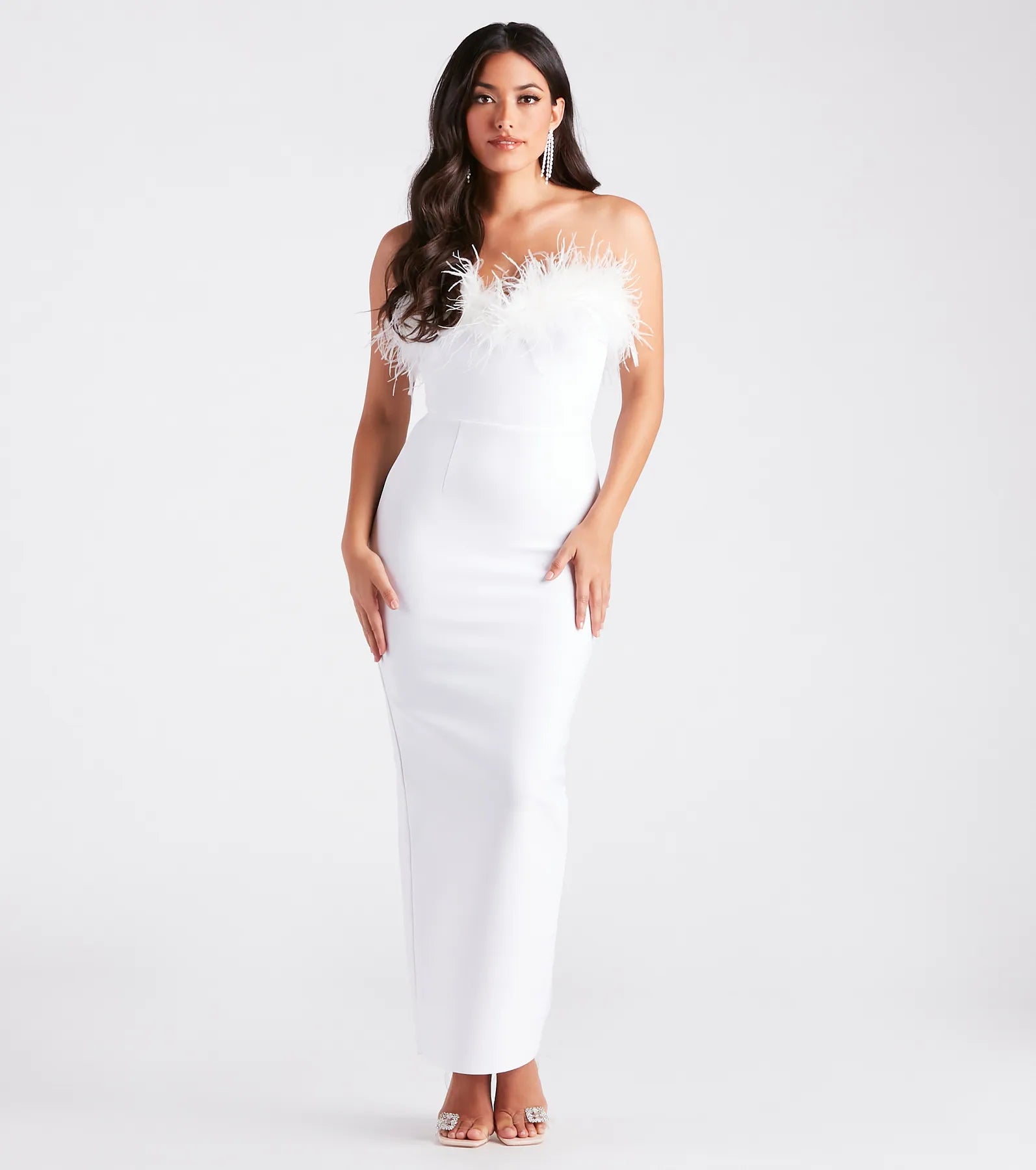 Show off a sexy silhouette in the stunningly chic Olivia formal marabou feather bandage dress! She features a strapless wired V-neckline with a fabulous marabou feather trim for a flirtatious flair. a flattering high waist seam. a hidden back zipper closure. and a long-length hem with an alluring back slit accent. The textured bandage knit fabric offers a curve-hugging fit for a smooth and sculpted look with plenty of stretch. Complete the outfit in this long dress with for your next black-tie affair.