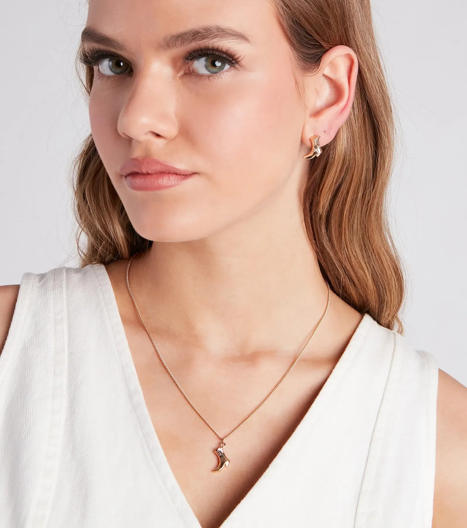 Get on that western trend with this adorable necklace and earrings set! It features a a dainty chain necklace with a single cowboy boot charm and matching cowboy boot stud earrings. Style with a for festival season!